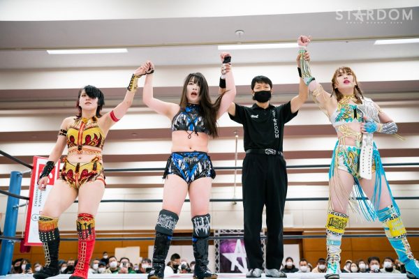 月山が手を差し出すがAZM、稲葉は応じずに試合がスタート。探り合いから手四つの構えで力比べ。ブレイクするとヘッドロックの数珠繋ぎ。ロープに振られたAZMが2人の足をすくってドロップキック。丸め込みの連続から月山が「OK、いくぞスターダム!」、稲葉が「同い年」とAZMに握手を求める。戸惑うAZMに2人が串刺し攻撃を試みるがAZMがまとめてドロップキック。AZMは月山にミサイルキックも稲葉がカバー。AZMがカットし、稲葉にブレーンバスターを狙う。月山がカットし稲葉に逆さ押さえ込み、そこをAZMがまとめて丸め込む。稲葉が月山とAZMの挟み撃ちを察知し正拳突き、AZMには二段蹴りを放つが、月山が倒してAZMにコンプリートショット。2人をロープ際に追いやると、ヒップアタックはAZMにのみヒット。かわした稲葉が腕十字へ。しかしAZMがダイビングフットスタンプでカットする。AZMは稲葉を挑発しエルボーの打ち合い。稲葉がミドルキックでAZMを倒すともう一発ミドル。かわしたAZMが投げっぱなしジャーマン。稲葉がサッカーボールキックも2カウント。稲葉が一撃必殺ともか蹴りにいくが、AZMがかわして丸め込みの連続。月山が2人まとめて丸め込むが2カウント。月山が突進すると稲葉が倒してAZMがサイドからドロップキック。AZMは稲葉に指示を送りダブルと見せかけ月山をロープに振る。かわした月山がオースイスープレックスから極楽ドン。しかしAZMがカットする。月山が丸め込むがAZMが返してドロップキック、ダイビングフットスタンプ。3カウントが入り、AZMが月山を破った。