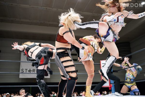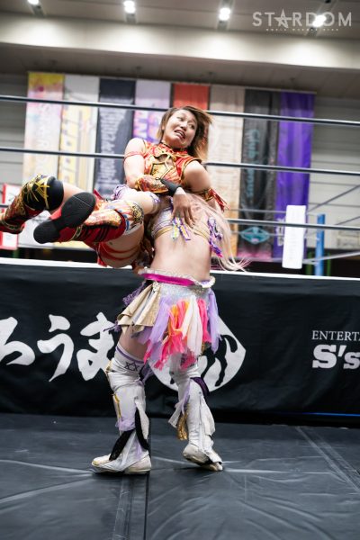 月山が「ゴリラさん」と飯田を指名。飯田は「テメエ勝てんのか!?」と月山を挑発し試合がスタート。探り合いから手四つで力比べ。月山が押し込もうとするが飯田はびくともせず簡単に押し倒す。飯田はヘッドロックで月山を走らせず。月山がロープに振るも飯田がショルダータックルで吹っ飛ばす。飯田が突進すると白川が乱入しドロップキック、HANAKOも加わりトリオでドロップキックを打ち込む。月山はヒップアタック連打。飯田が返すと、モンゴリアンチョップ連打からドロップキック。羽南が月山に襲いかかるとHANAKOがカットしクローズライン。しかし飯田も加わり羽南とジャンピングチョップの競演、さらに月山にエルボーアタックの挟み撃ち。羽南が月山にエルボー連打。月山がカウンターでクロスボディー。白川と岩谷が蹴りをかわし合うと白川がエルボー、岩谷が突進をかわしドロップキック、白川もやり返してドロップキックからコルバタ式河津落とし。HANAKOが岩谷にショルダータックル連打からアルゼンチン。コーナーに追い込むと串刺しボディーアタック。岩谷が返すとバックキック。白川がカットに入りHANAKOと合体を試みるが岩谷がまとめてアームホイップ。STARSが3方向で低空ドロップキックの競演、HANAKOに合体フェースクラッシャー、岩谷がフロッグスプラッシュ。しかし月山がカットする。岩谷はHANAKOを引き起こしフルネルソンの構え。白川がハイキックでカットしHANAKOがビッグブーツ、ブレーンバスター。HANAKOはフィニッシュを予告するが岩谷が丸め込む。HANAKOのビッグブーツを岩谷がかわすとトラースキックからジャーマン。HANAKOが返すと岩谷はフィニッシュを宣言しムーンサルトプレス。3カウントが入り、岩谷がHANAKOをフォールした。