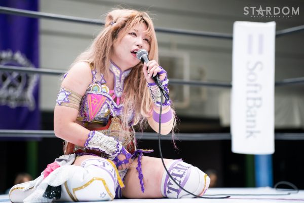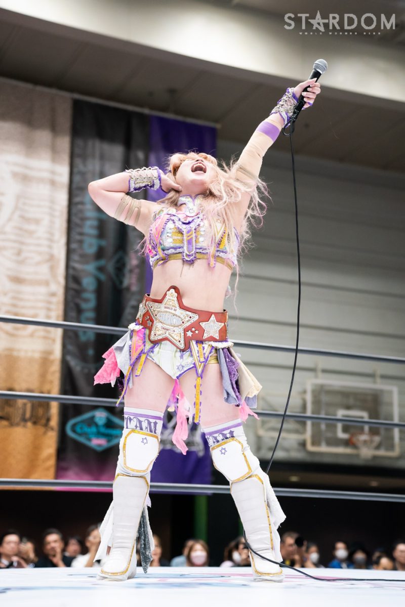 中野「宇宙のみなさん、そして大阪のみなさん、こんにちは! かわいいですか? ブスですか? ちょっと直す。最強の朱里から生まれて初めて勝ったぞー! 強すぎ。蹴っても蹴っても蘇ってくるから、怖かった。でも私は、朱里が大切に大切に育ててきた、この赤いベルト、赤いベルトのチャンピオンとして、2023年、5★STAR GP最終戦、なつぽいに絶対に勝って、今年こそ中野たむがアレします! いよいよ、9・30、5★STAR GP最終戦、優勝決定戦、長い長い長かった。私たちの生き様がここで集大成になります。私たちの生き様を最後まで、みなさん見届けに来てください! 約束ね。それじゃあいいですか? 宇宙にきらめくたむロードについてこい、ビリーブインたむ!」