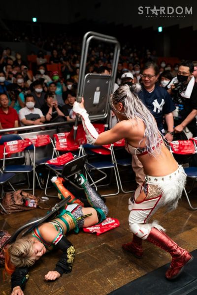 場内が暗転すると、謎の人物がリングに駆け込む。正体は、かつてスターダムのリングでも闘っていた元・アンドラス宮城ことGLEATのMICHIKO。MICHIKOはツームストーンパイルドライバーをジュリアに決める。