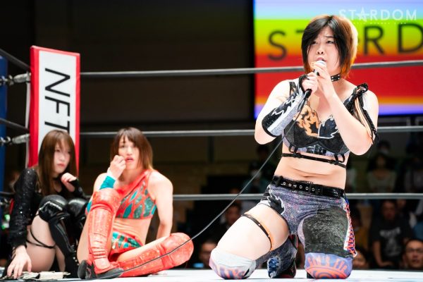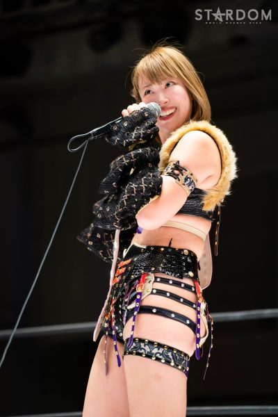 「なにから話せばいいんだろう…。壮麗、リング上で言った言葉すべて。またオマエがもっと強くなったら、もっともっと生意気になって、したらまたシングルマッチしようよ。そして、次の防衛戦はラスベガスだ。ハイアンっていう選手なのかな?なかなか 経歴もすごいようで、楽しみにしてる。10月28日、ラスベガス。それですっきり終わりたかったけど、あいつは、アンドラス宮城? なにをしにきたの? おまえは私がここに来たときに、私がスターダムから追放したヤツだろ? いまになってなにをしにきたの? 謎だね。何も言葉がない。GLEATがなんとかっていってたけど、私はそれだけじゃわかんねえよ。オマエとはGLEATできねえよ。意味わかんねえ。クソが」