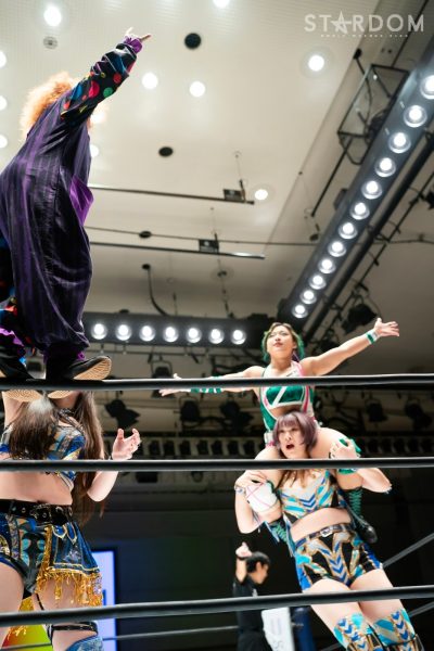 星来が「鹿島沙希!」とハイスピード王者を指名。星来のドロップキックをかわし鹿島が起死回生。星来が返すとロープに振り合い。どちらも振られず鹿島がロープをつかみロープブレイクを主張。星来が走ると鹿島が何往復も走らせる。メーガンが入り鹿島の前に仁王立ち。鹿島がタッチを求めるがMIRAIと朱里がリング下におりて赤コーナー側には誰もいない。メーガンが鹿島をコーナーに追い込んで逆水平。メーガンがカバーするとMIRAIと朱里がカット。星来が鹿島を捕まえると鹿島が隙をみて昇竜拳。コーナーに追い込むと「星来芽依倒すぞ!」と絶叫。向かっていくと思いきや朱里にタッチ。朱里が乱入してきた鈴季をコーナーに追い込み、MIRAIとともに次々と星来、鈴季に串刺し攻撃、星来にダブルのドロップキック。メーガンが入りMIRAIを担ぎ上げる。朱里がカットしようとするがメーガンがMIRAIを投げつける。星来が朱里にブレーンバスターの構え。朱里がしのいでラリアットも星来が何度もかいくぐりドロップキック。鈴季が朱里の背後からニーアタック連打。エルボーの打ち合いで鈴季が「5★STAR GP優勝者」を主張。朱里が怒ってサッカーボールキックを連打。朱里は嫌がる鹿島にタッチ。鹿島はキック一発でタッチしようとするがコーナーには誰もいない。鹿島は「この優勝者が!」とダイビングフットスタンプ。「優勝者投げるぞ」とダブルアームの構え。鈴季がかわして星来が丸め込み、鈴季がドロップキック、鈴季と星来でダブルのドロップキック。鈴季が鹿島にスライディングジャーマン。コーナーに上がるとMIRAIがカットしマットに叩きつける。鹿島がコーナーに上がるがメーガンがカットし担ぎ上げる。MIRAIがカットし朱里と合体。しかしメーガンがまとめてラリアット。メーガンは星来を場外に投げ捨てる。星来が鹿島をリングに戻すと鈴季がジャーマン狙い、切り返した鹿島が起死回生、鈴季が返して丸め込むと3カウントが入った。