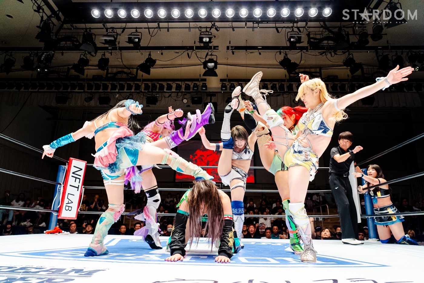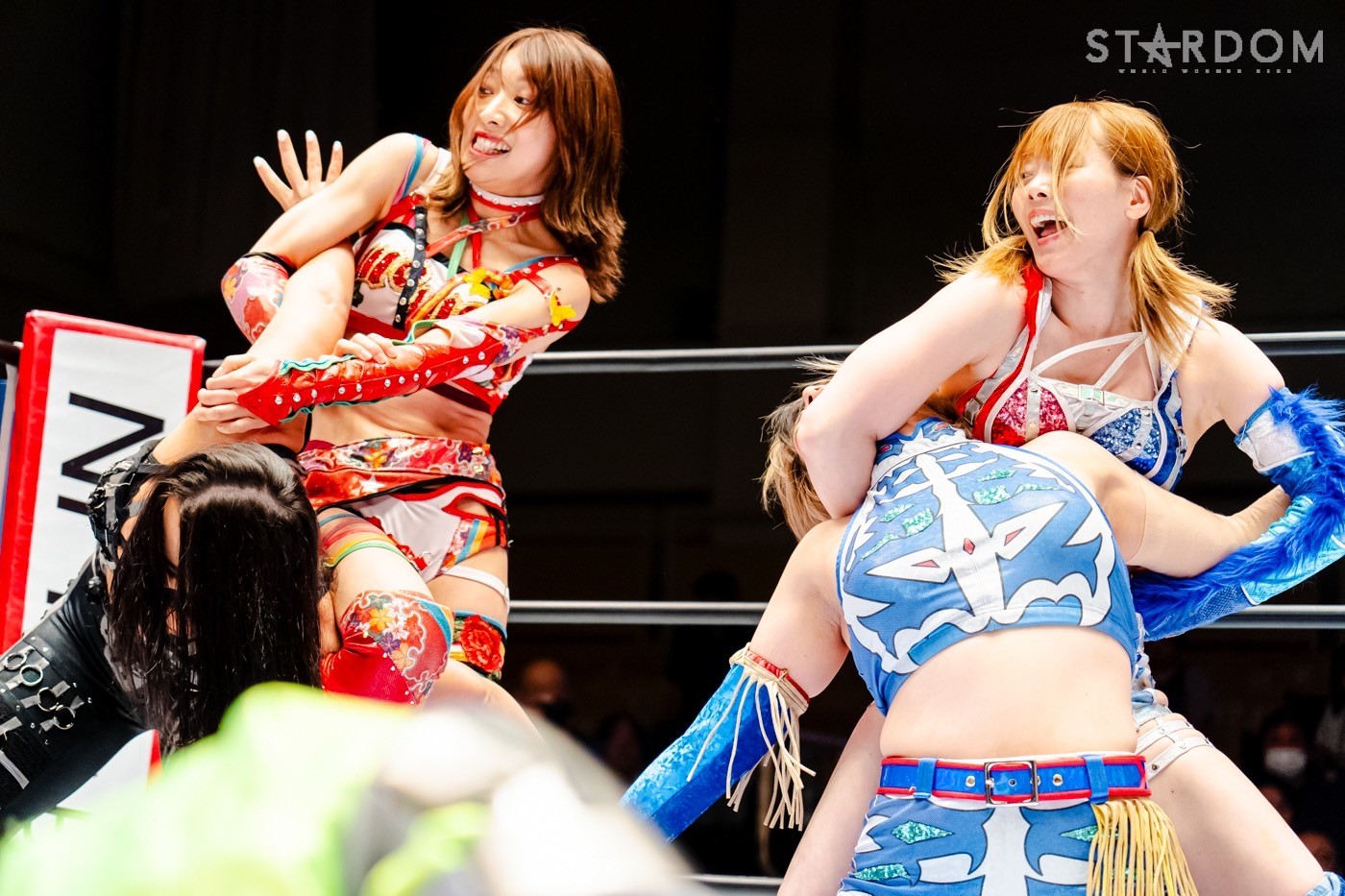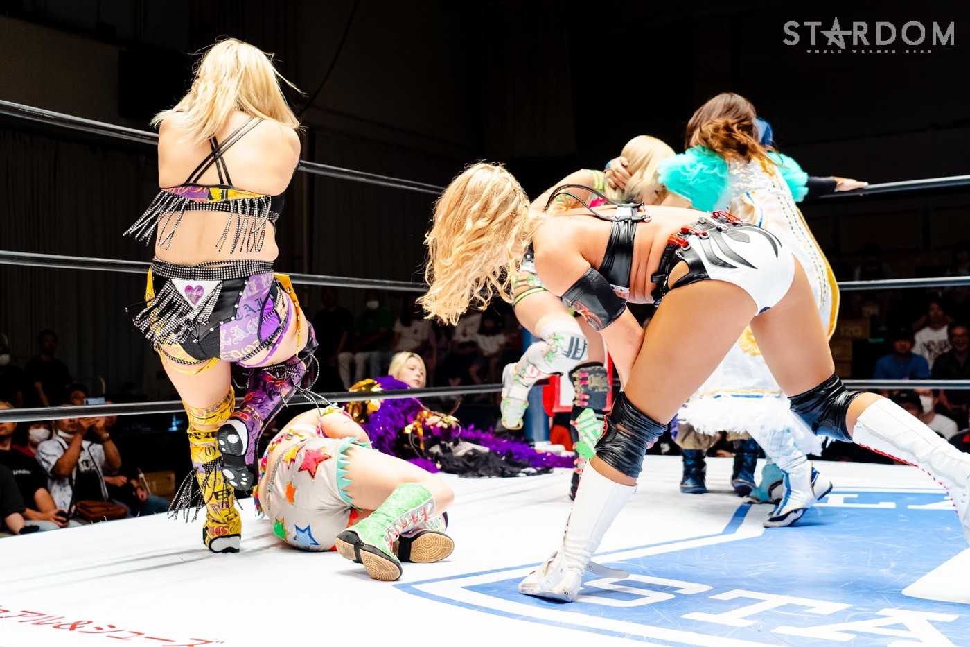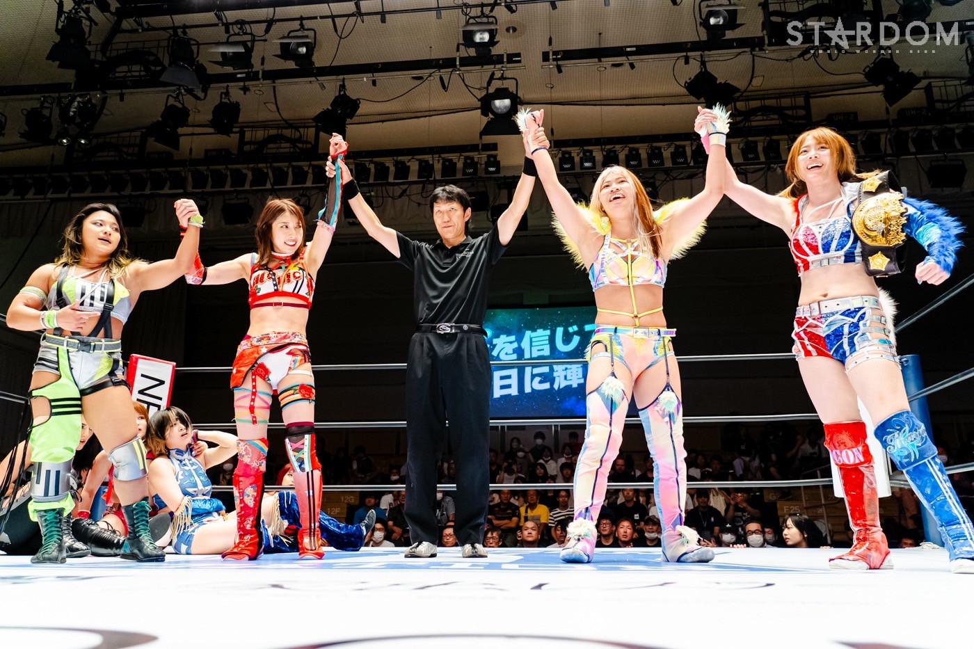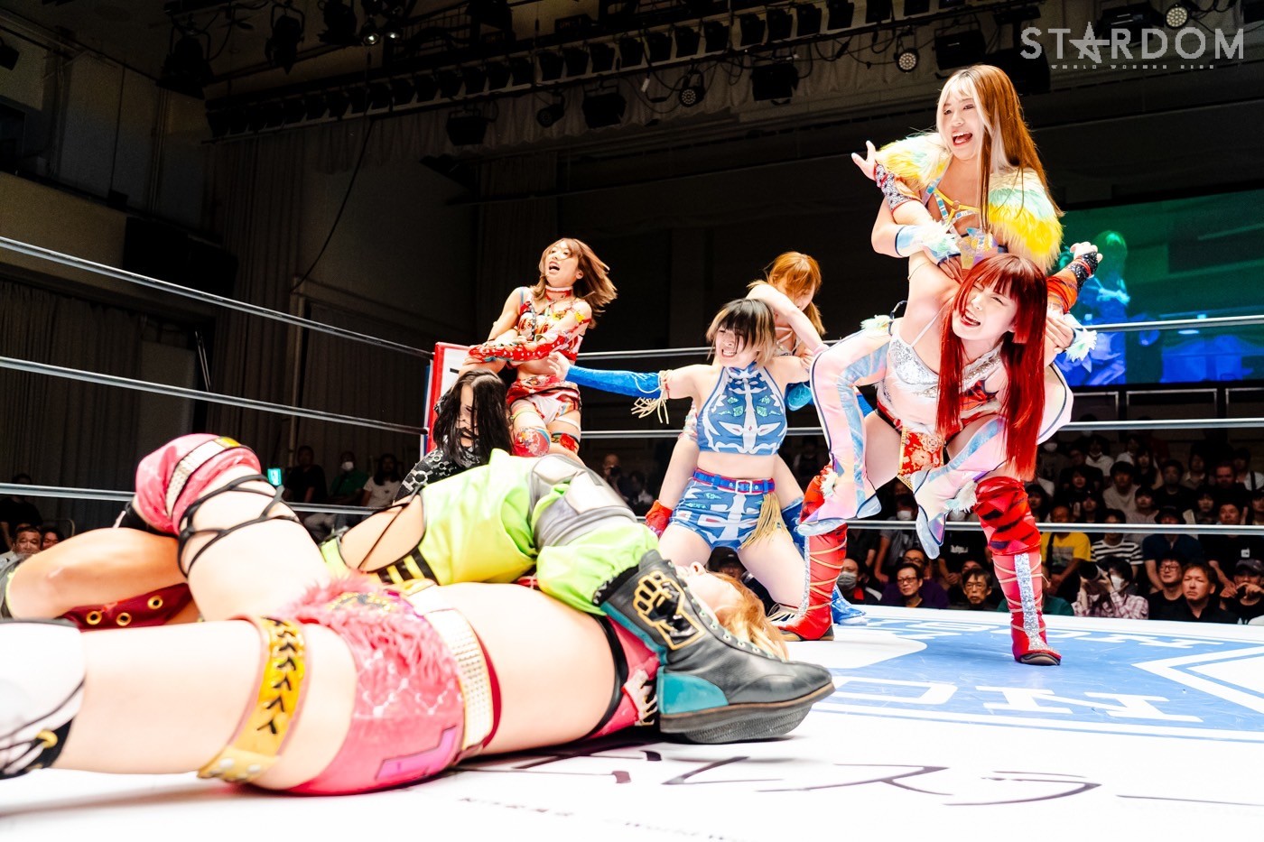月山と向後が先発に名乗りを挙げてゴング。ロックアップから月山がヘッドロック。ロープワークとなり月山のドロップキックを向後がかわす。アームホイップの応酬から向後がドロップキック。舞華が乱入し月山と串刺し攻撃の連続。月山は下がった舞華を呼び込むが応じられず。HANAKOも入らず、月山は一人で向後にヒップアタック連打。向後がアームホイップからドロップキック。岩谷が入るとSTARSが合体し、月山を攻撃。岩谷が月山にボディースラム、サッカーボールキック、逆エビ固め。月山がエスケープすると、岩谷がロープに固定。替わった飯田が背中にチョップの連打を叩き込む。飯田が関節技を決めるとSTARSがEXVのカットを阻止。月山がエスケープしエルボー連打。飯田が受けて立ち一発で倒す。月山がドロップキックを放ちジーナに託す。ジーナは飯田にドロップキック。岩谷がカットし飯田と合体。ジーナがまとめてネックブリーカー。飯田が返すと、両者手を後ろで組んでチョップの打ち合い。飯田が連打もジーナが足を引いて走らせず、チョップから担ぎ上げる。飯田が切り返して逆水平。羽南が後方からニーアタック、ドロップキック。ジーナが羽南にトラースキック、ラリアット。HANAKOが羽南にショルダータックル、エルボー。月山と合体しクローズライン。羽南がかわすが月山とHANAKOが合体。月山を叩きつけHANAKOがカバー。羽南が返すとカウンターの巴投げから腕十字。飯田がカットして羽南と合体もショルダータックルで吹っ飛ばされる。HANAKOは向後を担ぎ上げ岩谷に投げつける。HANAKOは羽南を引き起こしブレーンバスター、アルゼンチン狙い。羽南が切り返し丸め込む。舞華とHANAKOが合体で羽南を叩きつけるもSTARSがカット。HANAKOはもう一度羽南へアルゼンチン。羽南が切り返すとSTARSが連係で分断。HANAKOを孤立させ、合体フェースクラッシャー。羽南がバックドロップでそのままホールド。HANAKOが返せず3カウントが入った。試合後、飯田と羽南がNEW BLOODタッグのベルトを月山とHANAKOに誇示してみせた。