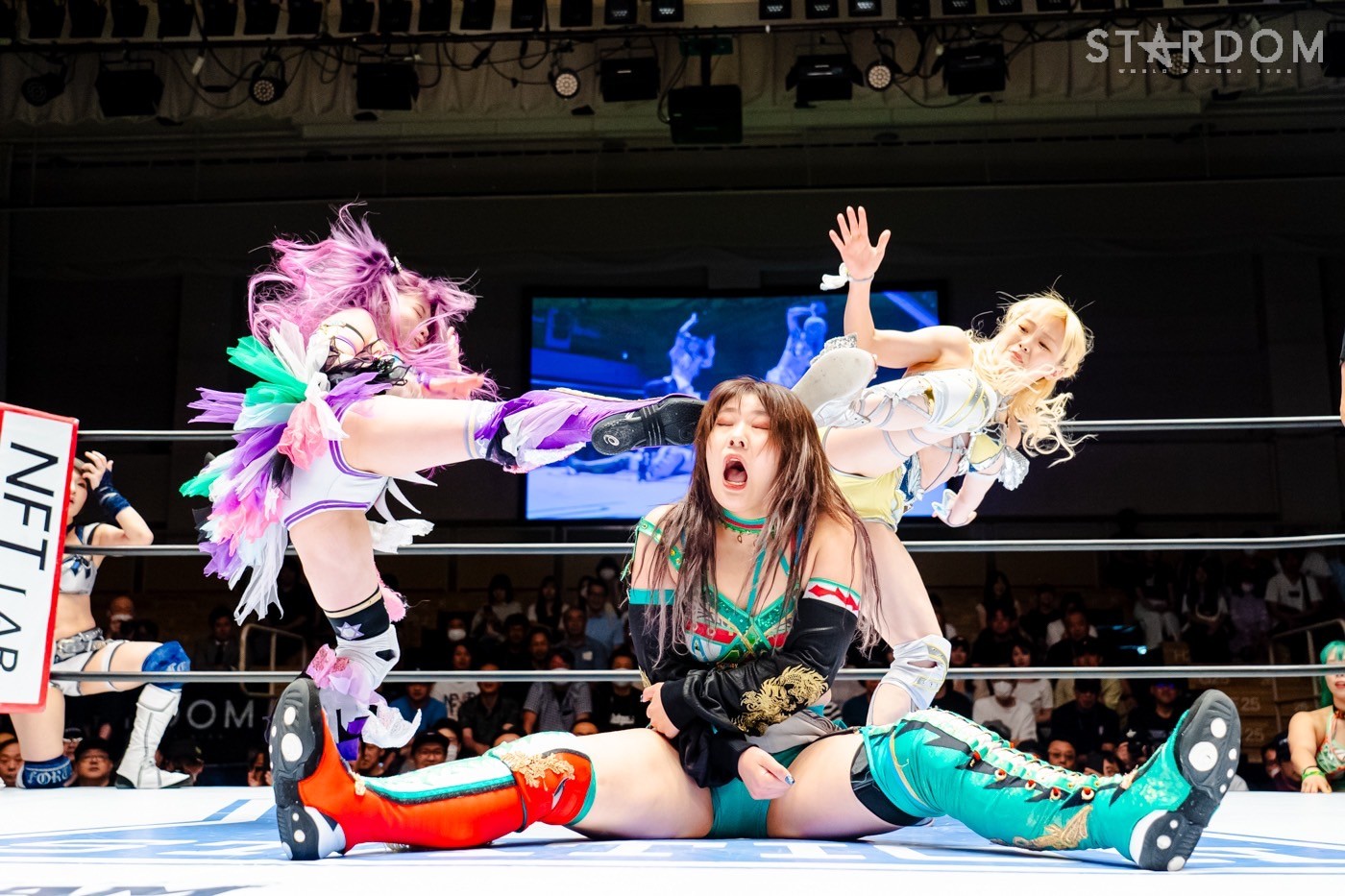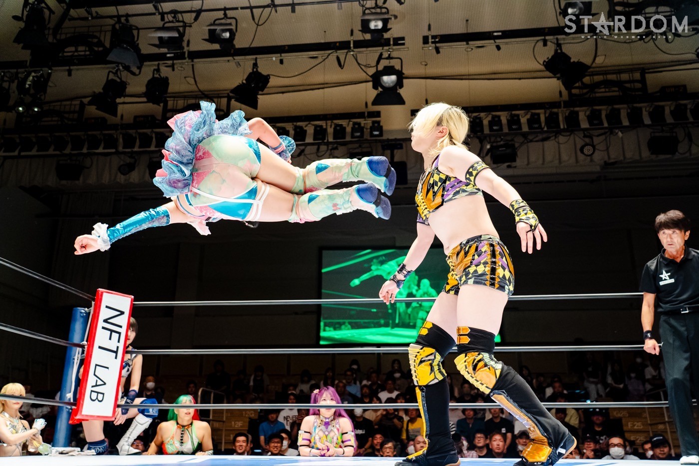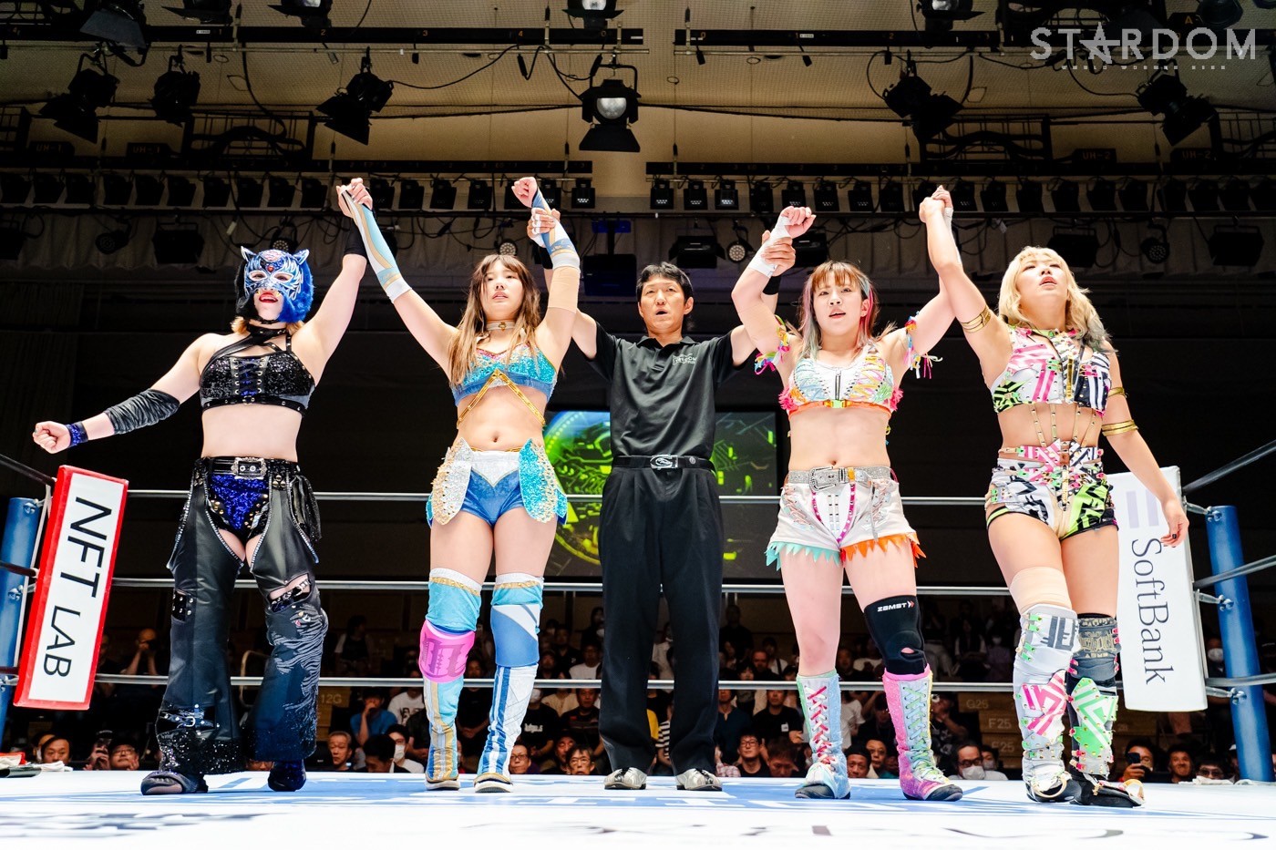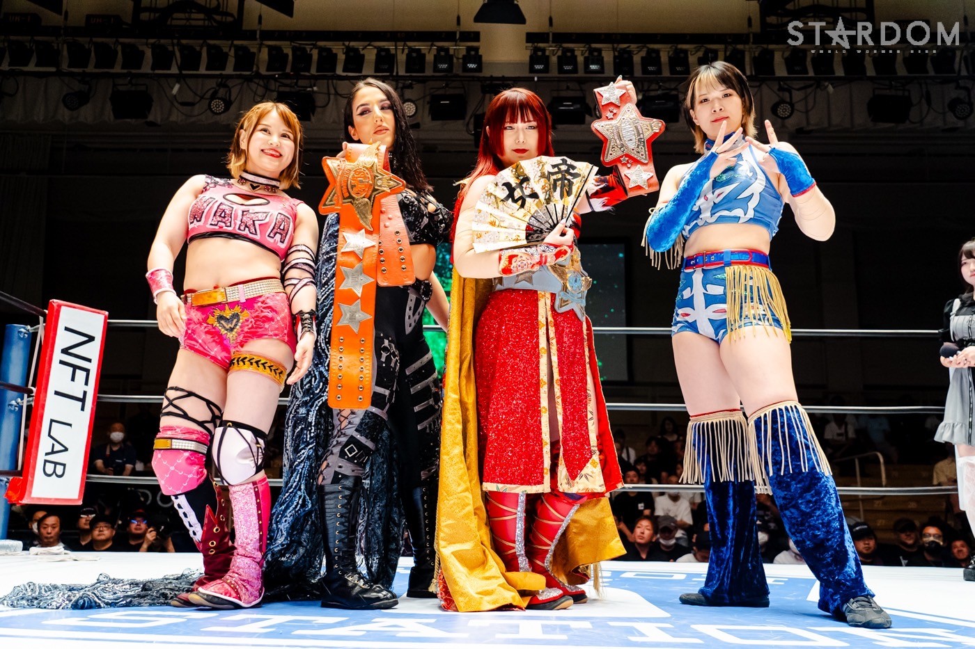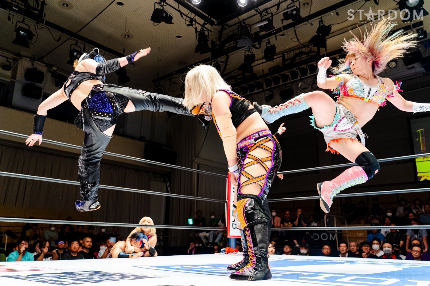 月山と向後が先発に名乗りを挙げてゴング。ロックアップから月山がヘッドロック。ロープワークとなり月山のドロップキックを向後がかわす。アームホイップの応酬から向後がドロップキック。舞華が乱入し月山と串刺し攻撃の連続。月山は下がった舞華を呼び込むが応じられず。HANAKOも入らず、月山は一人で向後にヒップアタック連打。向後がアームホイップからドロップキック。岩谷が入るとSTARSが合体し、月山を攻撃。岩谷が月山にボディースラム、サッカーボールキック、逆エビ固め。月山がエスケープすると、岩谷がロープに固定。替わった飯田が背中にチョップの連打を叩き込む。飯田が関節技を決めるとSTARSがEXVのカットを阻止。月山がエスケープしエルボー連打。飯田が受けて立ち一発で倒す。月山がドロップキックを放ちジーナに託す。ジーナは飯田にドロップキック。岩谷がカットし飯田と合体。ジーナがまとめてネックブリーカー。飯田が返すと、両者手を後ろで組んでチョップの打ち合い。飯田が連打もジーナが足を引いて走らせず、チョップから担ぎ上げる。飯田が切り返して逆水平。羽南が後方からニーアタック、ドロップキック。ジーナが羽南にトラースキック、ラリアット。HANAKOが羽南にショルダータックル、エルボー。月山と合体しクローズライン。羽南がかわすが月山とHANAKOが合体。月山を叩きつけHANAKOがカバー。羽南が返すとカウンターの巴投げから腕十字。飯田がカットして羽南と合体もショルダータックルで吹っ飛ばされる。HANAKOは向後を担ぎ上げ岩谷に投げつける。HANAKOは羽南を引き起こしブレーンバスター、アルゼンチン狙い。羽南が切り返し丸め込む。舞華とHANAKOが合体で羽南を叩きつけるもSTARSがカット。HANAKOはもう一度羽南へアルゼンチン。羽南が切り返すとSTARSが連係で分断。HANAKOを孤立させ、合体フェースクラッシャー。羽南がバックドロップでそのままホールド。HANAKOが返せず3カウントが入った。試合後、飯田と羽南がNEW BLOODタッグのベルトを月山とHANAKOに誇示してみせた。