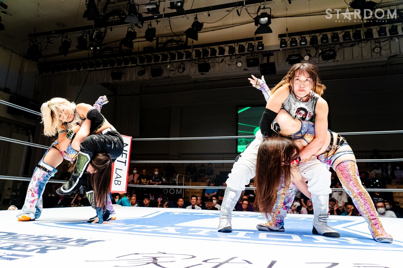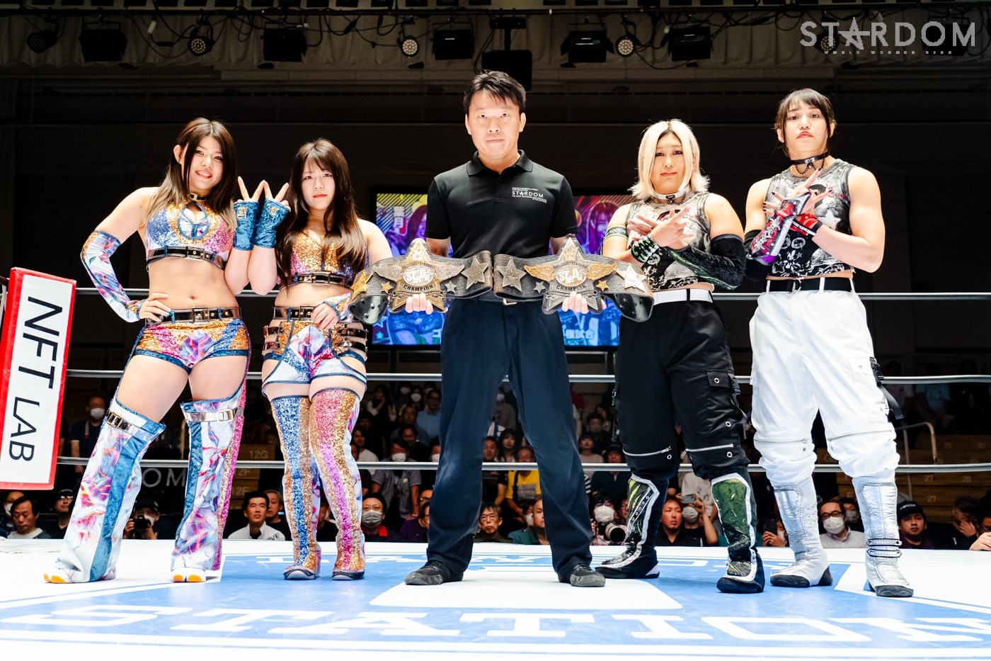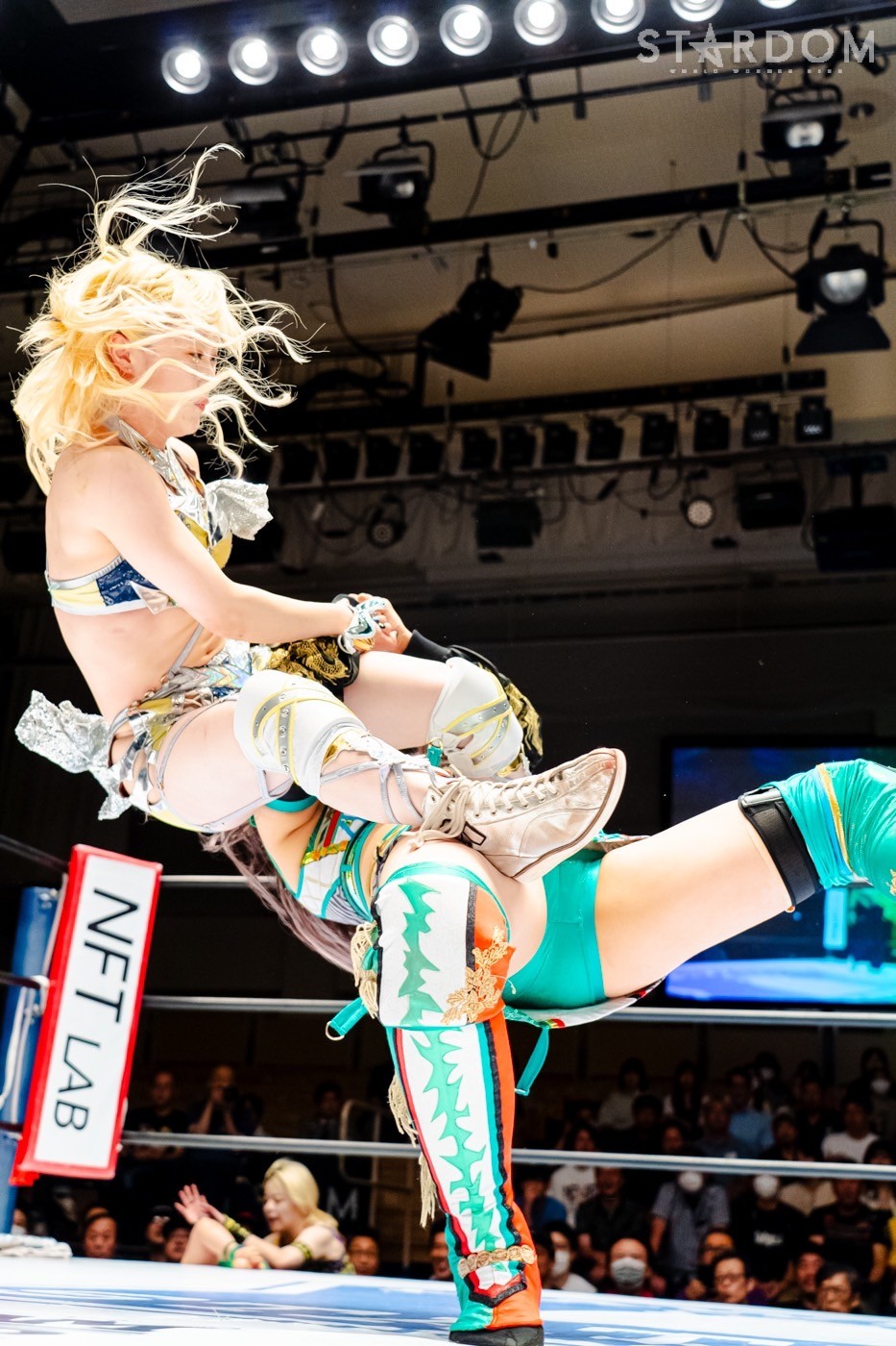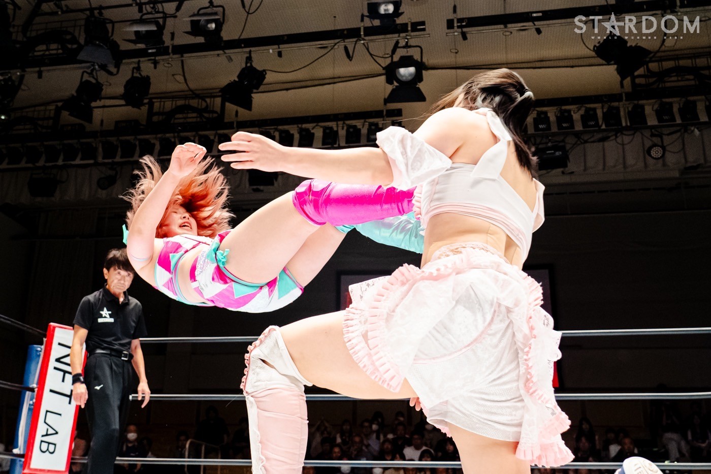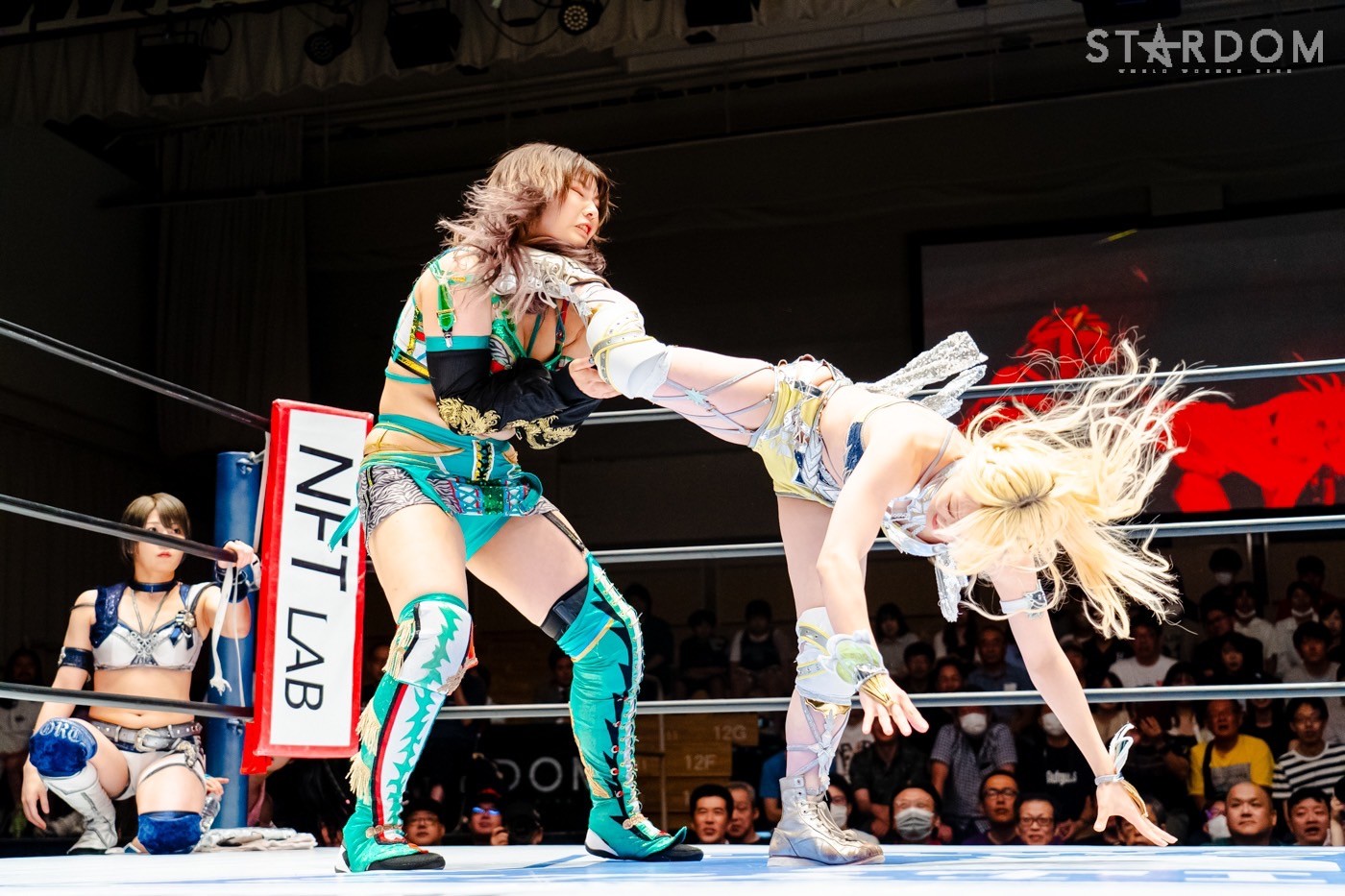 月山と向後が先発に名乗りを挙げてゴング。ロックアップから月山がヘッドロック。ロープワークとなり月山のドロップキックを向後がかわす。アームホイップの応酬から向後がドロップキック。舞華が乱入し月山と串刺し攻撃の連続。月山は下がった舞華を呼び込むが応じられず。HANAKOも入らず、月山は一人で向後にヒップアタック連打。向後がアームホイップからドロップキック。岩谷が入るとSTARSが合体し、月山を攻撃。岩谷が月山にボディースラム、サッカーボールキック、逆エビ固め。月山がエスケープすると、岩谷がロープに固定。替わった飯田が背中にチョップの連打を叩き込む。飯田が関節技を決めるとSTARSがEXVのカットを阻止。月山がエスケープしエルボー連打。飯田が受けて立ち一発で倒す。月山がドロップキックを放ちジーナに託す。ジーナは飯田にドロップキック。岩谷がカットし飯田と合体。ジーナがまとめてネックブリーカー。飯田が返すと、両者手を後ろで組んでチョップの打ち合い。飯田が連打もジーナが足を引いて走らせず、チョップから担ぎ上げる。飯田が切り返して逆水平。羽南が後方からニーアタック、ドロップキック。ジーナが羽南にトラースキック、ラリアット。HANAKOが羽南にショルダータックル、エルボー。月山と合体しクローズライン。羽南がかわすが月山とHANAKOが合体。月山を叩きつけHANAKOがカバー。羽南が返すとカウンターの巴投げから腕十字。飯田がカットして羽南と合体もショルダータックルで吹っ飛ばされる。HANAKOは向後を担ぎ上げ岩谷に投げつける。HANAKOは羽南を引き起こしブレーンバスター、アルゼンチン狙い。羽南が切り返し丸め込む。舞華とHANAKOが合体で羽南を叩きつけるもSTARSがカット。HANAKOはもう一度羽南へアルゼンチン。羽南が切り返すとSTARSが連係で分断。HANAKOを孤立させ、合体フェースクラッシャー。羽南がバックドロップでそのままホールド。HANAKOが返せず3カウントが入った。試合後、飯田と羽南がNEW BLOODタッグのベルトを月山とHANAKOに誇示してみせた。