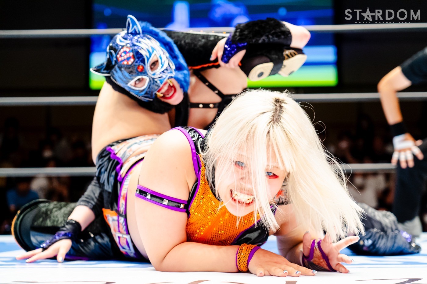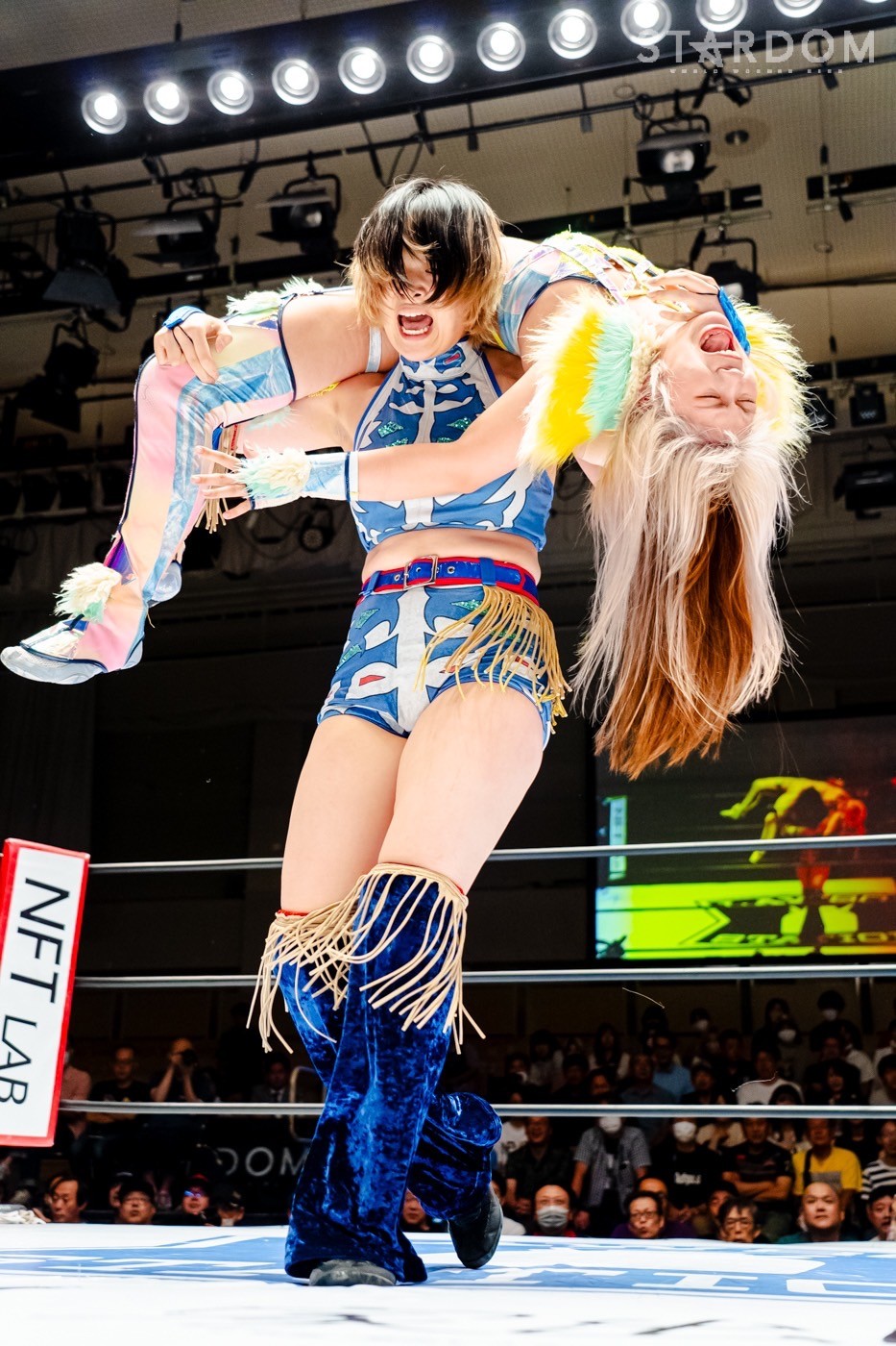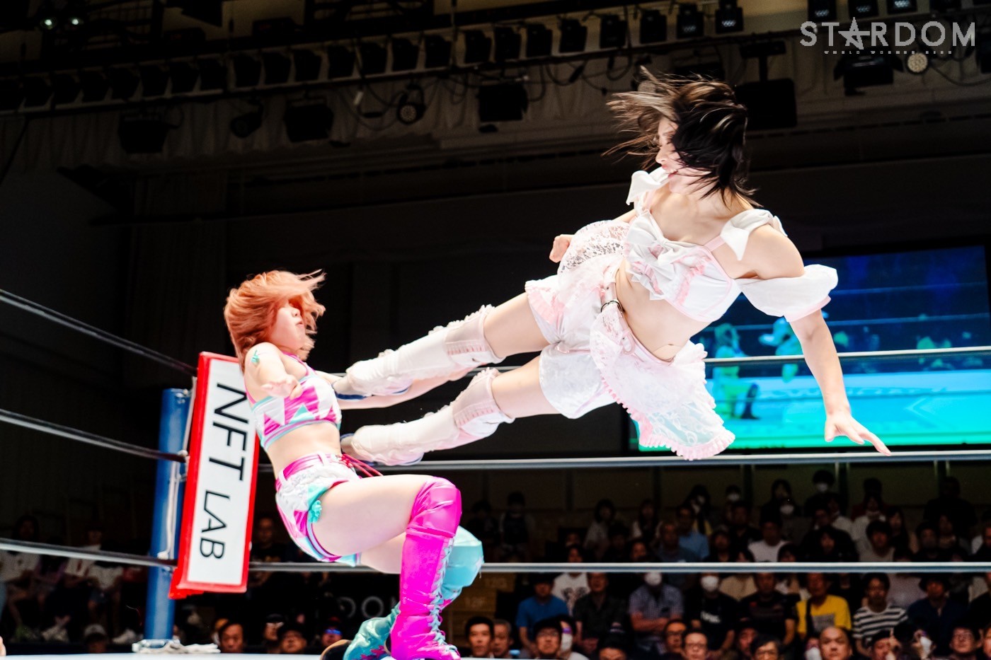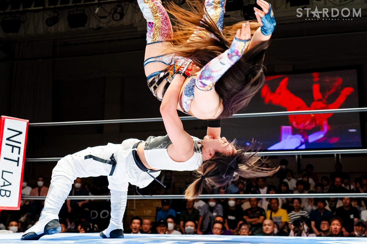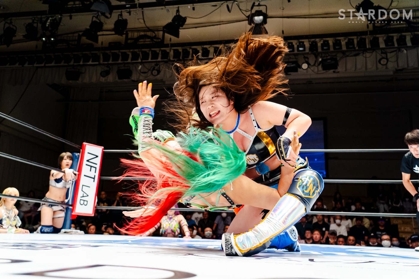 月山と向後が先発に名乗りを挙げてゴング。ロックアップから月山がヘッドロック。ロープワークとなり月山のドロップキックを向後がかわす。アームホイップの応酬から向後がドロップキック。舞華が乱入し月山と串刺し攻撃の連続。月山は下がった舞華を呼び込むが応じられず。HANAKOも入らず、月山は一人で向後にヒップアタック連打。向後がアームホイップからドロップキック。岩谷が入るとSTARSが合体し、月山を攻撃。岩谷が月山にボディースラム、サッカーボールキック、逆エビ固め。月山がエスケープすると、岩谷がロープに固定。替わった飯田が背中にチョップの連打を叩き込む。飯田が関節技を決めるとSTARSがEXVのカットを阻止。月山がエスケープしエルボー連打。飯田が受けて立ち一発で倒す。月山がドロップキックを放ちジーナに託す。ジーナは飯田にドロップキック。岩谷がカットし飯田と合体。ジーナがまとめてネックブリーカー。飯田が返すと、両者手を後ろで組んでチョップの打ち合い。飯田が連打もジーナが足を引いて走らせず、チョップから担ぎ上げる。飯田が切り返して逆水平。羽南が後方からニーアタック、ドロップキック。ジーナが羽南にトラースキック、ラリアット。HANAKOが羽南にショルダータックル、エルボー。月山と合体しクローズライン。羽南がかわすが月山とHANAKOが合体。月山を叩きつけHANAKOがカバー。羽南が返すとカウンターの巴投げから腕十字。飯田がカットして羽南と合体もショルダータックルで吹っ飛ばされる。HANAKOは向後を担ぎ上げ岩谷に投げつける。HANAKOは羽南を引き起こしブレーンバスター、アルゼンチン狙い。羽南が切り返し丸め込む。舞華とHANAKOが合体で羽南を叩きつけるもSTARSがカット。HANAKOはもう一度羽南へアルゼンチン。羽南が切り返すとSTARSが連係で分断。HANAKOを孤立させ、合体フェースクラッシャー。羽南がバックドロップでそのままホールド。HANAKOが返せず3カウントが入った。試合後、飯田と羽南がNEW BLOODタッグのベルトを月山とHANAKOに誇示してみせた。