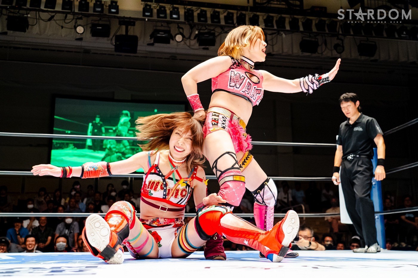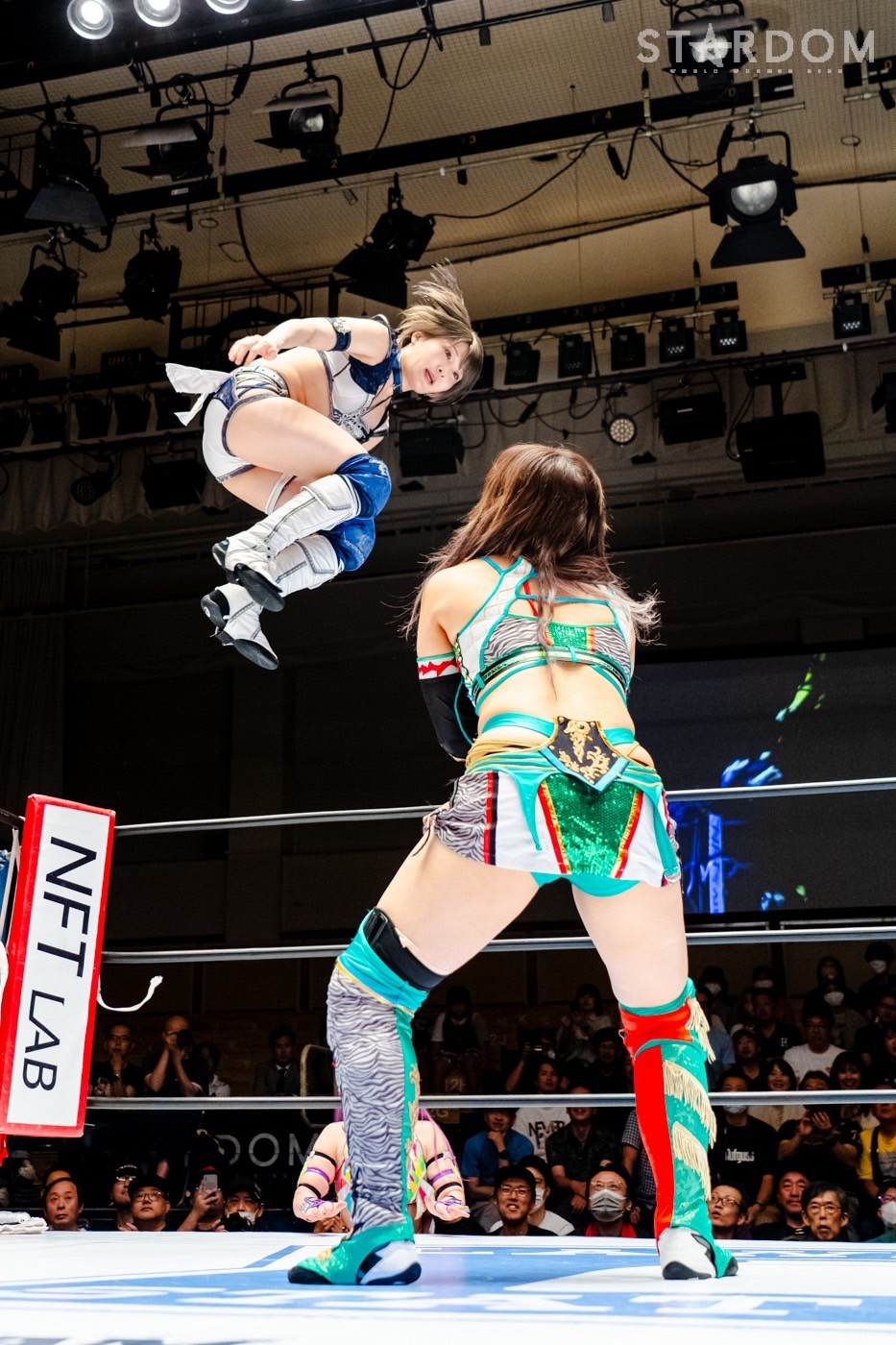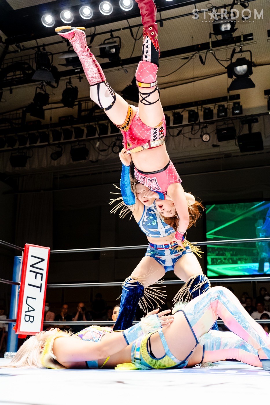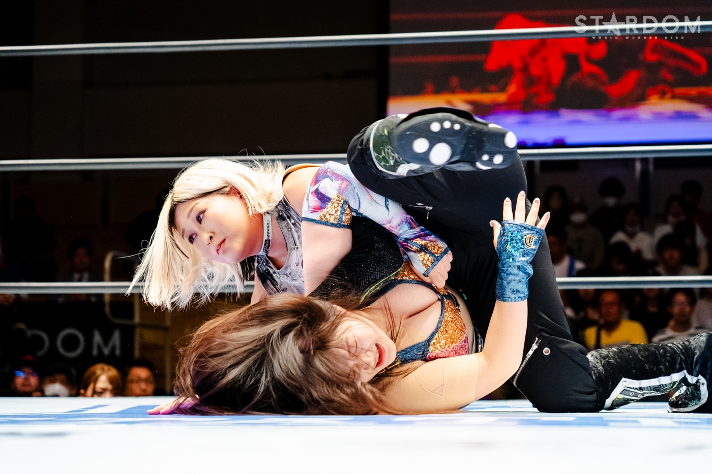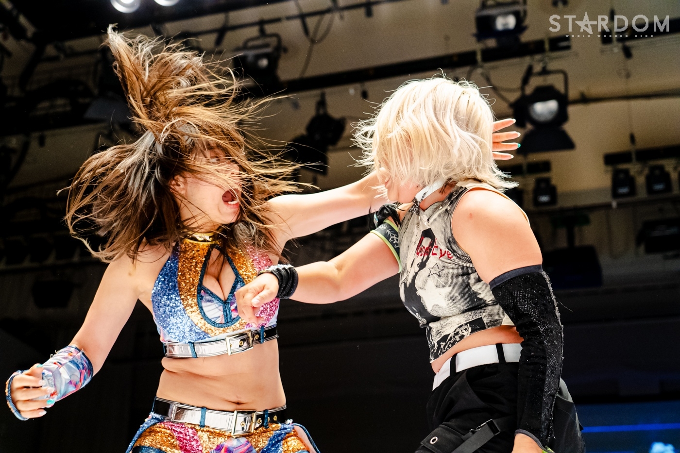 月山と向後が先発に名乗りを挙げてゴング。ロックアップから月山がヘッドロック。ロープワークとなり月山のドロップキックを向後がかわす。アームホイップの応酬から向後がドロップキック。舞華が乱入し月山と串刺し攻撃の連続。月山は下がった舞華を呼び込むが応じられず。HANAKOも入らず、月山は一人で向後にヒップアタック連打。向後がアームホイップからドロップキック。岩谷が入るとSTARSが合体し、月山を攻撃。岩谷が月山にボディースラム、サッカーボールキック、逆エビ固め。月山がエスケープすると、岩谷がロープに固定。替わった飯田が背中にチョップの連打を叩き込む。飯田が関節技を決めるとSTARSがEXVのカットを阻止。月山がエスケープしエルボー連打。飯田が受けて立ち一発で倒す。月山がドロップキックを放ちジーナに託す。ジーナは飯田にドロップキック。岩谷がカットし飯田と合体。ジーナがまとめてネックブリーカー。飯田が返すと、両者手を後ろで組んでチョップの打ち合い。飯田が連打もジーナが足を引いて走らせず、チョップから担ぎ上げる。飯田が切り返して逆水平。羽南が後方からニーアタック、ドロップキック。ジーナが羽南にトラースキック、ラリアット。HANAKOが羽南にショルダータックル、エルボー。月山と合体しクローズライン。羽南がかわすが月山とHANAKOが合体。月山を叩きつけHANAKOがカバー。羽南が返すとカウンターの巴投げから腕十字。飯田がカットして羽南と合体もショルダータックルで吹っ飛ばされる。HANAKOは向後を担ぎ上げ岩谷に投げつける。HANAKOは羽南を引き起こしブレーンバスター、アルゼンチン狙い。羽南が切り返し丸め込む。舞華とHANAKOが合体で羽南を叩きつけるもSTARSがカット。HANAKOはもう一度羽南へアルゼンチン。羽南が切り返すとSTARSが連係で分断。HANAKOを孤立させ、合体フェースクラッシャー。羽南がバックドロップでそのままホールド。HANAKOが返せず3カウントが入った。試合後、飯田と羽南がNEW BLOODタッグのベルトを月山とHANAKOに誇示してみせた。