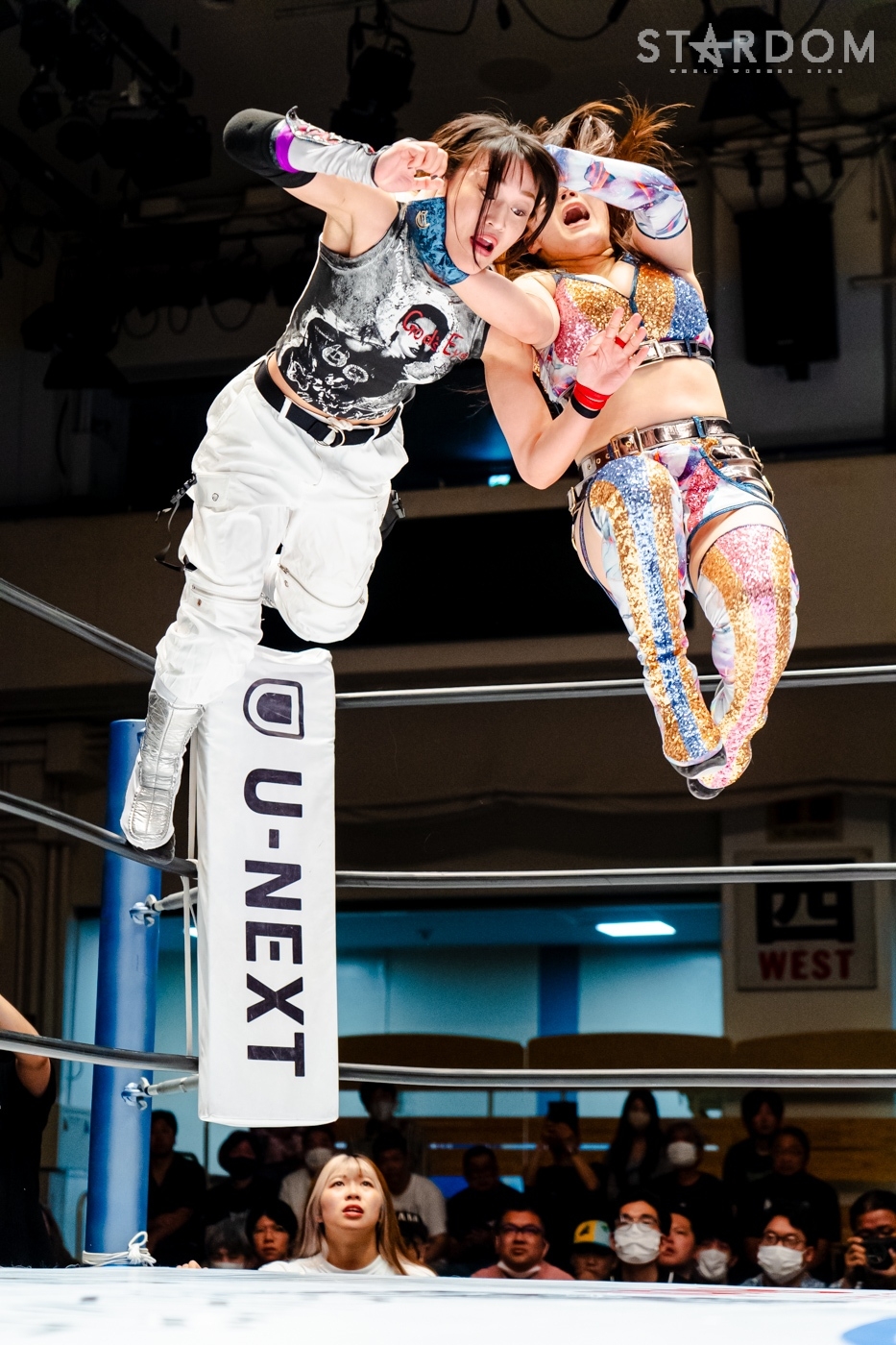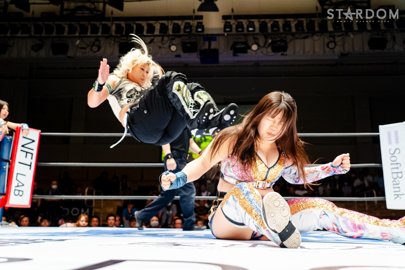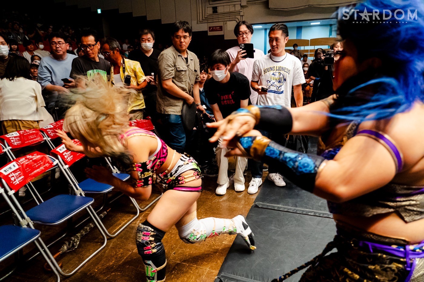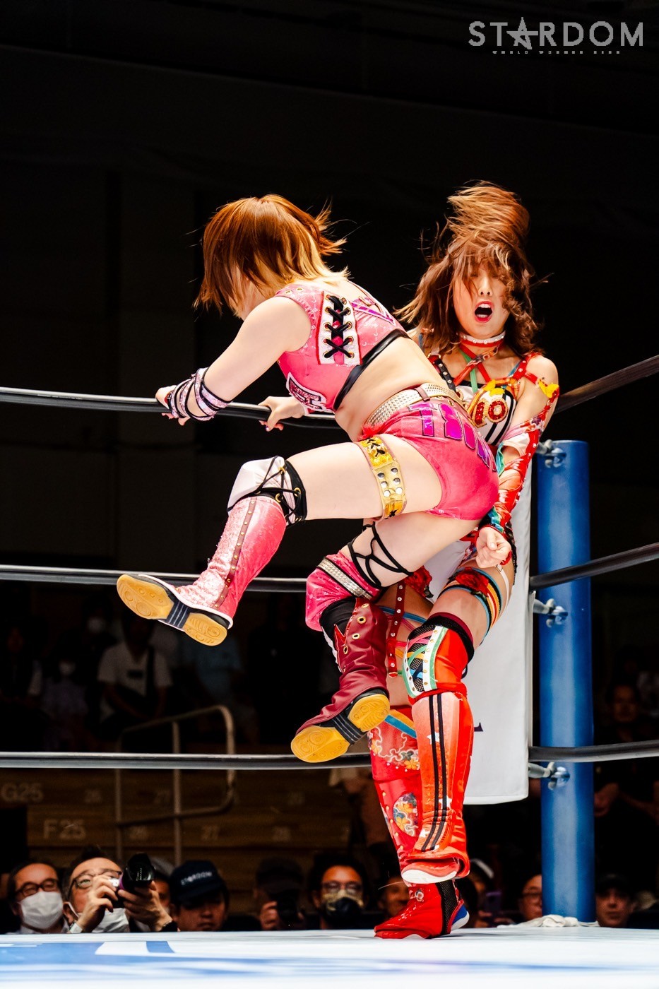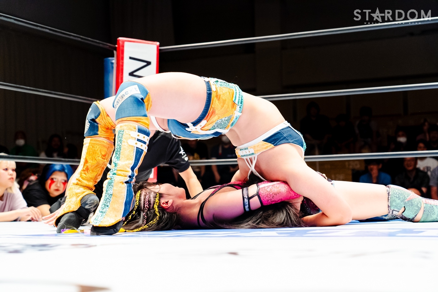 月山と向後が先発に名乗りを挙げてゴング。ロックアップから月山がヘッドロック。ロープワークとなり月山のドロップキックを向後がかわす。アームホイップの応酬から向後がドロップキック。舞華が乱入し月山と串刺し攻撃の連続。月山は下がった舞華を呼び込むが応じられず。HANAKOも入らず、月山は一人で向後にヒップアタック連打。向後がアームホイップからドロップキック。岩谷が入るとSTARSが合体し、月山を攻撃。岩谷が月山にボディースラム、サッカーボールキック、逆エビ固め。月山がエスケープすると、岩谷がロープに固定。替わった飯田が背中にチョップの連打を叩き込む。飯田が関節技を決めるとSTARSがEXVのカットを阻止。月山がエスケープしエルボー連打。飯田が受けて立ち一発で倒す。月山がドロップキックを放ちジーナに託す。ジーナは飯田にドロップキック。岩谷がカットし飯田と合体。ジーナがまとめてネックブリーカー。飯田が返すと、両者手を後ろで組んでチョップの打ち合い。飯田が連打もジーナが足を引いて走らせず、チョップから担ぎ上げる。飯田が切り返して逆水平。羽南が後方からニーアタック、ドロップキック。ジーナが羽南にトラースキック、ラリアット。HANAKOが羽南にショルダータックル、エルボー。月山と合体しクローズライン。羽南がかわすが月山とHANAKOが合体。月山を叩きつけHANAKOがカバー。羽南が返すとカウンターの巴投げから腕十字。飯田がカットして羽南と合体もショルダータックルで吹っ飛ばされる。HANAKOは向後を担ぎ上げ岩谷に投げつける。HANAKOは羽南を引き起こしブレーンバスター、アルゼンチン狙い。羽南が切り返し丸め込む。舞華とHANAKOが合体で羽南を叩きつけるもSTARSがカット。HANAKOはもう一度羽南へアルゼンチン。羽南が切り返すとSTARSが連係で分断。HANAKOを孤立させ、合体フェースクラッシャー。羽南がバックドロップでそのままホールド。HANAKOが返せず3カウントが入った。試合後、飯田と羽南がNEW BLOODタッグのベルトを月山とHANAKOに誇示してみせた。