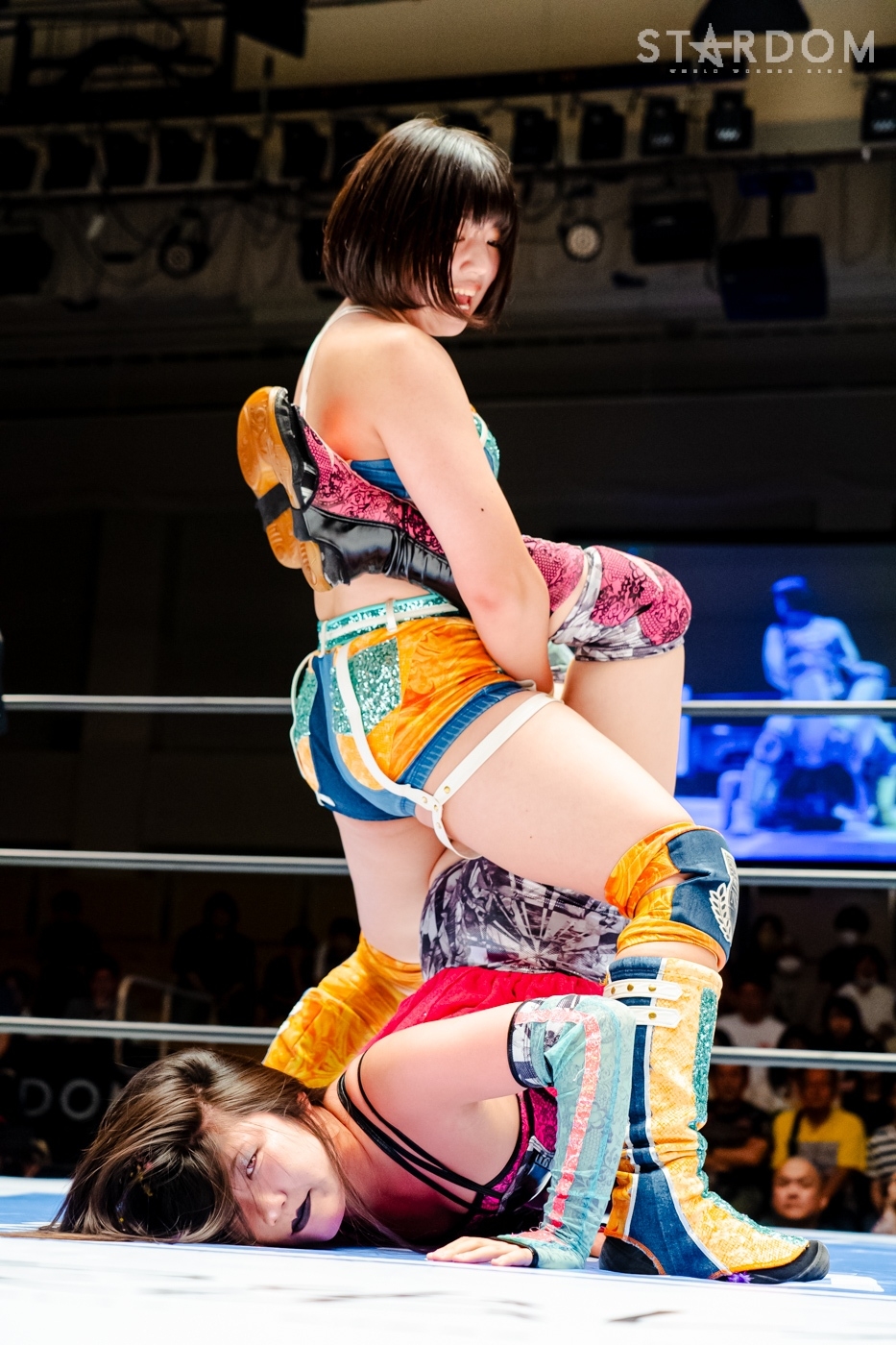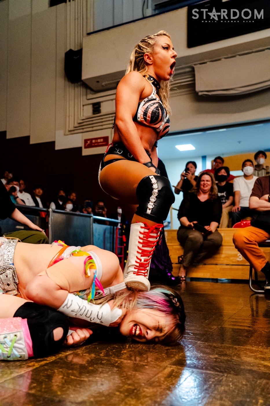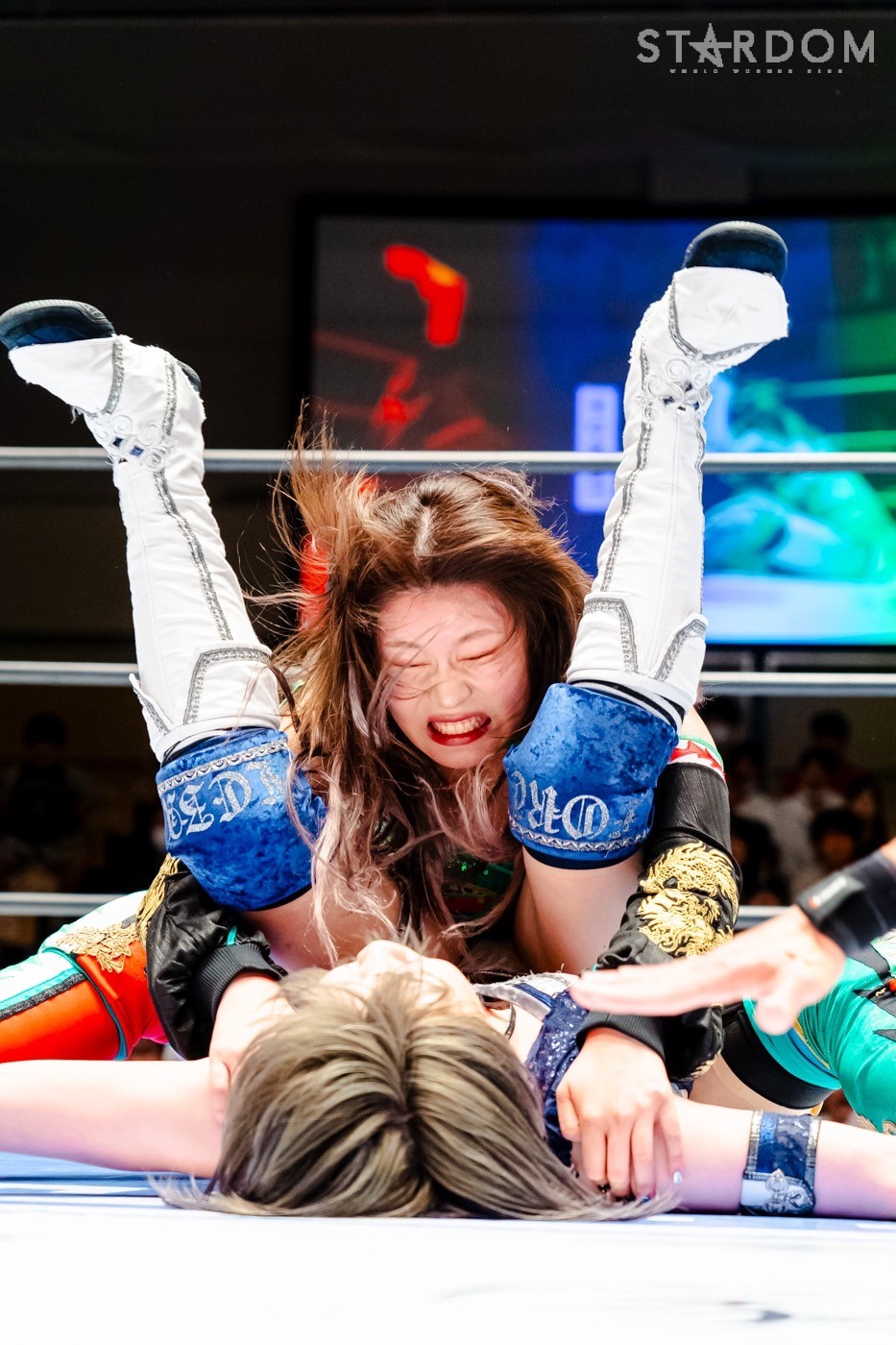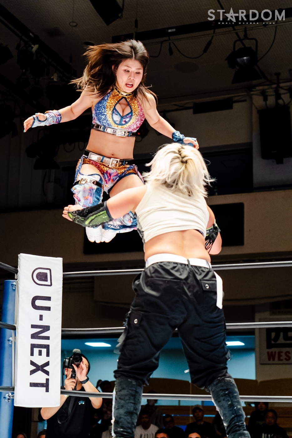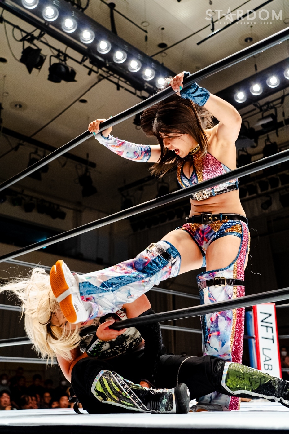 月山と向後が先発に名乗りを挙げてゴング。ロックアップから月山がヘッドロック。ロープワークとなり月山のドロップキックを向後がかわす。アームホイップの応酬から向後がドロップキック。舞華が乱入し月山と串刺し攻撃の連続。月山は下がった舞華を呼び込むが応じられず。HANAKOも入らず、月山は一人で向後にヒップアタック連打。向後がアームホイップからドロップキック。岩谷が入るとSTARSが合体し、月山を攻撃。岩谷が月山にボディースラム、サッカーボールキック、逆エビ固め。月山がエスケープすると、岩谷がロープに固定。替わった飯田が背中にチョップの連打を叩き込む。飯田が関節技を決めるとSTARSがEXVのカットを阻止。月山がエスケープしエルボー連打。飯田が受けて立ち一発で倒す。月山がドロップキックを放ちジーナに託す。ジーナは飯田にドロップキック。岩谷がカットし飯田と合体。ジーナがまとめてネックブリーカー。飯田が返すと、両者手を後ろで組んでチョップの打ち合い。飯田が連打もジーナが足を引いて走らせず、チョップから担ぎ上げる。飯田が切り返して逆水平。羽南が後方からニーアタック、ドロップキック。ジーナが羽南にトラースキック、ラリアット。HANAKOが羽南にショルダータックル、エルボー。月山と合体しクローズライン。羽南がかわすが月山とHANAKOが合体。月山を叩きつけHANAKOがカバー。羽南が返すとカウンターの巴投げから腕十字。飯田がカットして羽南と合体もショルダータックルで吹っ飛ばされる。HANAKOは向後を担ぎ上げ岩谷に投げつける。HANAKOは羽南を引き起こしブレーンバスター、アルゼンチン狙い。羽南が切り返し丸め込む。舞華とHANAKOが合体で羽南を叩きつけるもSTARSがカット。HANAKOはもう一度羽南へアルゼンチン。羽南が切り返すとSTARSが連係で分断。HANAKOを孤立させ、合体フェースクラッシャー。羽南がバックドロップでそのままホールド。HANAKOが返せず3カウントが入った。試合後、飯田と羽南がNEW BLOODタッグのベルトを月山とHANAKOに誇示してみせた。