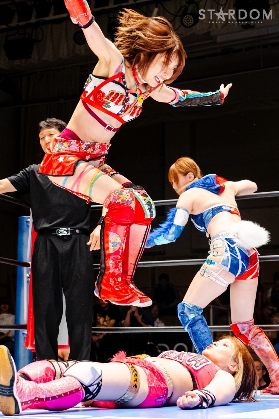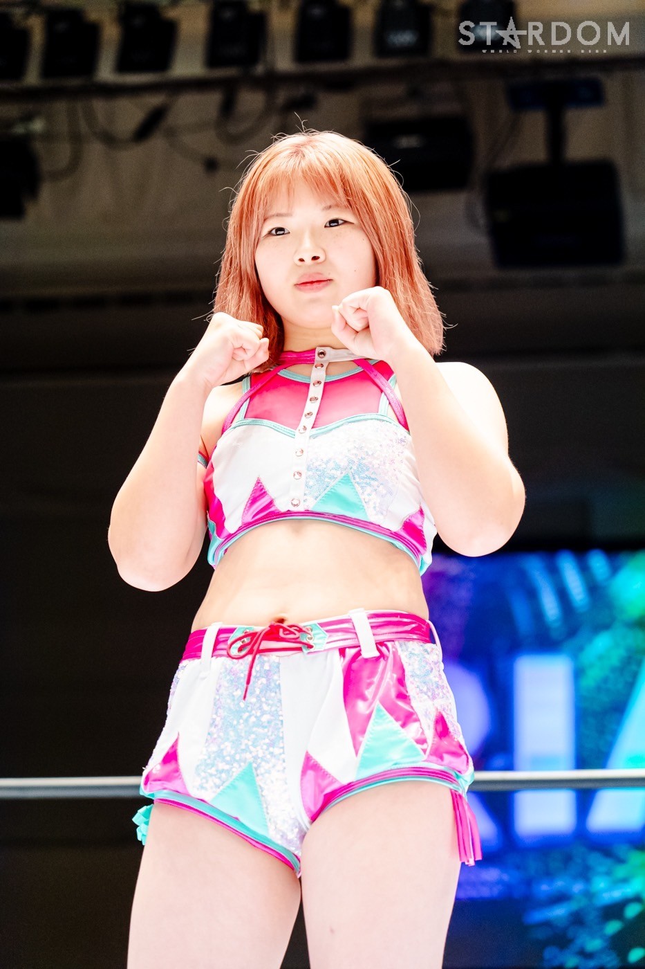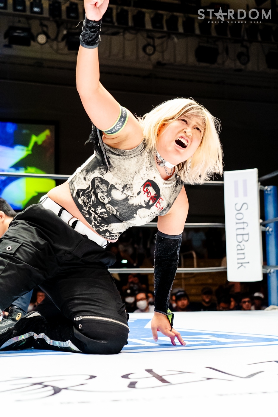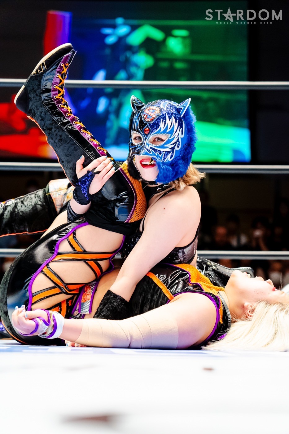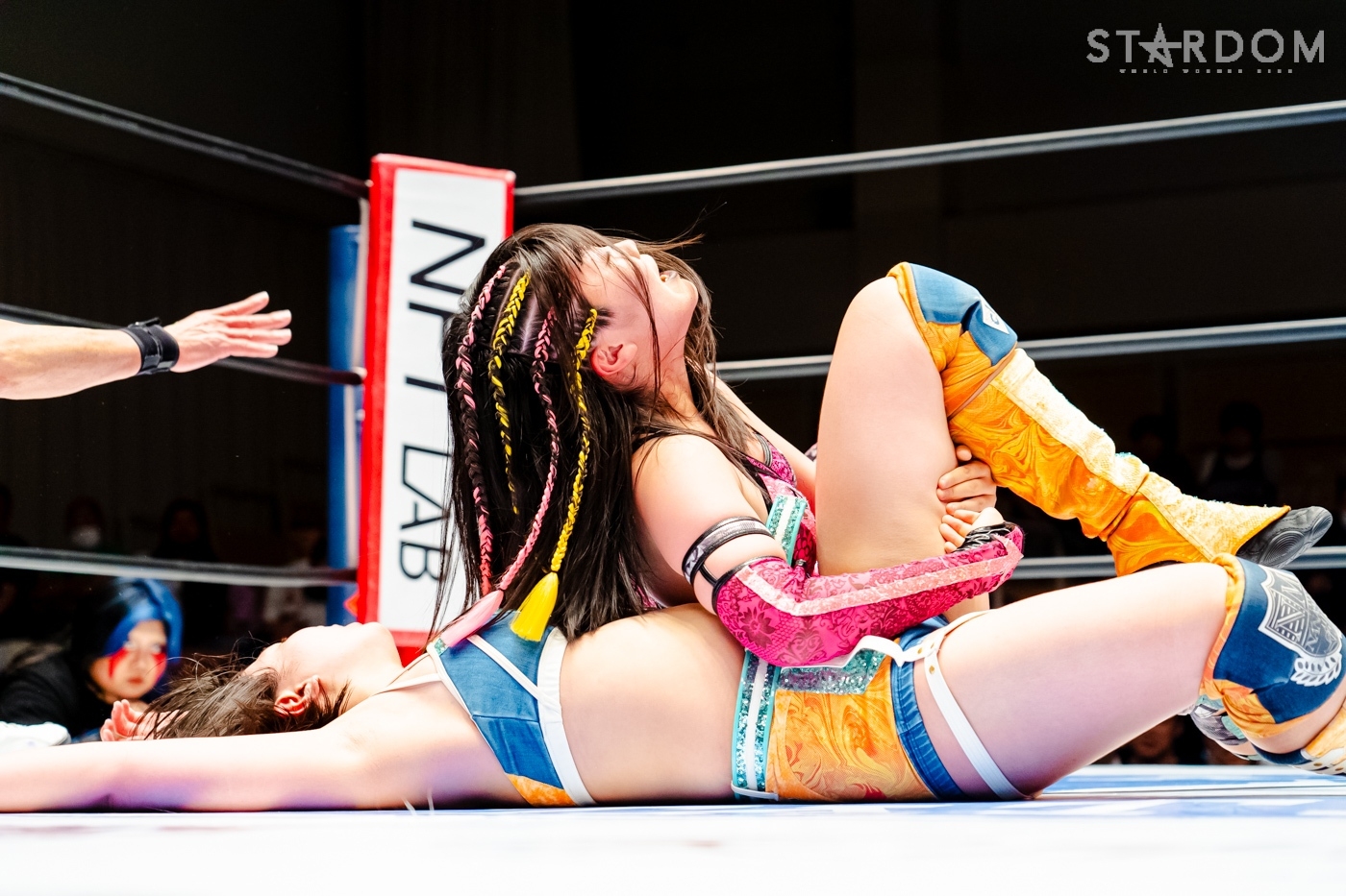 月山と向後が先発に名乗りを挙げてゴング。ロックアップから月山がヘッドロック。ロープワークとなり月山のドロップキックを向後がかわす。アームホイップの応酬から向後がドロップキック。舞華が乱入し月山と串刺し攻撃の連続。月山は下がった舞華を呼び込むが応じられず。HANAKOも入らず、月山は一人で向後にヒップアタック連打。向後がアームホイップからドロップキック。岩谷が入るとSTARSが合体し、月山を攻撃。岩谷が月山にボディースラム、サッカーボールキック、逆エビ固め。月山がエスケープすると、岩谷がロープに固定。替わった飯田が背中にチョップの連打を叩き込む。飯田が関節技を決めるとSTARSがEXVのカットを阻止。月山がエスケープしエルボー連打。飯田が受けて立ち一発で倒す。月山がドロップキックを放ちジーナに託す。ジーナは飯田にドロップキック。岩谷がカットし飯田と合体。ジーナがまとめてネックブリーカー。飯田が返すと、両者手を後ろで組んでチョップの打ち合い。飯田が連打もジーナが足を引いて走らせず、チョップから担ぎ上げる。飯田が切り返して逆水平。羽南が後方からニーアタック、ドロップキック。ジーナが羽南にトラースキック、ラリアット。HANAKOが羽南にショルダータックル、エルボー。月山と合体しクローズライン。羽南がかわすが月山とHANAKOが合体。月山を叩きつけHANAKOがカバー。羽南が返すとカウンターの巴投げから腕十字。飯田がカットして羽南と合体もショルダータックルで吹っ飛ばされる。HANAKOは向後を担ぎ上げ岩谷に投げつける。HANAKOは羽南を引き起こしブレーンバスター、アルゼンチン狙い。羽南が切り返し丸め込む。舞華とHANAKOが合体で羽南を叩きつけるもSTARSがカット。HANAKOはもう一度羽南へアルゼンチン。羽南が切り返すとSTARSが連係で分断。HANAKOを孤立させ、合体フェースクラッシャー。羽南がバックドロップでそのままホールド。HANAKOが返せず3カウントが入った。試合後、飯田と羽南がNEW BLOODタッグのベルトを月山とHANAKOに誇示してみせた。