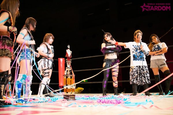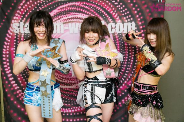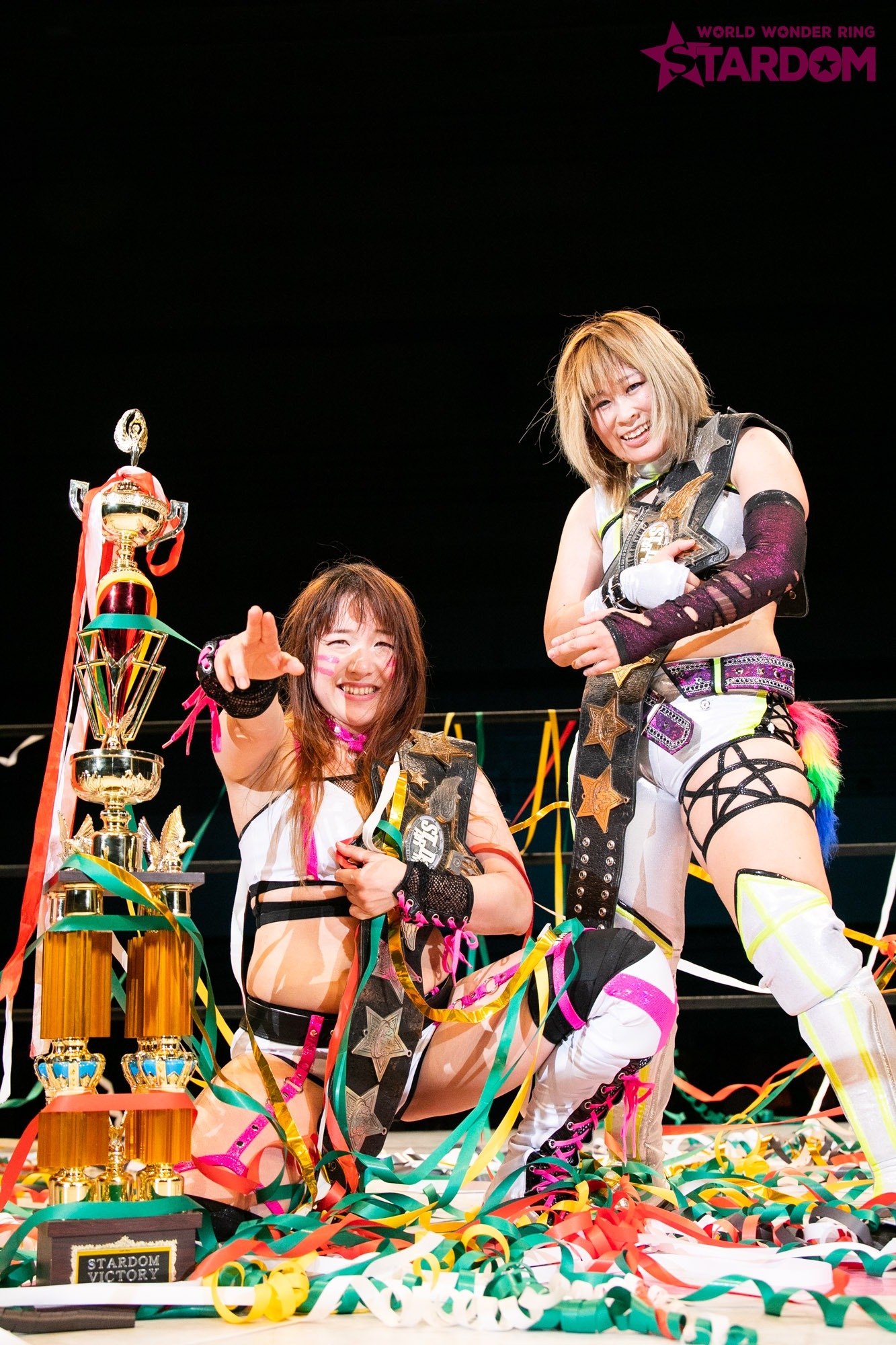 たむ「いえーい。名古屋は私たちにとって聖地です。このベルト、最多と言わずいつまでもいつまでも私たちがプロレスをやり続ける限りこの3人のもとにあるべきベルトだと思ってます。負けても負けても諦めない。STARSの力、これからももっともっと輝かせていきたいと思ってますので、なにとぞ名古屋の皆さん、日本の皆さん、世界中の皆さん 、STARSの岩谷麻優、鹿島沙希、中野たむを」