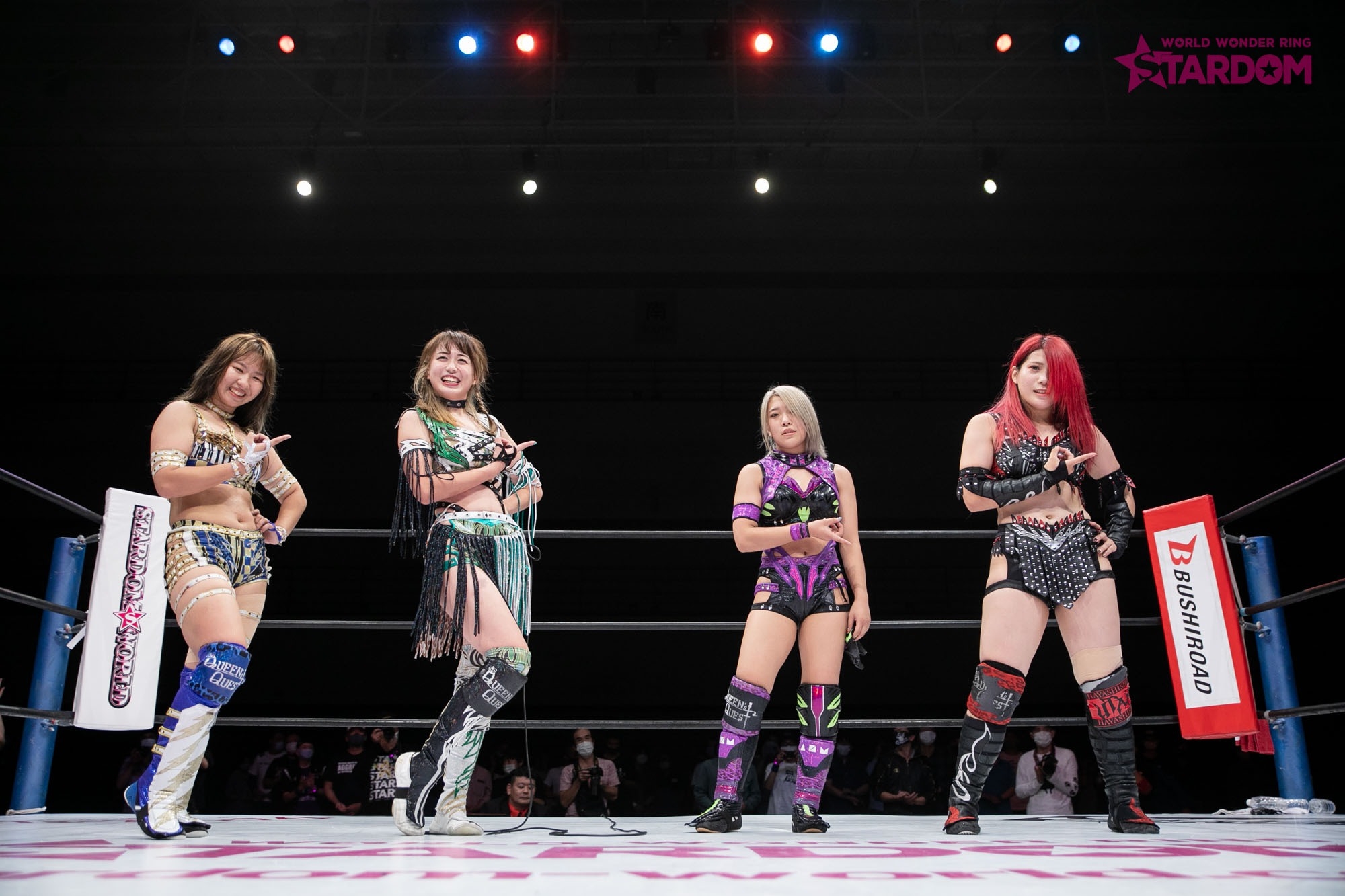 上谷「昨日のゴッデス・オブ・スターダムにつづき、最後勝つことができました。まあ最近いろんなとこからよそ者たちが来ていると思うんですけど、私が未来のスターダム、そしてQQこそがスターダムです。駆け上がります! ハイ、ということで、最後私が勝ったので締めさせていただいてもいいですか。いまを信じて?明日に輝け?誰を信じるかは自分で決めろ。Bow down to the queens!」