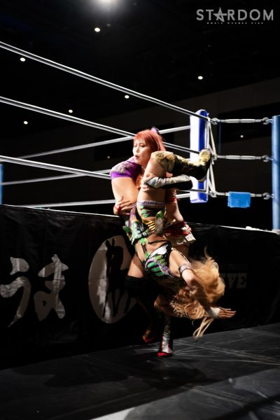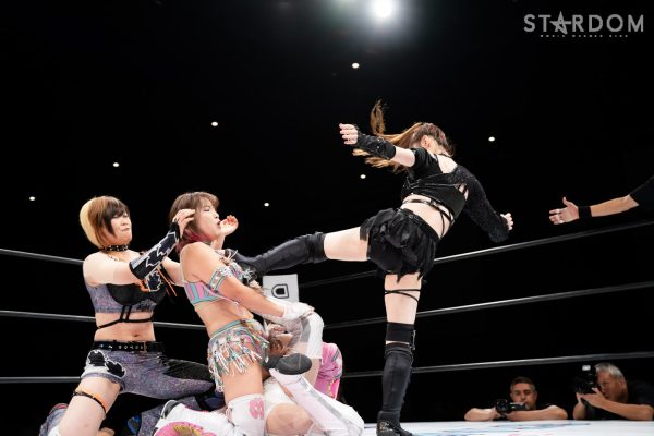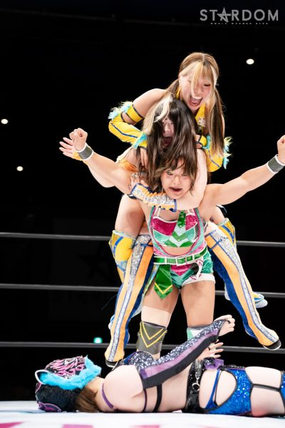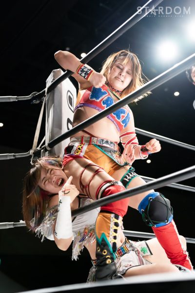 STARSのコグマ(福岡県出身)&羽南&飯田沙耶組と大江戸隊の渡辺桃&スターライト・キッド&琉悪夏組が6人タッグマッチで全面対決。STARSと大江戸隊によるユニット闘争、この日はどんな決着をみるのか?