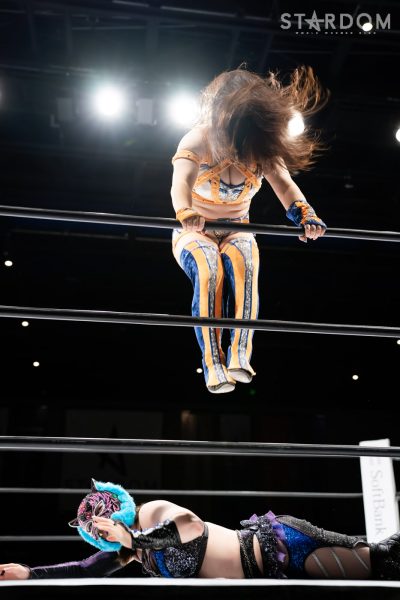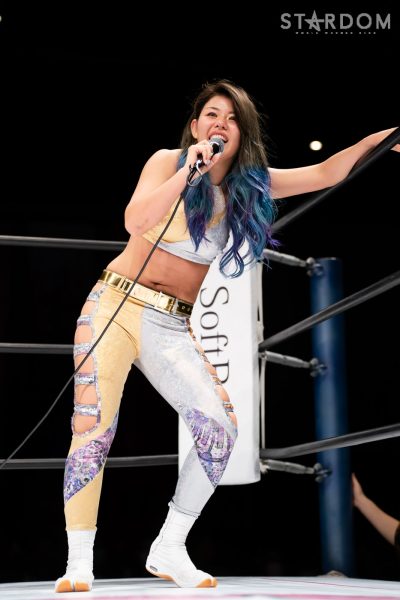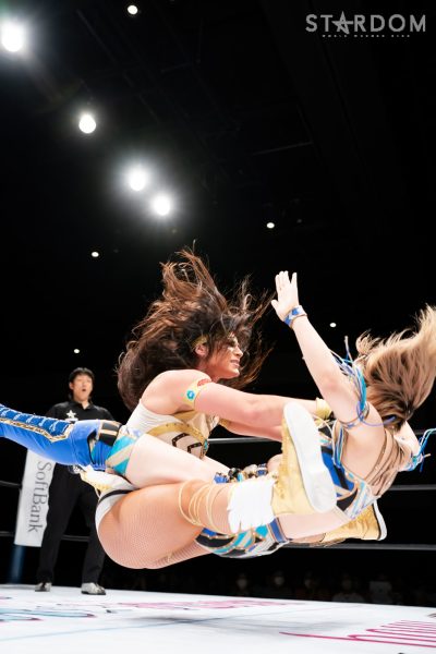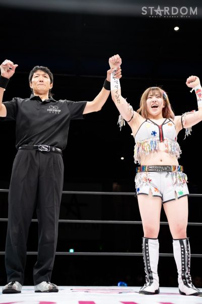 葉月「地元福岡で勝ったぞ! しんどい、しんどい。厳しい闘いでしたけど、今日勝てたのは地元福岡のみなさんの声援があったからです。次、ここ福岡に帰ってくるときは、私が5★STAR GP優勝者としてまた戻ってきたいと思います! この後メインは、同じ地元福岡出身の舞華がAZMとシングルマッチで闘いますね。今日だけは、舞華をみんなで応援しましょう! このあと、ラストメイン最後まで楽しんでいってください!」