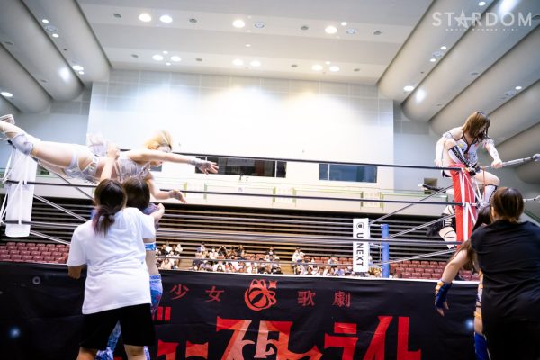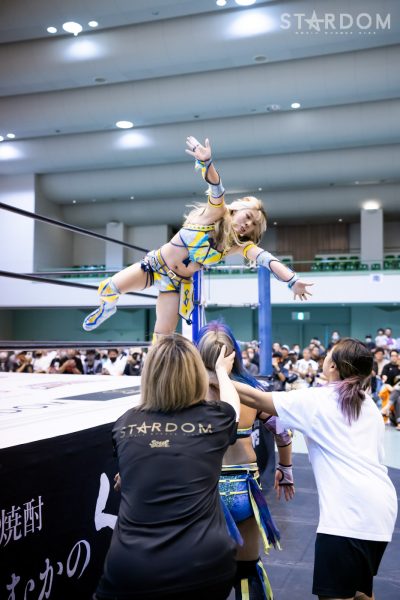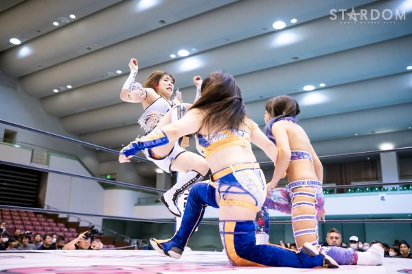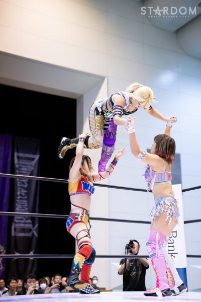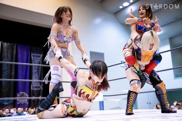 クイーンズクエストの林下詩美&AZM組、クラブビーナスの白川未奈&月山和香組、大江戸隊のスターライト・キッド&琉悪夏組が3WAYタッグマッチで対戦。さまざまな駆け引きが展開されるであろう闘いで、最後に勝利をつかむのは? とくに9・10名古屋でなつぽい&安納サオリのゴッデス・オブ・スターダム王座に挑む詩美&AZM組はこの試合でより連係力をつかんでおきたいところだ。