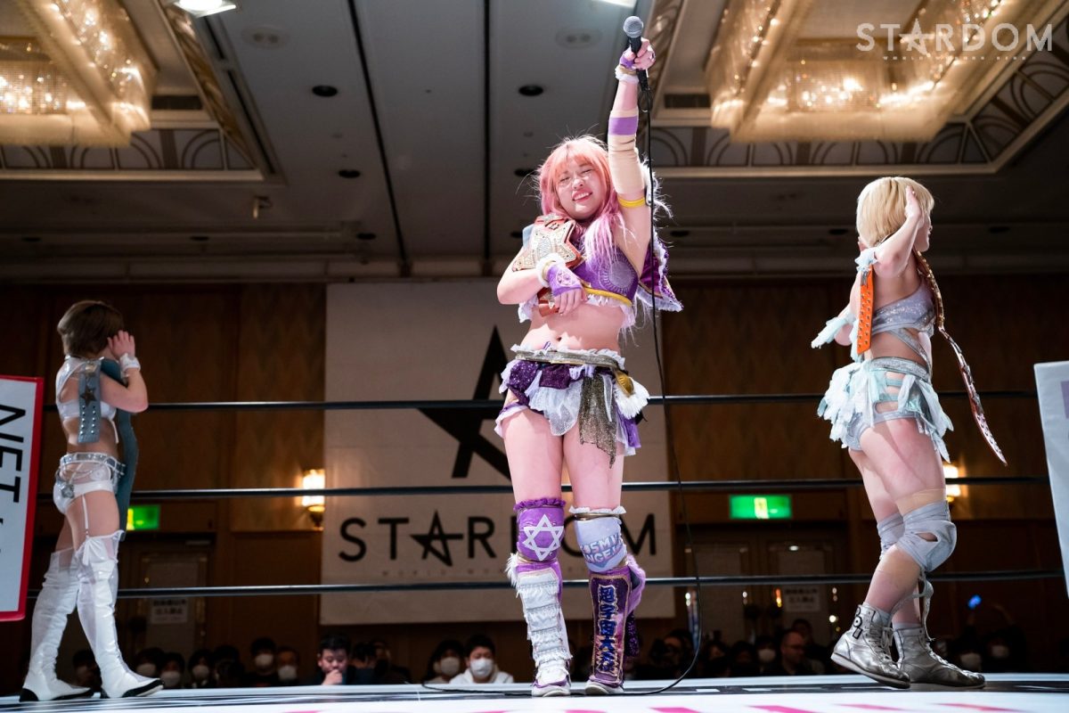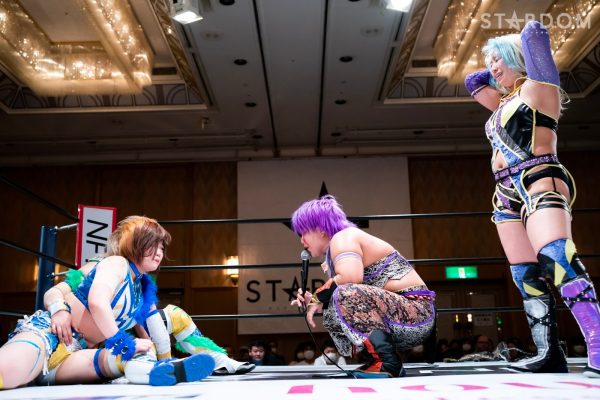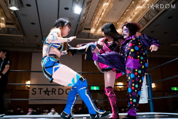 キッドと星来が先発でスタート。ロックアップから星来がロープに振ってロープワークの攻防。キッドがアームホイップで投げると星来がやり返す。鈴季が乱入しキッドにタッチをさせず、星来との連係で攻め込む。星来がキッドへ突進もリング下から琉悪夏が足を引く。キッドは星来の顔面を踏みつけ琉悪夏に託す。琉悪夏が星来にショルダータックル連打、キャメルクラッチ。そこへキッドがドロップキックを叩き込む。キッドが「さっきはオマエよくも足を踏んでくれたな」とやり返す。ロープに振られた星来がなんどもキッドをかいくぐりドロップキック。鈴季がキッドの背中にニーアタック連打。コーナーに追い込むとまとめて串刺し攻撃。鈴季は「一発食らえ!」とキッドをまねるが怒ったキッドがエルボー連打。鈴季も応戦しエルボーの打ち合い。鈴季がジャーマンを狙うがキッドがエルボー、ボディーアタック。キッドは「これがホントの一発食らえ!」とその場飛びムーンサルト。琉悪夏が鈴季にショルダータックル、セントーン、フェースロック。琉悪夏の突進を鈴季がかわしてスピア。鈴季の突進を琉悪夏がかわしラリアット、キッドがボディーアタック。琉悪夏がフィッシャーマンの体勢でキッドがコーナーからダイブ。しかし星来のカットが成功。琉悪夏は鈴季にフィッシャーマンの構え。鈴季が切り返しバックを取る。琉悪夏が切り返すと星来がネックブリーカー、鈴季がハイキック。鈴季がキッドを捕獲し星来のコードブレイカーと合体。琉悪夏が腹部へのパンチからフィッシャーマン。鈴季が返すと、琉悪夏の突進にハイキック。テキーラショットを決めると3カウントが入った。