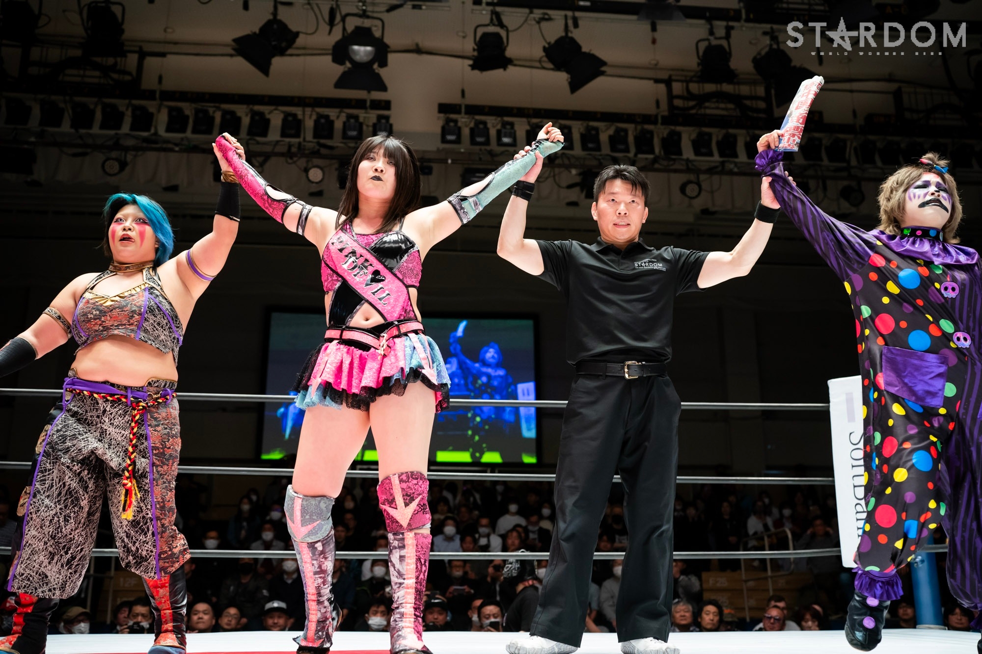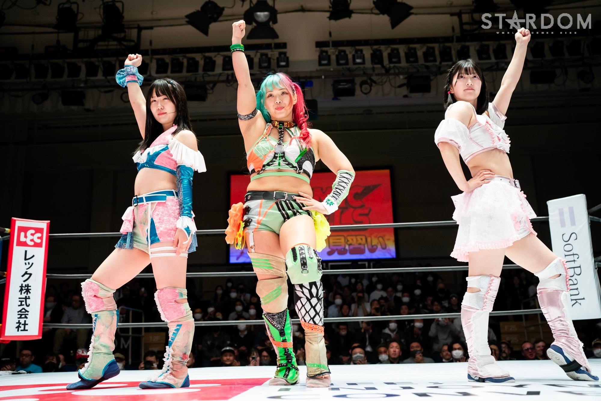 Momo meninggalkan ring sendirian untuk memulai pertandingan. Ketiganya dengan hati-hati mengambil posisi empat arah, dengan Hazuki menjadi sasaran dan menerima serangan bahu, tetapi dengan cepat bangkit kembali dan terlibat dalam pertarungan di tali ring. Hazuki membawa keduanya berhadapan muka, mengayunkan lengannya ke arah mereka berdua dan memukul wajah mereka. Namun, Momo ikut campur dengan menjegal mereka dari bawah ring. Zourei dan Gina menyerang Hazuki dengan serangan bahu. Zourei dan Gina saling bertukar pukulan. Gina memanggil Momo untuk bergabung dalam pertarungan pukulan. Rentetan pukulan Gina membuat Zourei dan Momo kesakitan. Gina juga memanggil Hazuki untuk memukulnya. Gina membalas dan memukul Momo, Zourei, dan Hazuki dengan rentetan pukulan. Saat Hazuki dan Sohrei mencoba bekerja sama, Hazuki dan Momo menyerang Sohrei dengan lutut. Momo melakukan tendangan penalti. Hazuki melakukan senton. Hazuki membalas dan mereka saling bertukar serangan siku. Sohrei maju dan Gina melakukan serangan siku. Gina dan Sohrei membuat Momo dan Hazuki terlempar dengan lariats dan shoulder tackle. Gina dan Sohrei saling bertukar lariats. Sohrei melakukan serangkaian serangan siku dan melempar Hazuki ke arah Gina, tetapi Gina menangkapnya. Hazuki membantingnya ke bawah dan melakukan tendangan missile ke arah Sohrei dan Momo. Gina menangkap Hazuki dan melakukan modified side slam, lalu melakukan double arm suplex ke arah Sohrei. Gina berteriak "Sudah berakhir!" dan mengangkat Sohrei. Sohrei melakukan counter, tetapi Gina melakukan Northern Lights. Hazuki kemudian melakukan diving senton. Momo memotongnya dan melakukan serangan siku ke arah Hazuki. Hazuki menghindar dan melakukan DDT. Momo memukul Hazuki dengan tongkat baseball. Sorei menghindari pukulan tongkat dan melancarkan lariat. Momo membalas serangan Sorei secepat kilat dan membantingnya ke bawah. Momo juga melancarkan Tequila, tetapi hanya menghasilkan hitungan dua. Dia melancarkan Peach Sunrise, tetapi Sorei tidak dapat membalas, sehingga hitungan tiga tercapai.