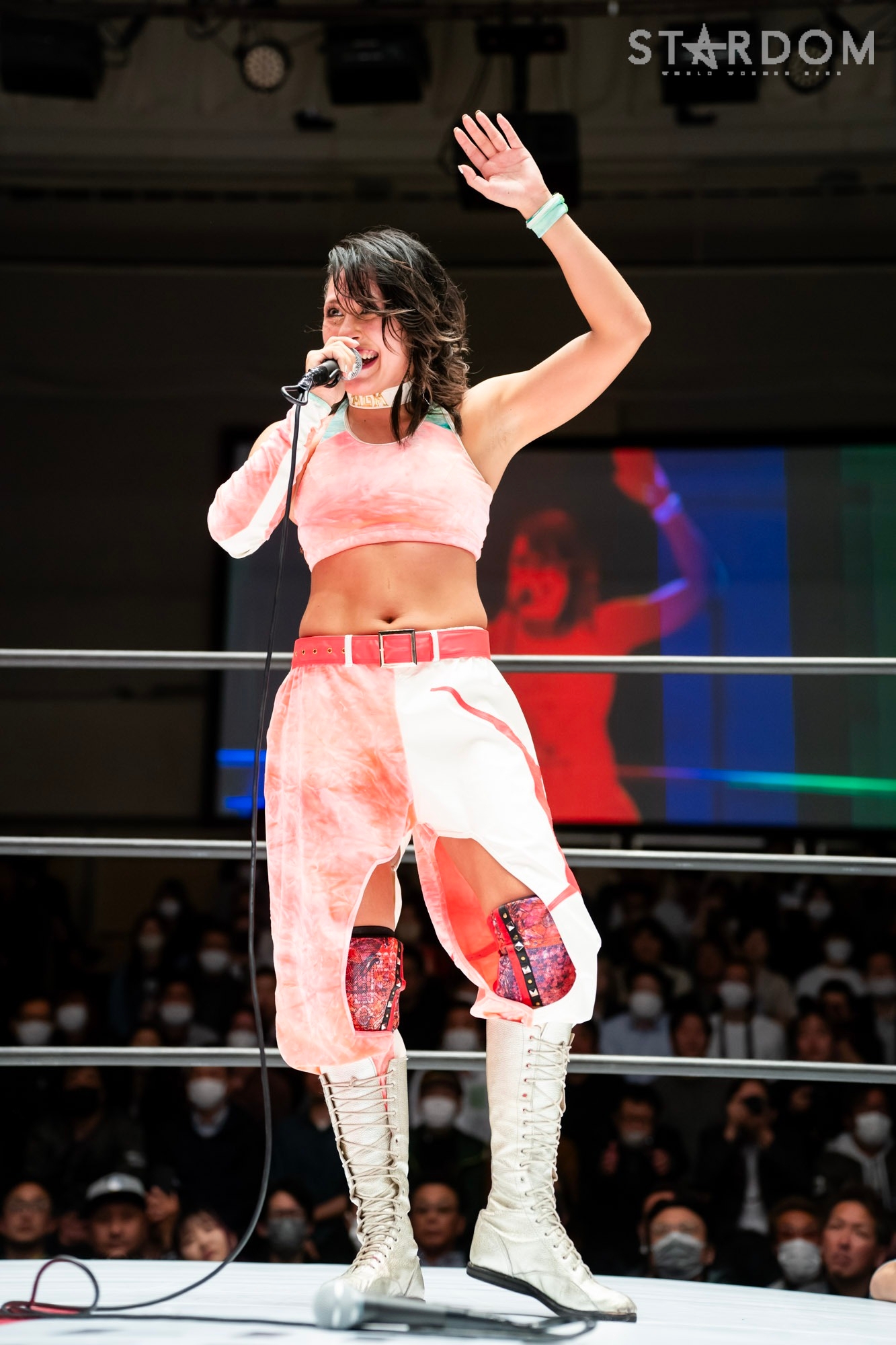 Julia: "Selamat siang semuanya yang datang ke Korakuen Hall! Benar, Hanan-chan dan aku seumur. Yah, aku baru saja berulang tahun ke-30 beberapa hari yang lalu, tapi sekarang kamu berapa umur? 19? Oke, oke. Menjadi muda itu hebat, kita seusia, tapi kalian terpaut lebih dari 10 tahun? Yang ingin kukatakan adalah, Hanan-chan, saat pertama kali bertemu denganmu, aku masih berusia 20-an, tapi kamu masih SMA. Dan kamu benar-benar sudah tumbuh sejak Haunt! Aku terkejut! Masih banyak hal yang menanti di depanmu. Jadi selama kamu di sini, Stardom akan baik-baik saja, kan? Jadi, Hanan-chan, kamu akan bertarung memperebutkan sabuk putih selanjutnya, kan? Aku berharap bisa menjadi juara, jadi lakukan yang terbaik! Hanan-chan. Dan Iwatani Mayu! Iwatani Mayu, aku ingin bertanding satu lawan satu denganmu untuk memperebutkan sabuk juara suatu hari nanti, tapi itu tidak pernah terjadi. Tapi ketika aku "Jika Anda menjadi lebih besar lagi, saya pasti ingin bertarung lagi dengan Anda, Iwatani Mayu. Jadi, Iwatani Mayu, sebagai ikon gulat profesional wanita Stardom, tolong jaga diri Anda, meskipun Anda sedikit berantakan. Terima kasih!"