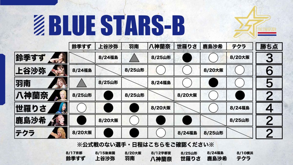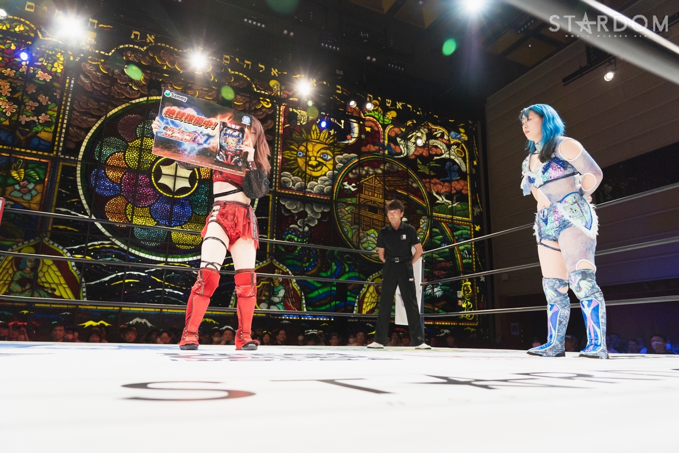 世羅りさと鹿島沙希の公式リーグ戦はともに1勝2敗同士。両者とも前大会の8・15後楽園、世羅が鈴季すずとの現&元プロミネンス対決、鹿島が超秒殺と対照的な試合ながらも連敗をストップ、初白星を挙げた。この試合に勝って星を五分とするのは?