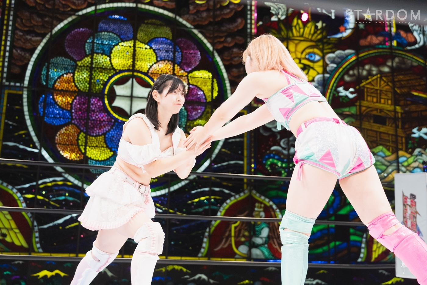 さくらあやと梨杏がシングルマッチで対戦。若手同士のフレッシュな闘いで、梨杏がシングル初勝利か、先にデビューのさくらの意地がまさるか?