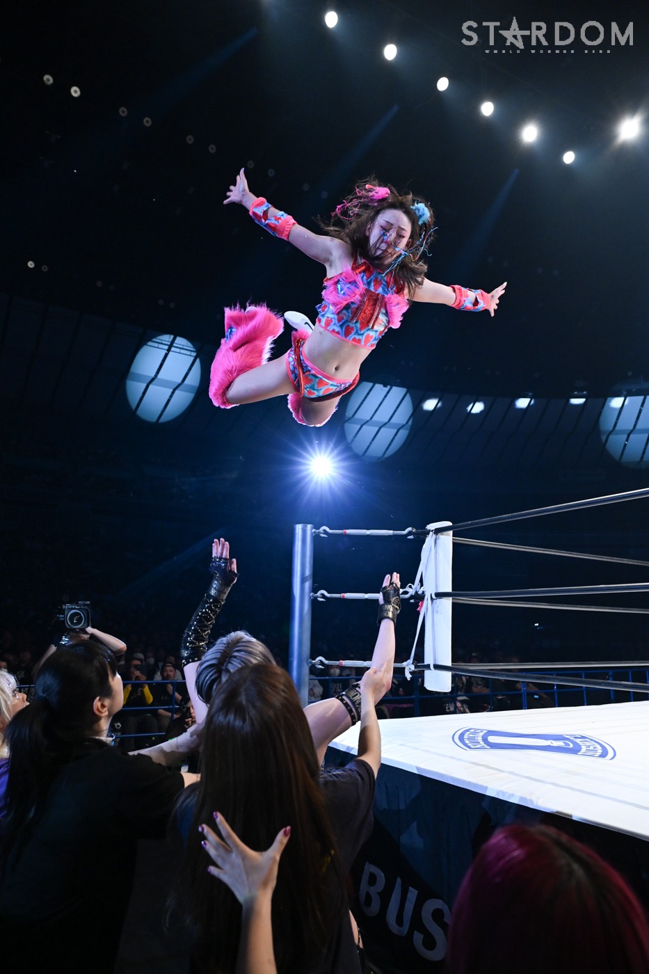 後頭部へのシャイニングウィザードから正調の閃光魔術弾をグサリ。さらに「いくぞ!」の掛け声から、初公開のムーンサルトプレスを披露だ。