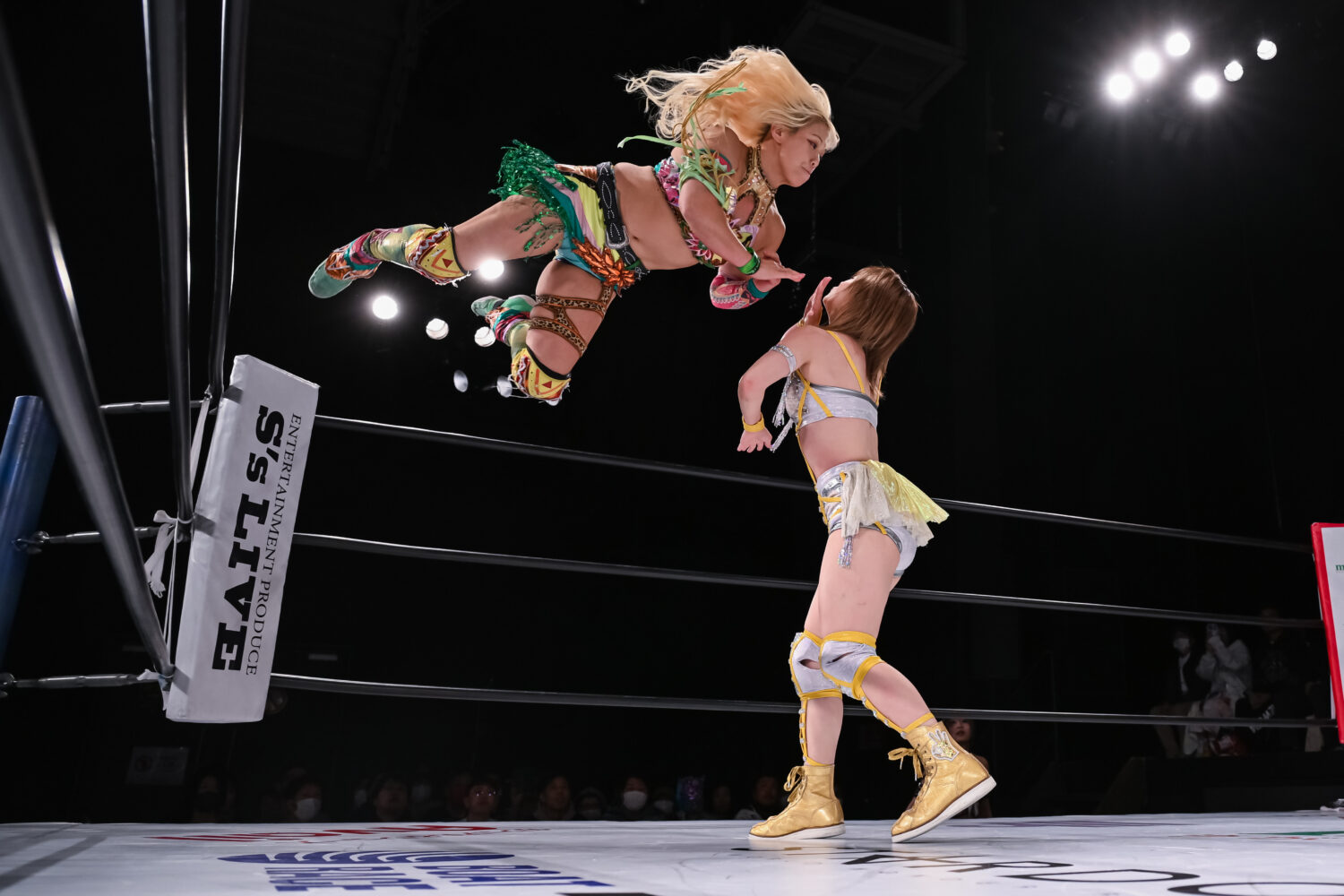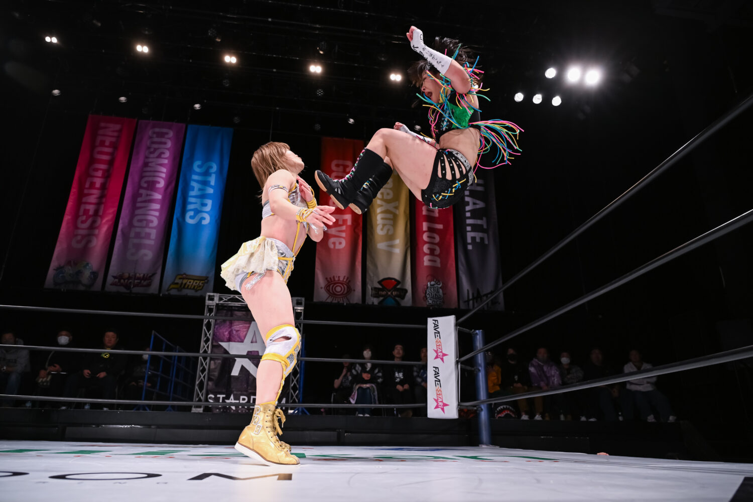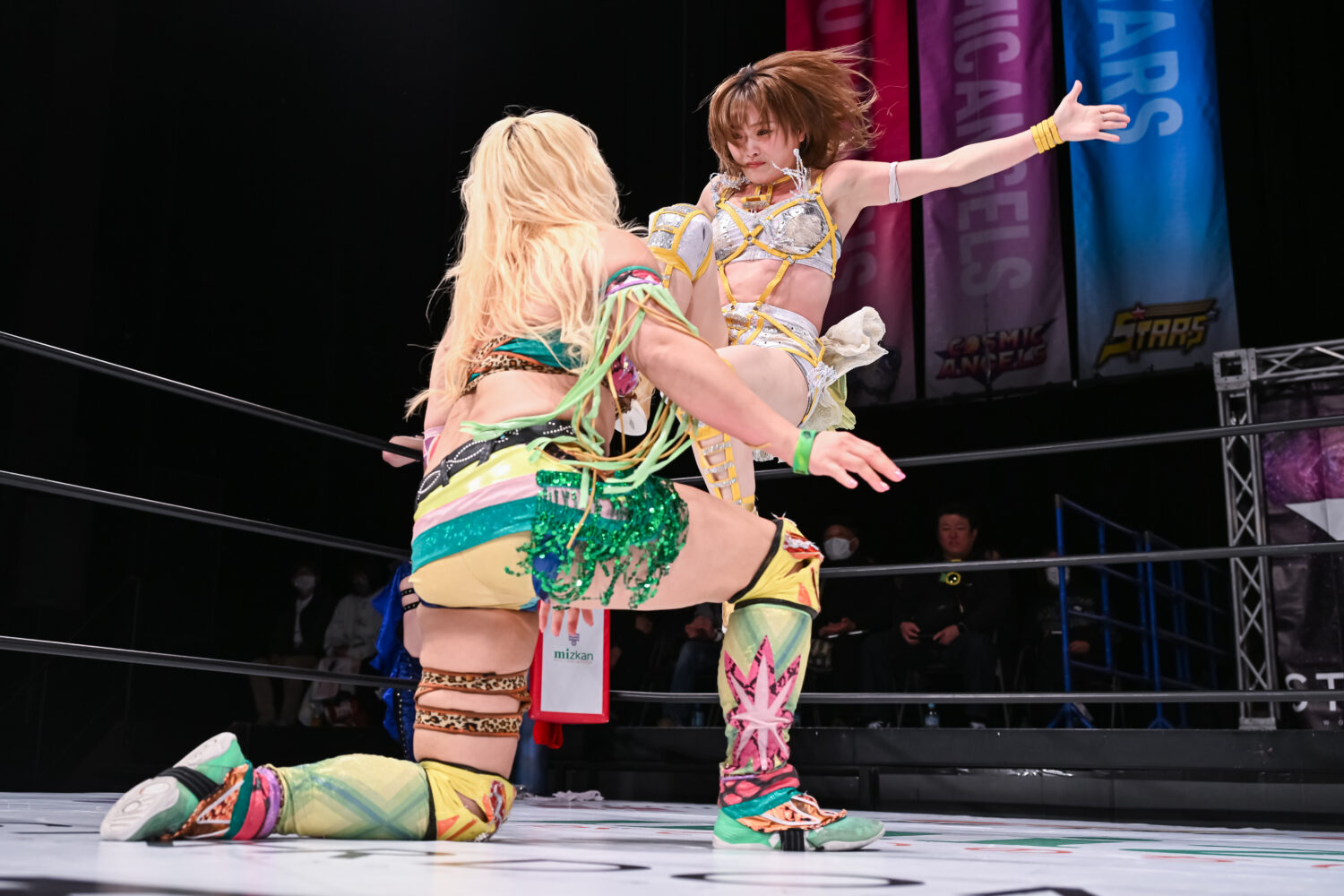 なつぽいと水森の先発でスタート。なつぽいがエルボーを打つと、水森が力強くやり返して打ち合いに。なつぽいが連打すると、水森が挑発してチョップをぶち込む。水森のダッシュになつぽいがドロップキック。安納が入ってダブルのドロップキックにいくが、水森がかわして星来と合体、2方向でドロップキックを決める。水森と星来が連係でなつぽいを攻撃して、ダブルの逆エビ固め。星来がなつぽいへ串刺しドロップキック10連発。水森がコーナーからダイビングショルダータックルを浴びせ、返されるたびにカバーする。なつぽいがしのぐと、水森のボディースラムを切り返して、アームホイップからドロップキック。安納が水森にドロップキック、インディアンデスロック、星来の乱入にはフィッシャーマン。安納は水森にも狙うが、切り返されてエルボーの打ち合いから延髄斬り。水森がドロップキック連打を見舞い、星来に託す。星来はドロップキックの乱れ打ち。しかし、安納が返してみせる。安納をかいくぐり、星来が脚をロック。安納が切り返すと、星来がセカンドに飛び乗る。なつぽいが妨害して安納がフィッシャーマン。返した星来になつぽいがドロップキック連打、ミサイルキック。水森がなつぽいへラリアット連打、ギロチンドロップ。なつぽいが返すと、水森は変型三角絞めにとらえる。なつぽいがなんとかロープに到達してバックキック。星来が乱入し、水森と交互にドロップキック連打。水森がスライディングラリアットも、2カウント。水森がコーナーに上がると安納がカットに入り、フィッシャーマンで叩きつける。なつぽいがコーナーに上がり、フェアリアルギフト。星来がカットし、水森とキックの競演、水森がサブミッション。しかし、安納がカットする。水森はなつぽいを抱え上げるが、丸め込まれる。丸め込みの応酬から水森がスーパーガール。なつぽいが返すと、安納との合体トラースキック。星来がドロップキックで水森と競演。水森がなつぽいをマットに叩きつけるが、返される。10分経過。水森の突進になつぽいがトラースキック、フェアリーマジック。ギリギリで星来のカットが間に合う。なつぽいと安納がジャーマンの競演。ダブルのカカト落としを決め、なつぽいが丸め込む。水森が返すと、安納と合体フィッシャーマンバスター。なつぽいがフェアリングリングを決めると水森が3カウントを奪われた。