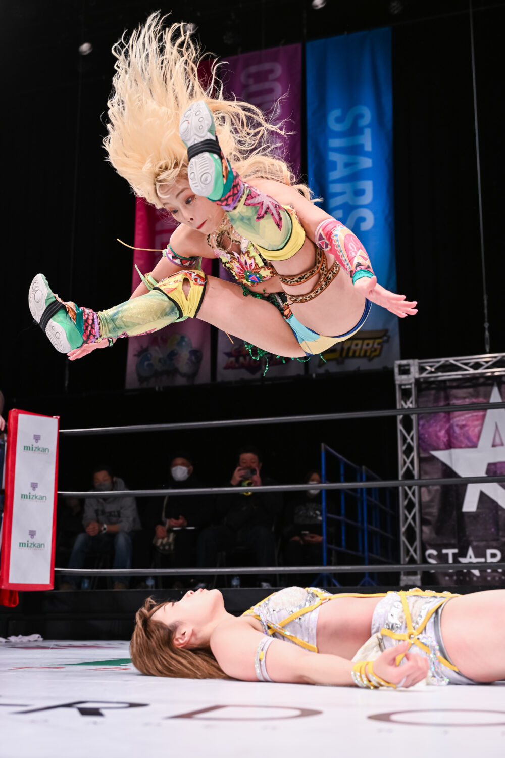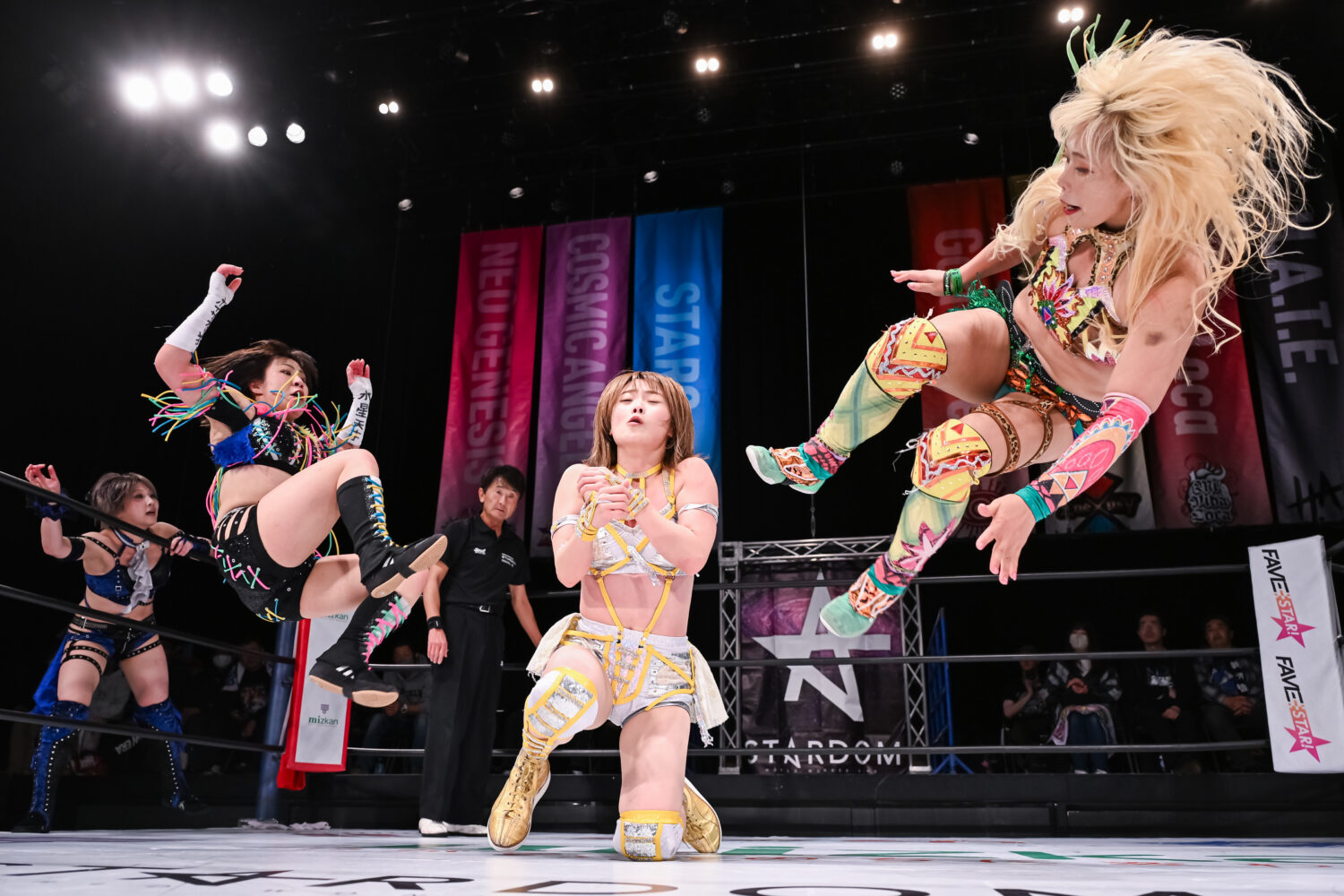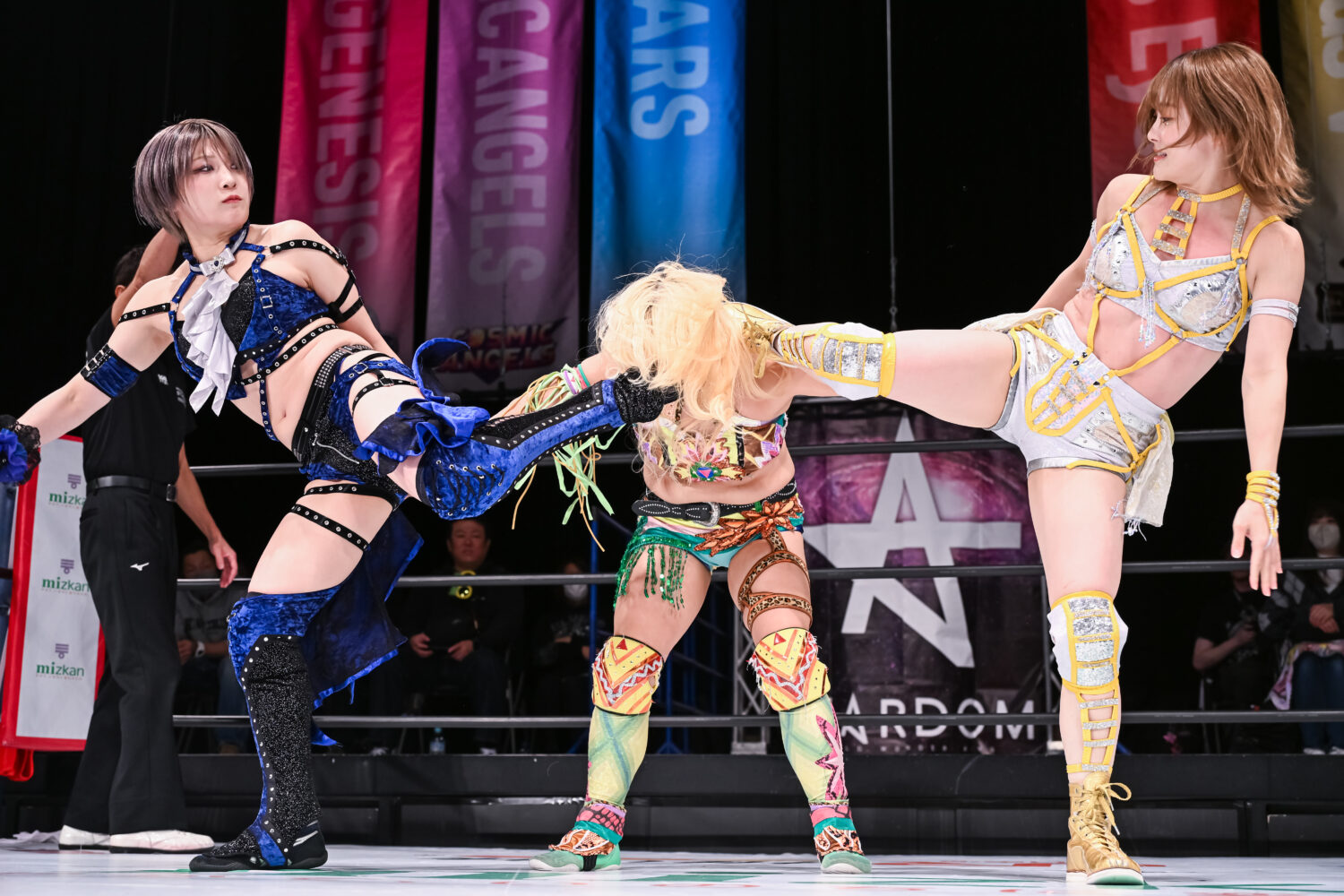 なつぽいと水森の先発でスタート。なつぽいがエルボーを打つと、水森が力強くやり返して打ち合いに。なつぽいが連打すると、水森が挑発してチョップをぶち込む。水森のダッシュになつぽいがドロップキック。安納が入ってダブルのドロップキックにいくが、水森がかわして星来と合体、2方向でドロップキックを決める。水森と星来が連係でなつぽいを攻撃して、ダブルの逆エビ固め。星来がなつぽいへ串刺しドロップキック10連発。水森がコーナーからダイビングショルダータックルを浴びせ、返されるたびにカバーする。なつぽいがしのぐと、水森のボディースラムを切り返して、アームホイップからドロップキック。安納が水森にドロップキック、インディアンデスロック、星来の乱入にはフィッシャーマン。安納は水森にも狙うが、切り返されてエルボーの打ち合いから延髄斬り。水森がドロップキック連打を見舞い、星来に託す。星来はドロップキックの乱れ打ち。しかし、安納が返してみせる。安納をかいくぐり、星来が脚をロック。安納が切り返すと、星来がセカンドに飛び乗る。なつぽいが妨害して安納がフィッシャーマン。返した星来になつぽいがドロップキック連打、ミサイルキック。水森がなつぽいへラリアット連打、ギロチンドロップ。なつぽいが返すと、水森は変型三角絞めにとらえる。なつぽいがなんとかロープに到達してバックキック。星来が乱入し、水森と交互にドロップキック連打。水森がスライディングラリアットも、2カウント。水森がコーナーに上がると安納がカットに入り、フィッシャーマンで叩きつける。なつぽいがコーナーに上がり、フェアリアルギフト。星来がカットし、水森とキックの競演、水森がサブミッション。しかし、安納がカットする。水森はなつぽいを抱え上げるが、丸め込まれる。丸め込みの応酬から水森がスーパーガール。なつぽいが返すと、安納との合体トラースキック。星来がドロップキックで水森と競演。水森がなつぽいをマットに叩きつけるが、返される。10分経過。水森の突進になつぽいがトラースキック、フェアリーマジック。ギリギリで星来のカットが間に合う。なつぽいと安納がジャーマンの競演。ダブルのカカト落としを決め、なつぽいが丸め込む。水森が返すと、安納と合体フィッシャーマンバスター。なつぽいがフェアリングリングを決めると水森が3カウントを奪われた。