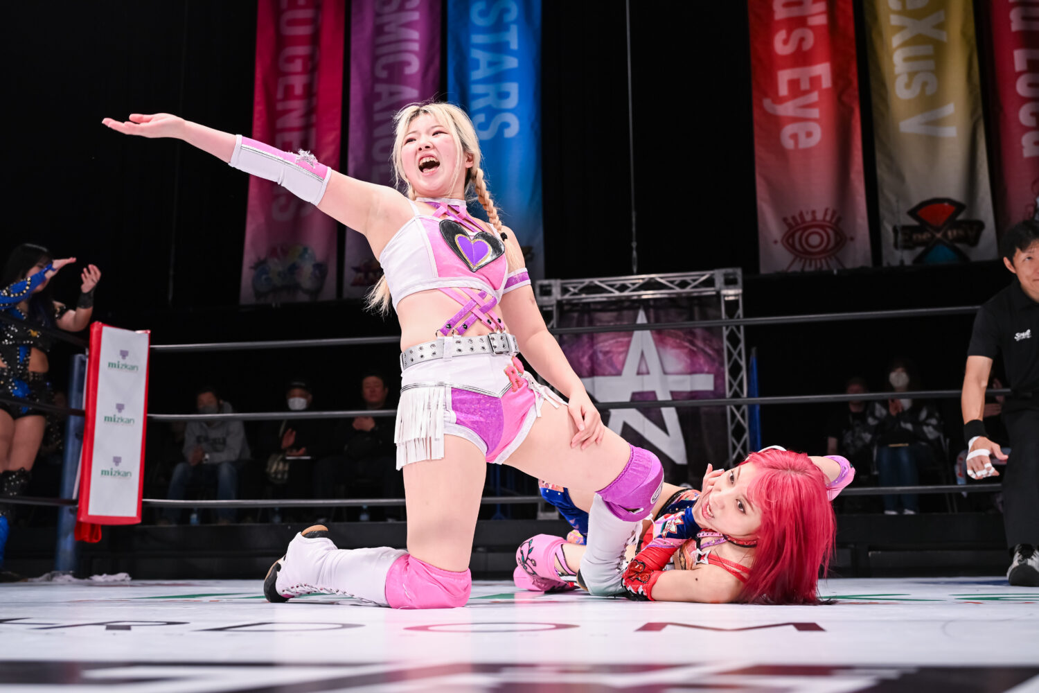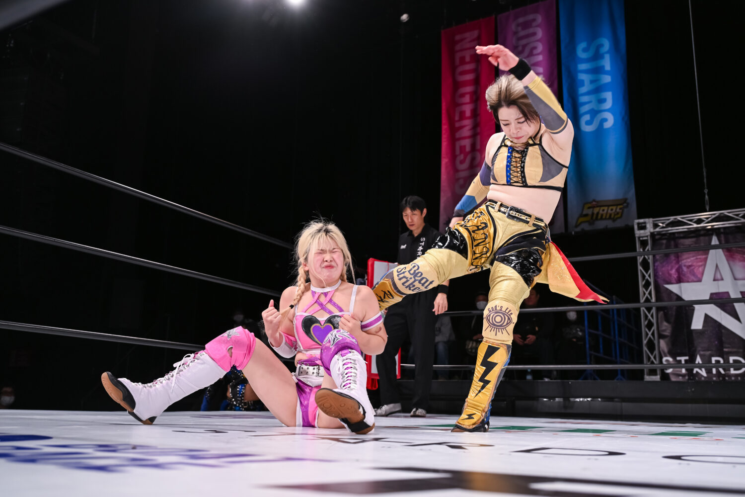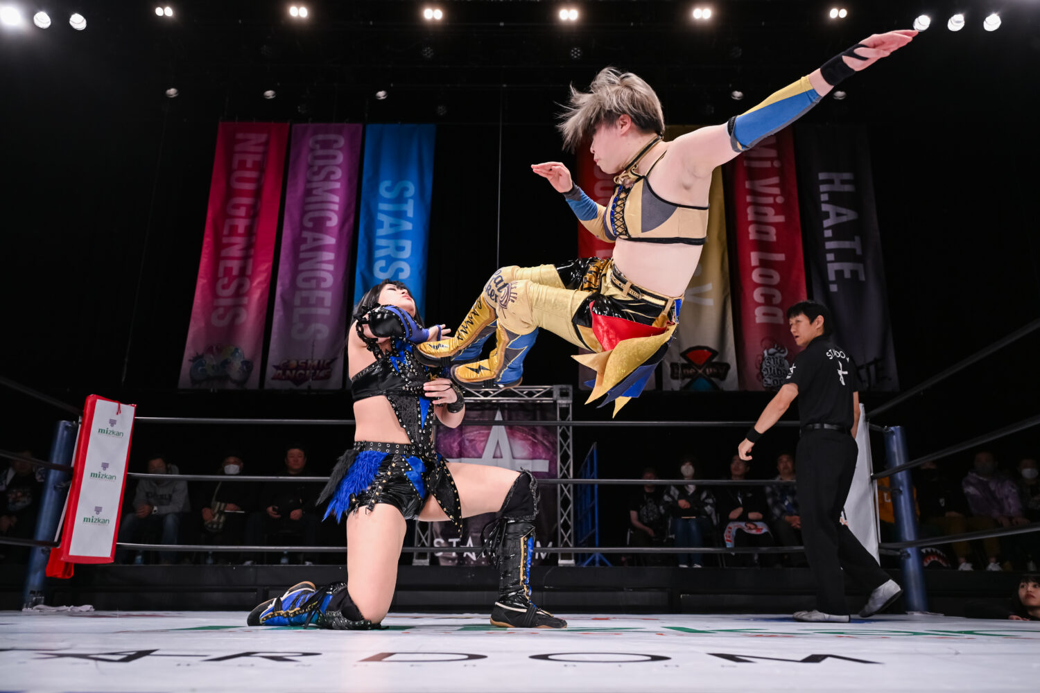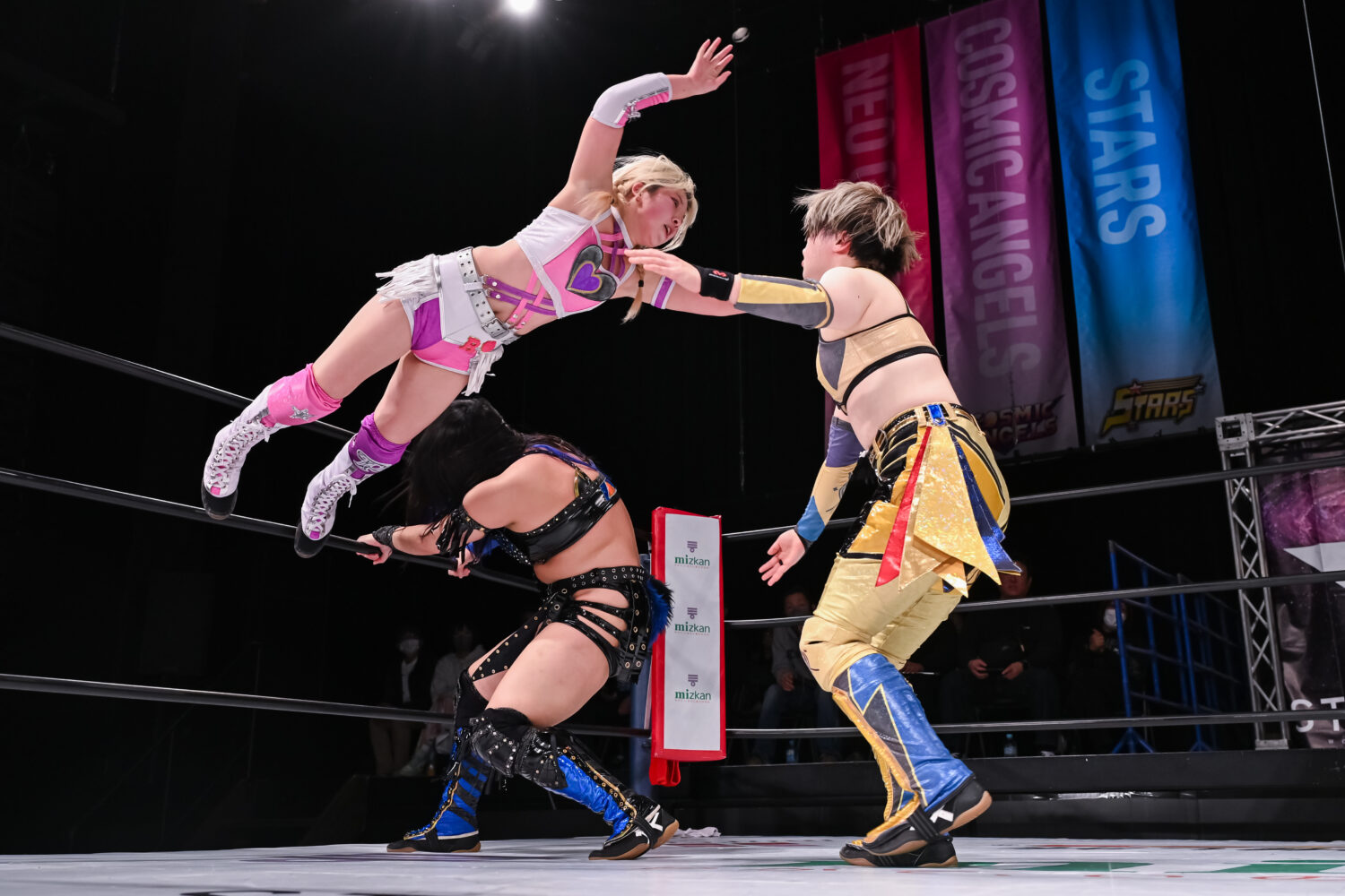 向後と梨杏の先発でゴング。ロックアップから梨杏が腕を取り、向後も応戦。向後が脚を取り、グラウンドにもっていく。向後は立ち上がってヘッドロック。梨杏がロープに振り、向後がアームホイップ。梨杏がドロップキックをかわしてアームホイップのお返しからドロップキックを決める。梨杏がボディースラムを狙うが、向後が反対に叩きつけ、グラウンドで腕を取る。しかし、HANAKOがカットに入る。八神が梨杏にアームブリーカーの連発から左腕にエルボードロップ、ニードロップ、サッカーボールキック。向後が梨杏にストンピング連打。梨杏がカウンターでクロスボディー。替わったHANAKOが向後にショルダータックル、八神にも打ち込み、向後、八神に次々とボディースラム、その場跳びボディープレス。向後が返すと、HANAKOはブレーンバスター狙い。向後が切り返してドロップキック、変型619、ネックブリーカー。八神がHANAKOへドロップキック、ミドルキック連打、ドロップキック、ミドルキック。HANAKOが返すと、先回りしてビッグブーツ。梨杏が八神にクロスボディー、コルバタ、ドロップキック。八神が返すと、梨杏の突進にミドルキック、串刺しハイキック、サッカーボールキック。梨杏が返すと、八神は腕十字。HANAKOがカットし、向後も場外に投げ捨てて、八神にボディースラム、梨杏がフットスタンプ、スリーパー。八神がエスケープすると、梨杏のフィッシャーマンをかわして向後がトラースキック、八神がゼロ戦キック。返した梨杏に、八神はフィニッシュを宣言。しかし、梨杏が蹴りをかわして丸め込む。向後がカットし、八神と合体。しかしHANAKOがまとめてラリアット、梨杏がセカンドから八神にボディーアタック。梨杏の突進に八神がハイキック、変型腕固めのビートマスター。梨杏がギブアップし、八神の勝利となった。