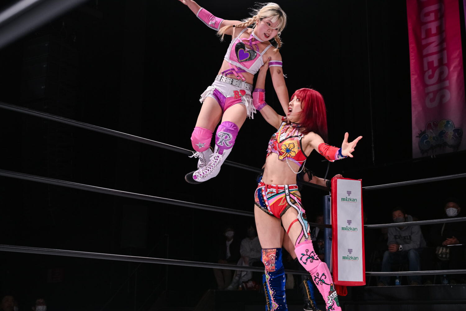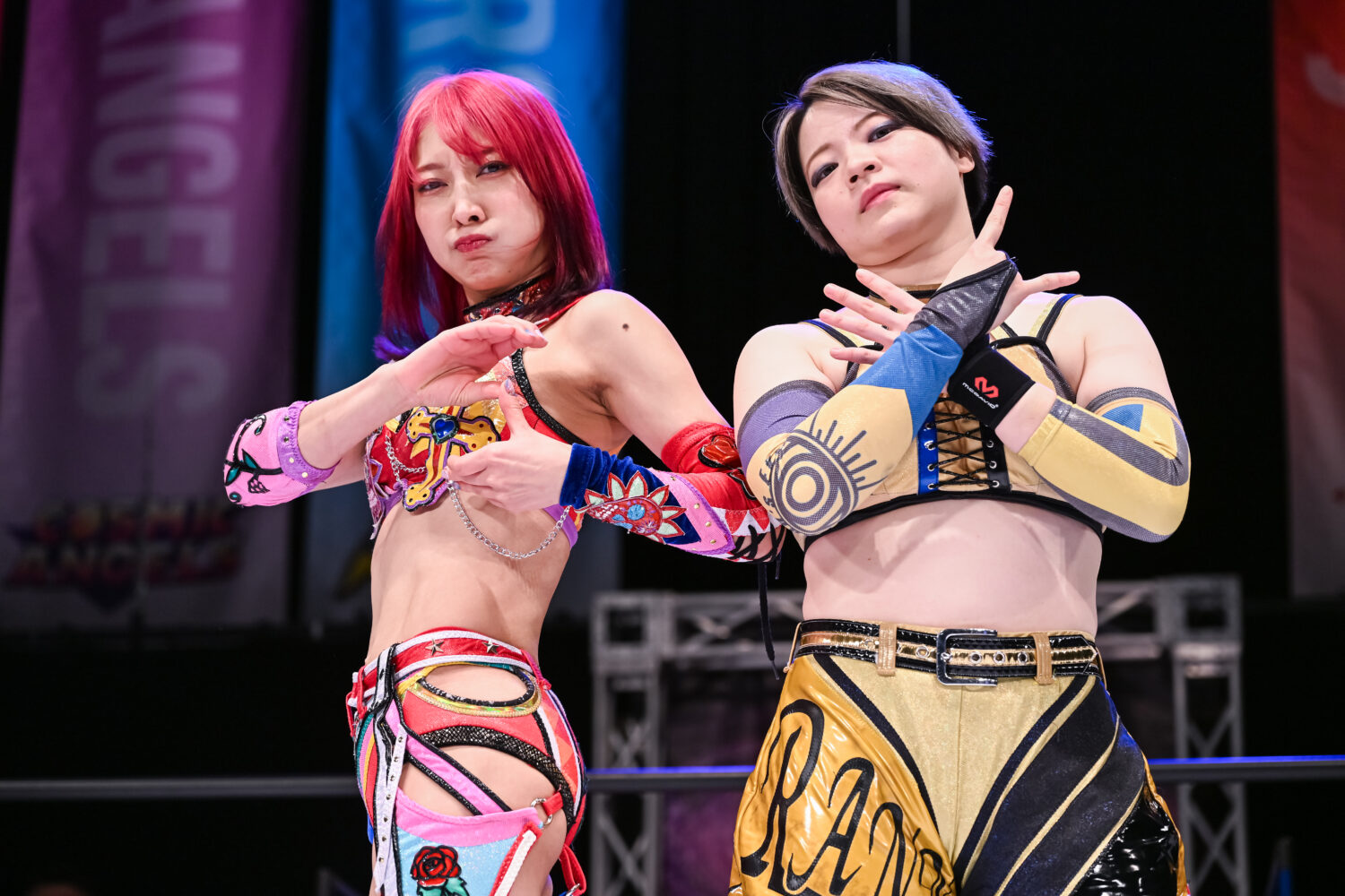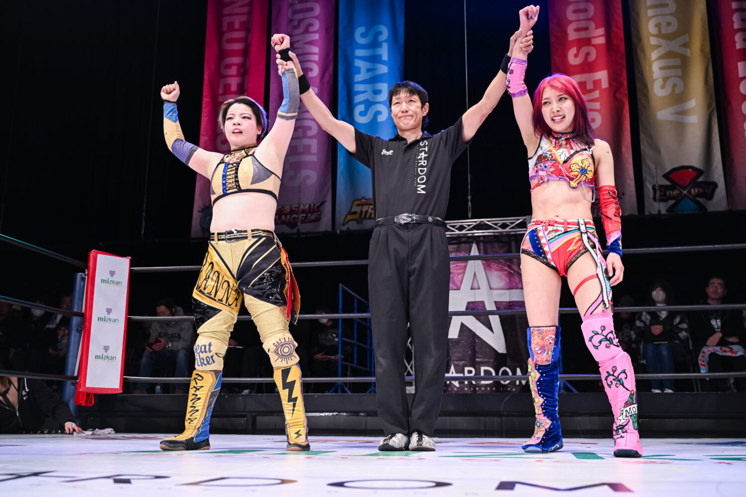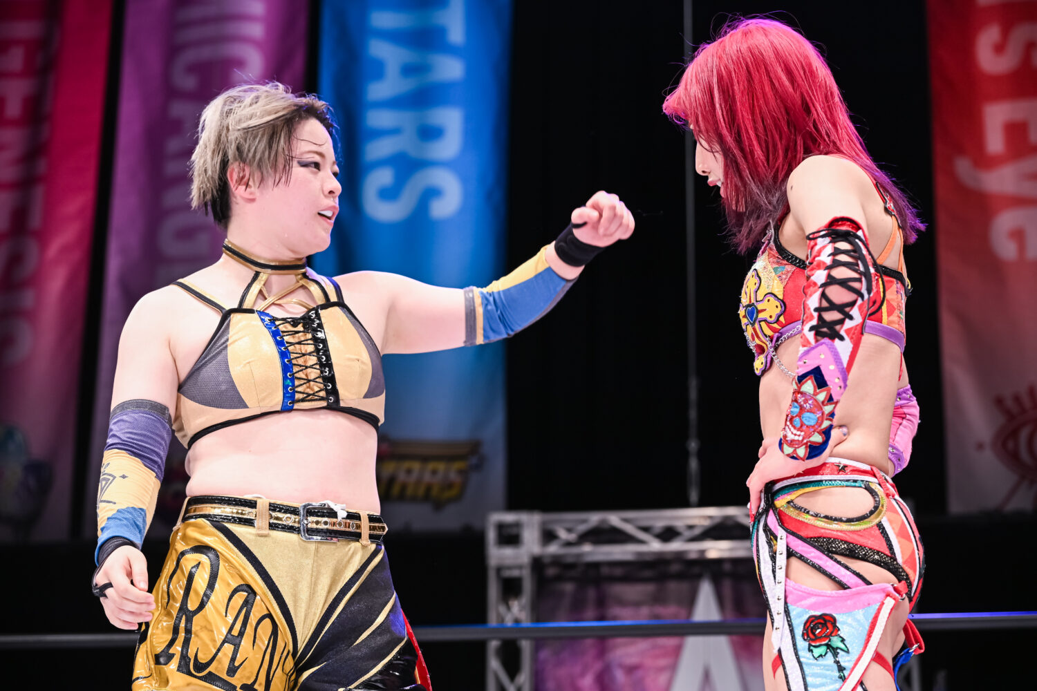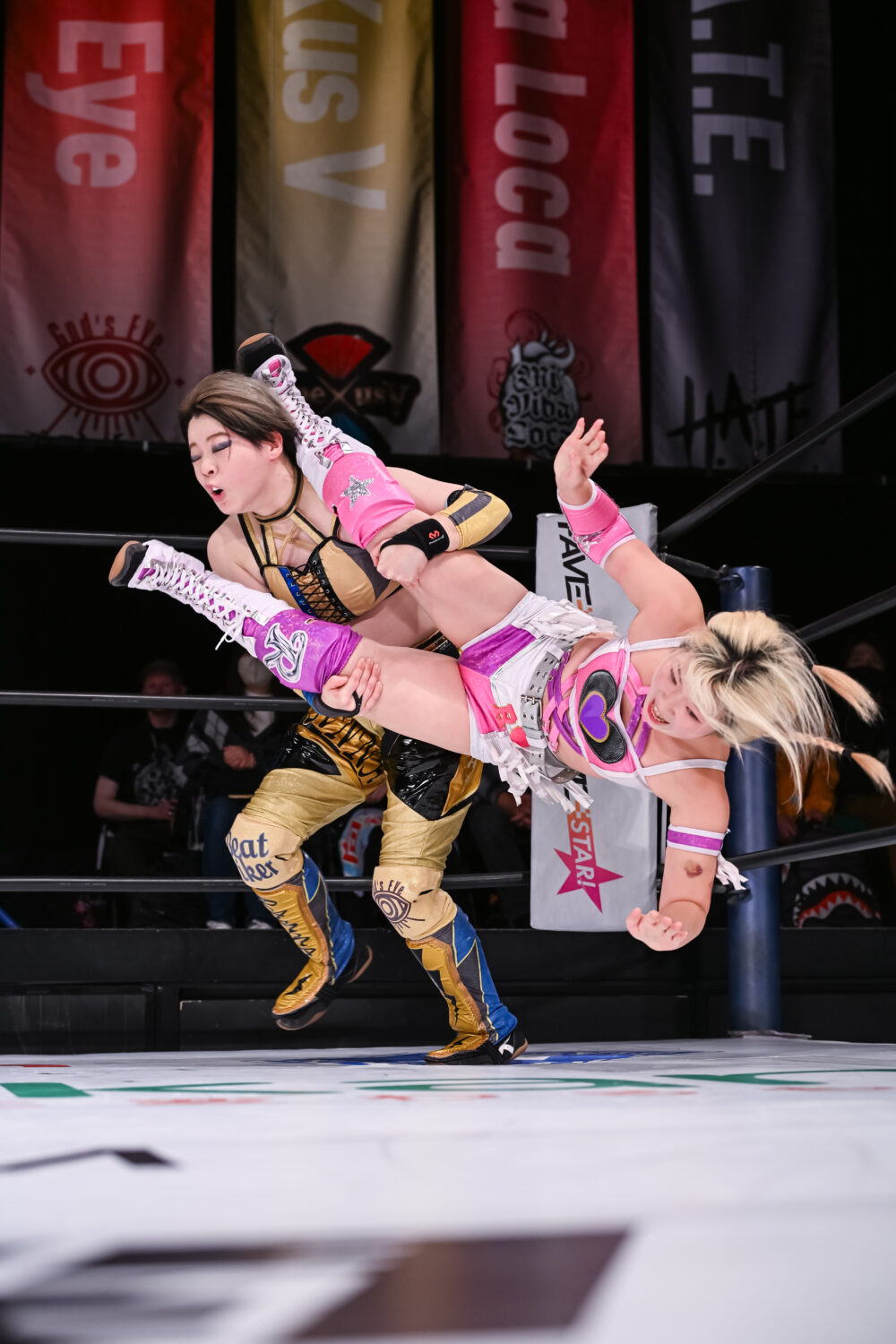 向後と梨杏の先発でゴング。ロックアップから梨杏が腕を取り、向後も応戦。向後が脚を取り、グラウンドにもっていく。向後は立ち上がってヘッドロック。梨杏がロープに振り、向後がアームホイップ。梨杏がドロップキックをかわしてアームホイップのお返しからドロップキックを決める。梨杏がボディースラムを狙うが、向後が反対に叩きつけ、グラウンドで腕を取る。しかし、HANAKOがカットに入る。八神が梨杏にアームブリーカーの連発から左腕にエルボードロップ、ニードロップ、サッカーボールキック。向後が梨杏にストンピング連打。梨杏がカウンターでクロスボディー。替わったHANAKOが向後にショルダータックル、八神にも打ち込み、向後、八神に次々とボディースラム、その場跳びボディープレス。向後が返すと、HANAKOはブレーンバスター狙い。向後が切り返してドロップキック、変型619、ネックブリーカー。八神がHANAKOへドロップキック、ミドルキック連打、ドロップキック、ミドルキック。HANAKOが返すと、先回りしてビッグブーツ。梨杏が八神にクロスボディー、コルバタ、ドロップキック。八神が返すと、梨杏の突進にミドルキック、串刺しハイキック、サッカーボールキック。梨杏が返すと、八神は腕十字。HANAKOがカットし、向後も場外に投げ捨てて、八神にボディースラム、梨杏がフットスタンプ、スリーパー。八神がエスケープすると、梨杏のフィッシャーマンをかわして向後がトラースキック、八神がゼロ戦キック。返した梨杏に、八神はフィニッシュを宣言。しかし、梨杏が蹴りをかわして丸め込む。向後がカットし、八神と合体。しかしHANAKOがまとめてラリアット、梨杏がセカンドから八神にボディーアタック。梨杏の突進に八神がハイキック、変型腕固めのビートマスター。梨杏がギブアップし、八神の勝利となった。