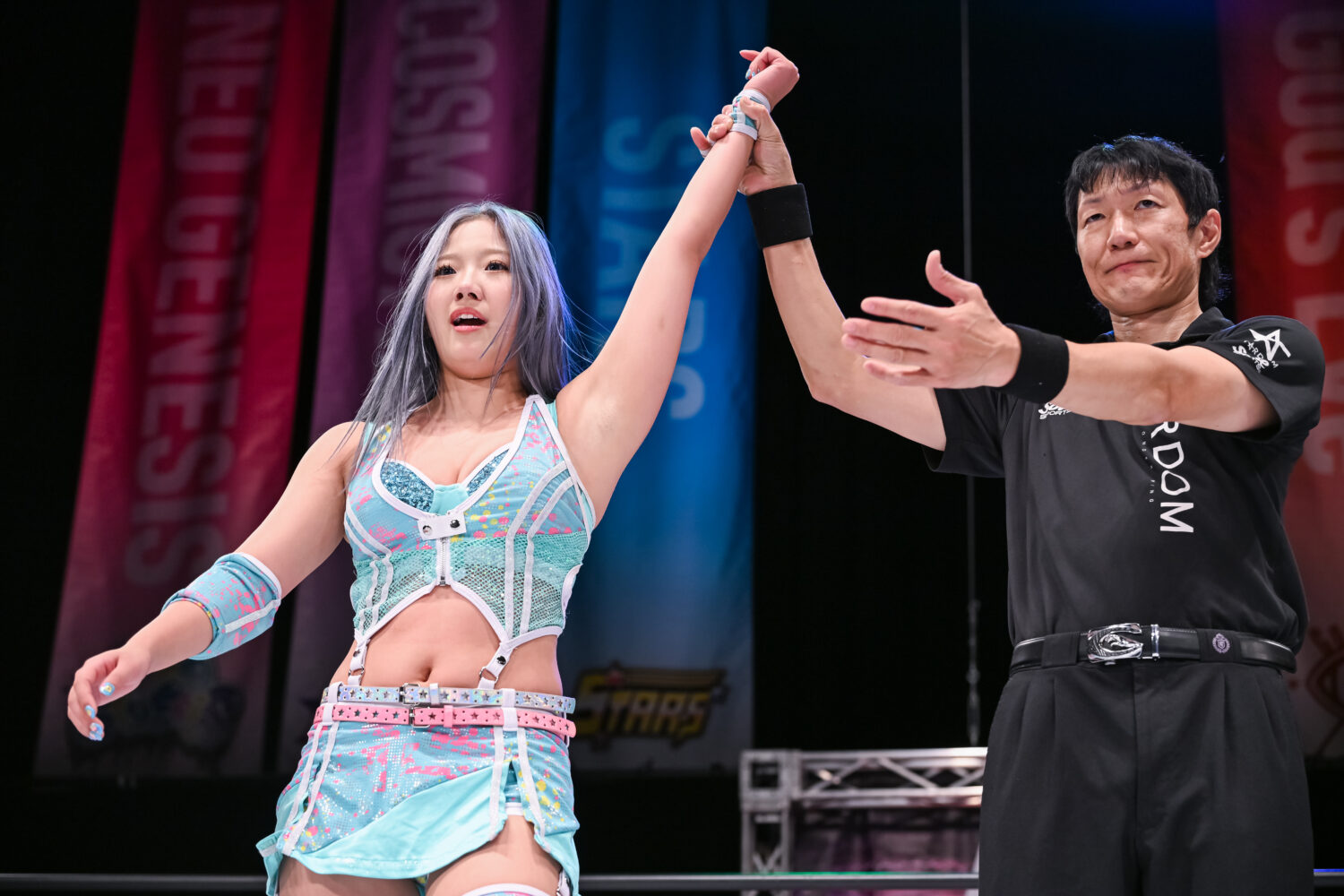 試合が始まると、上谷がリングを下りて高みの見物を決め込む。天咲が月山にヘッドロック。月山が「上谷、助けて!」と助けを求める。上谷はエプロンから見つめるのみ。すると月山が切り返して、天咲にヘッドロック。こんどは天咲が、「上谷さん、QQのときいっしょだったでしょ」と助けを求める。上谷は「沙弥様って呼んだらやってやるよ!」。そのままリング上での闘いが続き、月山が上谷にヒップバット連打。そこに上谷がカットに入って、天咲にはドロップキック、ボディースラム。上谷は月山とのダブルを要求、と見せかけ、天咲の上にボディースラム。上谷は片足で天咲をカバー。天咲が返すと、上谷はロープに固定して攻撃、エプロンでカカト落とし。天咲が返すと、上谷が挑発してエルボーの打ち合い。上谷は顔面蹴りで天咲を倒すが、DDTを食らう。月山が天咲にドロップキック、「沙弥様にヒップバットいくぞ!」と予告するが、蹴飛ばされる。月山は上谷に串刺しヒップアタック、天咲にダブルを要請。天咲が戻り合体を試みるが、上谷が天咲を踏み台に月山にフットスタンプ。月山は上谷にパロ・スペシャル、後方から天咲がスリーパー。上谷がエスケープすると、天咲がまとめてドロップキック、まとめてDDT。上谷、天咲、月山がエルボーの応酬。上谷が月山をかわし、天咲と共闘するように月山にエルボー。月山がまとめてヒップアタック、天咲に極楽ドン狙い。上谷がカットし、まとめてニールキック、天咲が上谷を丸め込むと月山が丸め込み。上谷も丸め込み、月山が天咲を捕らえる。そこに上谷がまとめて丸め込み。2人が返してドロップキック。月山が、天咲をエプロンの上谷に当てて丸め込む。切り返した天咲が月山を丸め込むと、3カウントが入った。試合後、上谷が月山を蹴散らしてリング下に落としてみせた。