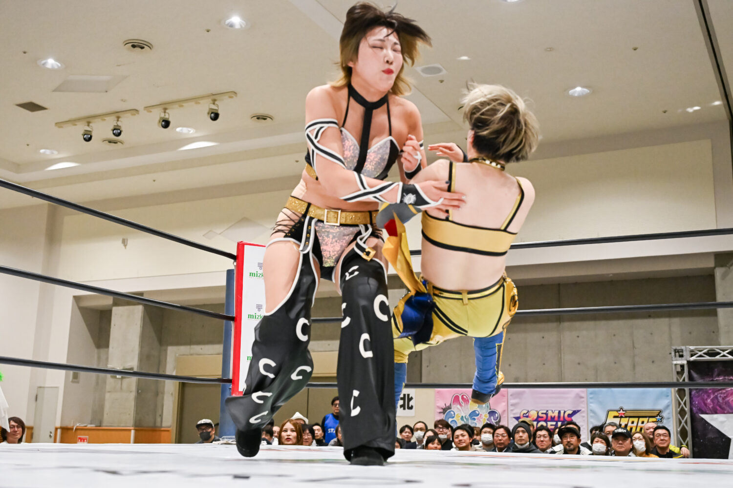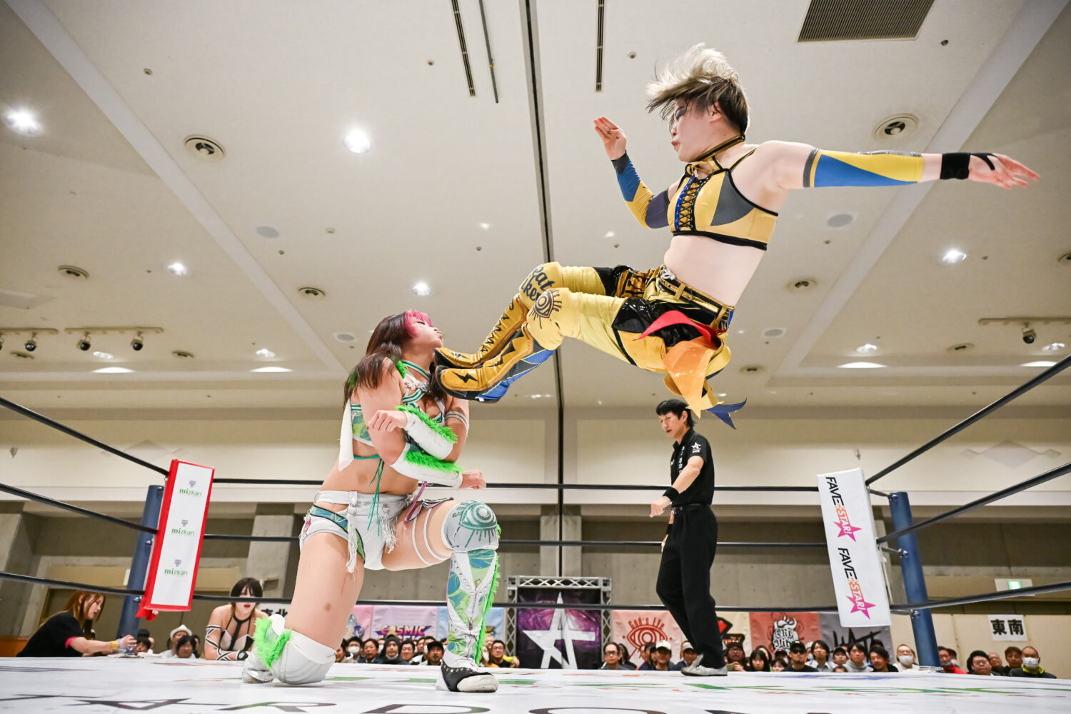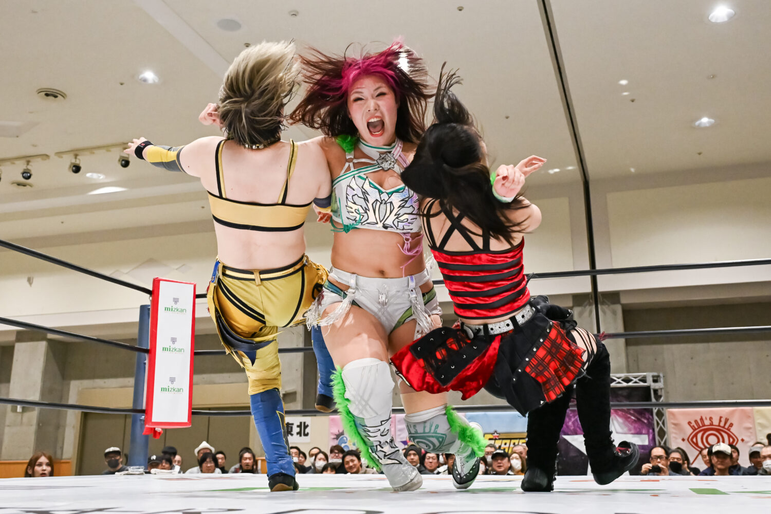 壮麗と八神が先発を買って出て試合がスタート。探り合いから八神がタックル、壮麗がバックを取りにいくと、八神が首を取りにいく。腕の取り合いから八神が締め上げてヘッドロック。壮麗が持ち上げるが、八神がグラウンドにもっていく。壮麗のヘッドシザーズを八神が脱け出す。レディが古沢にショルダータックル、ジャイアントスイングを狙う。古沢が必死にロープエスケープ。八神と合体を試みるが、壮麗が入ってダブルのショルダータックル、レディが古沢、壮麗が八神にジャイアントスイングの競演。壮麗は途中で失敗するが、レディは20回転に成功する。壮麗は場外でフラフラ状態に。レディは、古沢を何度もカバー。しのいだ古沢をレディが高々と持ち上げてボディースラム。壮麗が古沢にストンピング連打、ロープに追い込み逆水平を連打して、背中にボディーアタック。古沢が返してエルボー連打、壮麗が「もっとこいよ!」と受けて立つ。逆水平で古沢を吹っ飛ばした壮麗だが、トリッキーな動きからドロップキックを食らう。八神もドロップキックでつづき、ミドルキック連打でコーナーに追い込む。そこにレディが乱入。しかし、八神がかいくぐり、まとめて串刺しハイキック、壮麗にサッカーボールキック。壮麗が返すと、八神に串刺しボディーアタック。八神が3連続でチョップをかわし突進、ここで壮麗のダブルチョップを浴びる。レディが八神にショルダータックル連発、ニードロップ。八神が返すと、レディにドロップキック、PK。古沢がドロップキックをレディに連打し、アンクルホールド。レディが切り返してビッグブーツを叩き込んでコブラツイスト。古沢がエスケープも、レディがビッグブーツ。八神が乱入して古沢とダブルのドロップキック。古沢がレディにアンクルホールド。しかし、壮麗がカットに入る。10分経過。古沢がレディの脚をロープにかけてドロップキック。壮麗が入り、レディとダブルでマットに叩きつける。レディが古沢にネックブリーカー。古沢が返すと、レディはチョークスラムを狙う。古沢が切り返してアンクルホールド。レディがなんとかエスケープ。古沢は「決めるぞ!」と絶叫し、持ち上げようとする。レディがこらえると、古沢がエルボー連打。残り3分。レディをかいくぐり八神のハイキックから古沢が丸め込む。カットした壮麗が2人まとめてラリアット。レディが古沢に狙いすましてビッグブーツ。3カウントが入り、レディが古沢を破った。