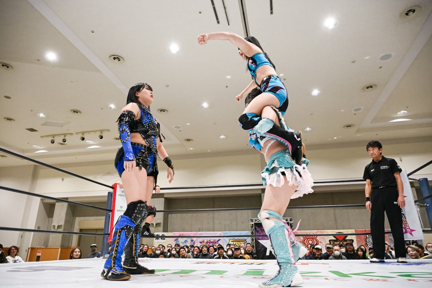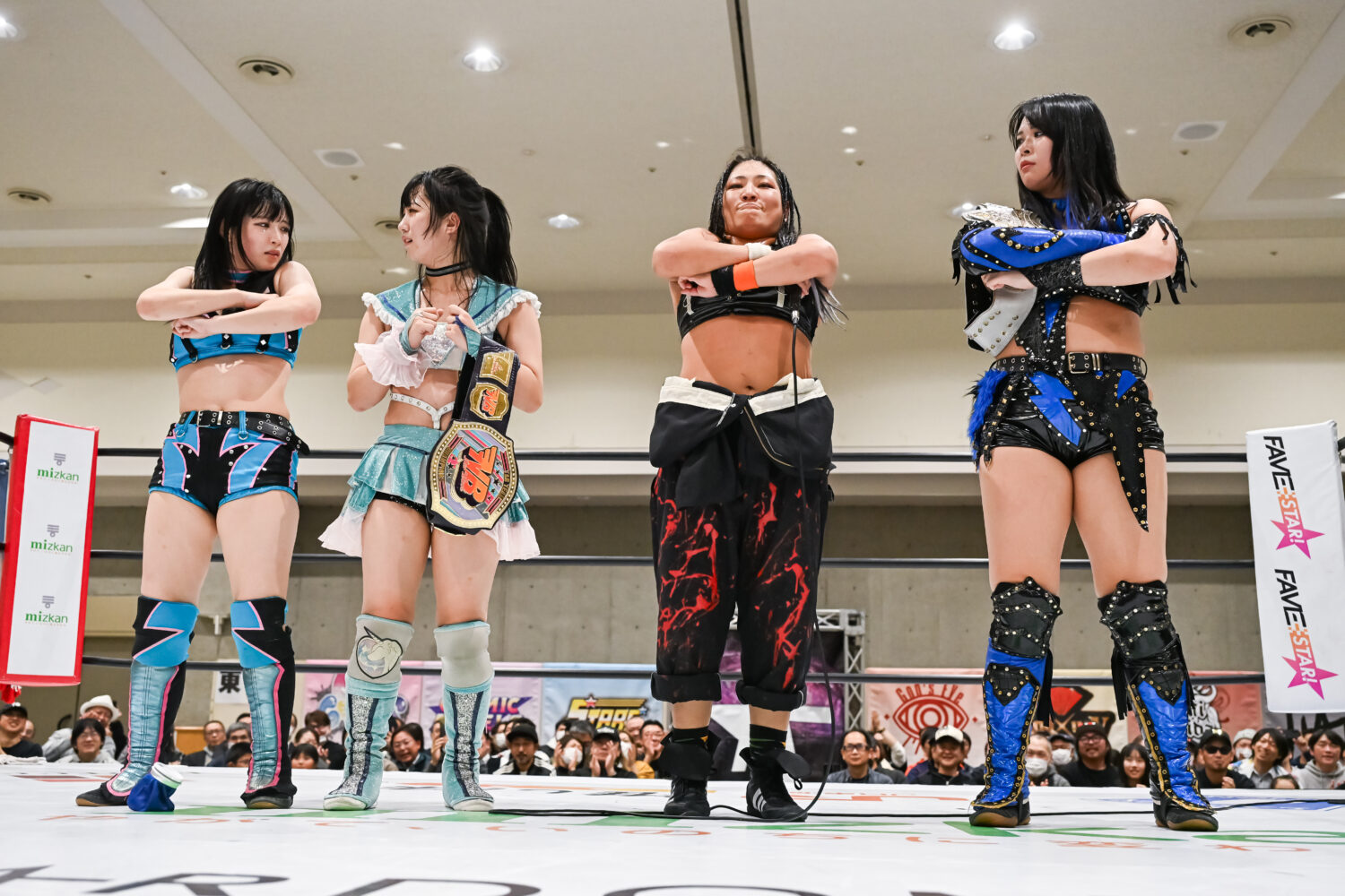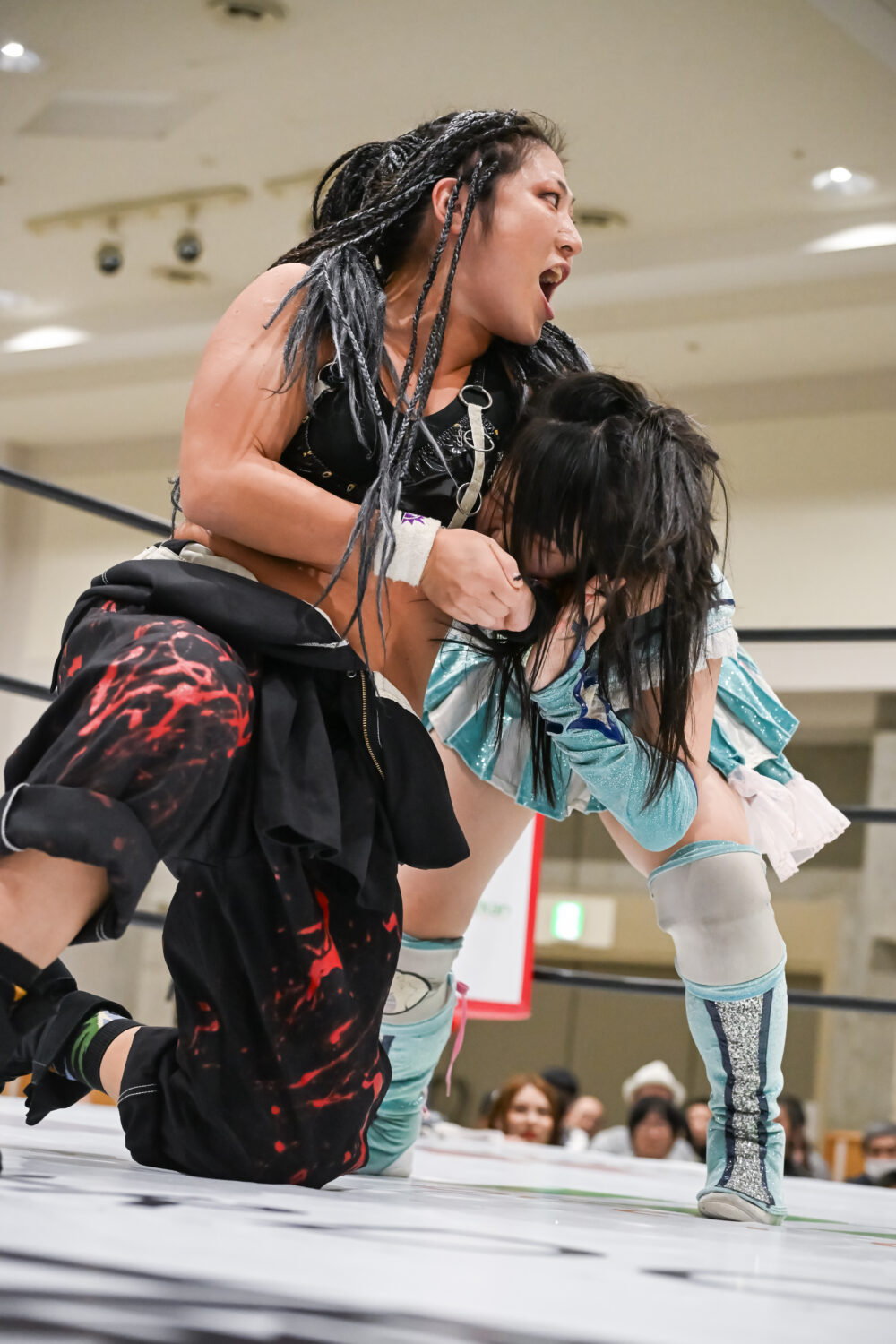 山下が先発に名乗りを挙げると、コズエンからは玖麗が出てくる。バックの取り合いから玖麗が腕を取ると、山下がヘッドロックで締め上げる。玖麗がロープに振ろうとするが、山下が体重をかけて拒否、髪を引っ張りロープに振ると、ドロップキックをかわしてヘッドロックでグラウンドへ。玖麗が切り返して視殺戦。さくらとHANAKOが対峙すると、HANAKOが「こいよ」と手を上げる。さくらが手を伸ばしてジャンプも届かず。HANAKOは、さくらの頭を叩く。玖麗がさくらを肩車。さくらが上からHANAKOの頭を叩く。すると、山下が肩車しようとするが上がらず。山下の提案でHANAKOが山下を肩車で持ち上げる。両軍が肩車してやり合い、山下が勝つ形に。そのままの状態でさくらと玖麗がロープに振ると、HANAKOと山下の肩車が崩れる。山下とHANAKOがさくらを捕獲して、ダブルのショルダータックル。山下が「押忍!血みどろ女塾」のポーズをとろうとするが、HANAKOには通じず。さくらが山下にエルボー連打。山下が打ち勝ち、コーナーに追い込む。さくらが反転してミサイルキック。玖麗が山下にドロップキック。もう一発狙うが、HANAKOが乱入して阻止。山下が突進も、HANAKOに誤爆し、さくらがドロップキック。山下が玖麗にニーの連打、玖麗がフライングエルボーアタック、山下がこらえてHANAKOに託す。HANAKOが玖麗にショルダータックル連打。玖麗が返すと、HANAKOが担ぎあげる。玖麗が切り返してスリーパーで飛びつく。しかし、HANAKOが前方に投げてニードロップ。かわした玖麗がドロップキック。さくらが串刺しニーからエルボー連打、サッカーボールキック。HANAKOが返すと、山下が乱入してラリアット、HANAKOがボディースラム。しかし、さくらの肩が上がる。HANAKOはブレーンバスターを狙うが、玖麗が阻止してさくらとダブルでドロップキック。HANAKOが返すと、さくらはコーナーに上がってダイブ。HANAKOが受けとめてブレーンバスター。返されたHANAKOだが、フィニッシュを宣言してアルゼンチン。JPコースター狙いをさくらが切り返して三角絞め。HANAKOが持ち上げてパワーボム。10分経過。返したさくらにHANAKOが突進、玖麗がスピアをぶち込み、さくらがキック。しかし、山下がカット成功。玖麗は山下にスピア。さくらがHANAKOにキックの連打。HANAKOがかわして高々とバックドロップ。返したさくらに、HANAKOはフィニッシュを宣言してアルゼンチンからJPコースターを決める。3カウントが入り、HANAKOがさくらをフォールした。