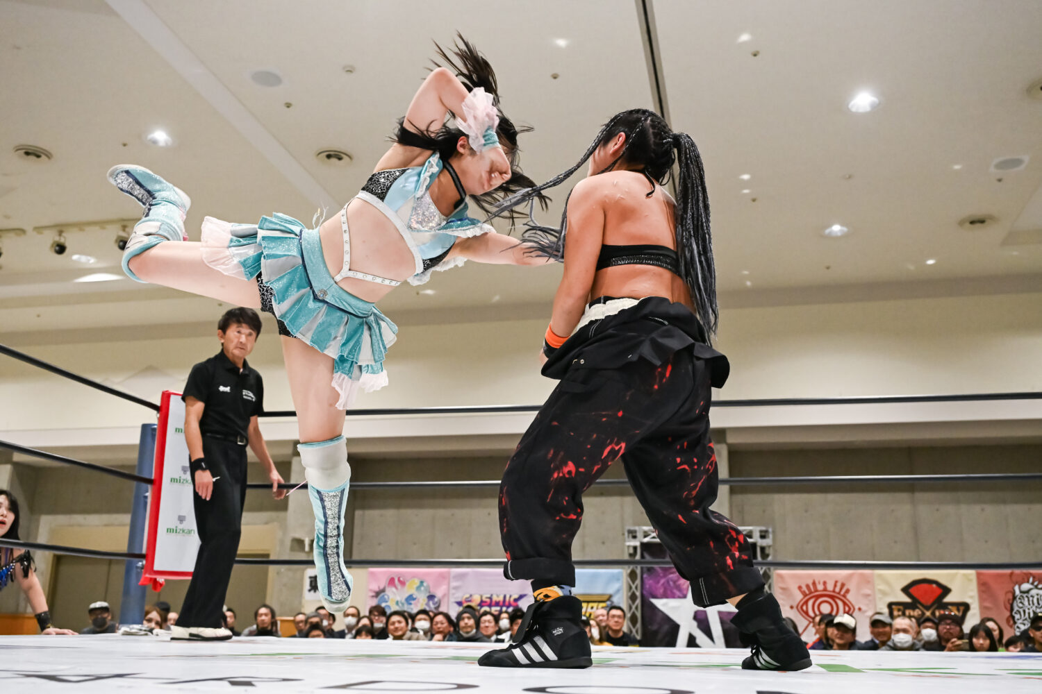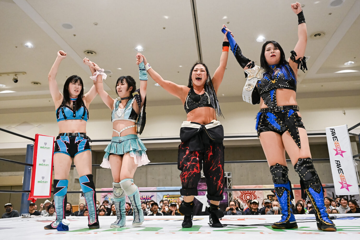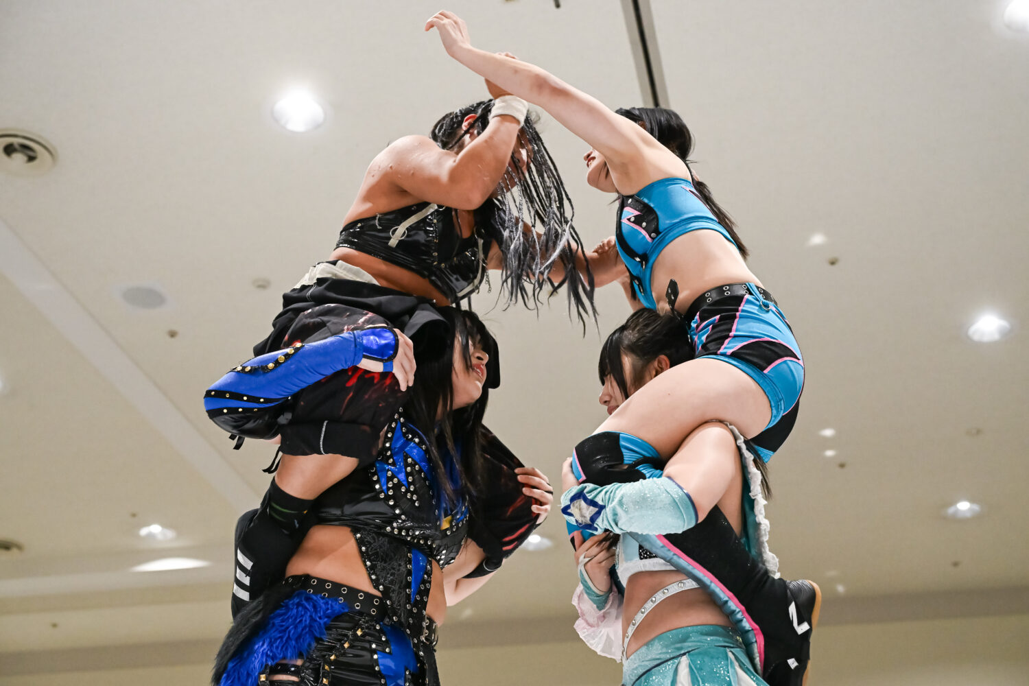 山下が先発に名乗りを挙げると、コズエンからは玖麗が出てくる。バックの取り合いから玖麗が腕を取ると、山下がヘッドロックで締め上げる。玖麗がロープに振ろうとするが、山下が体重をかけて拒否、髪を引っ張りロープに振ると、ドロップキックをかわしてヘッドロックでグラウンドへ。玖麗が切り返して視殺戦。さくらとHANAKOが対峙すると、HANAKOが「こいよ」と手を上げる。さくらが手を伸ばしてジャンプも届かず。HANAKOは、さくらの頭を叩く。玖麗がさくらを肩車。さくらが上からHANAKOの頭を叩く。すると、山下が肩車しようとするが上がらず。山下の提案でHANAKOが山下を肩車で持ち上げる。両軍が肩車してやり合い、山下が勝つ形に。そのままの状態でさくらと玖麗がロープに振ると、HANAKOと山下の肩車が崩れる。山下とHANAKOがさくらを捕獲して、ダブルのショルダータックル。山下が「押忍!血みどろ女塾」のポーズをとろうとするが、HANAKOには通じず。さくらが山下にエルボー連打。山下が打ち勝ち、コーナーに追い込む。さくらが反転してミサイルキック。玖麗が山下にドロップキック。もう一発狙うが、HANAKOが乱入して阻止。山下が突進も、HANAKOに誤爆し、さくらがドロップキック。山下が玖麗にニーの連打、玖麗がフライングエルボーアタック、山下がこらえてHANAKOに託す。HANAKOが玖麗にショルダータックル連打。玖麗が返すと、HANAKOが担ぎあげる。玖麗が切り返してスリーパーで飛びつく。しかし、HANAKOが前方に投げてニードロップ。かわした玖麗がドロップキック。さくらが串刺しニーからエルボー連打、サッカーボールキック。HANAKOが返すと、山下が乱入してラリアット、HANAKOがボディースラム。しかし、さくらの肩が上がる。HANAKOはブレーンバスターを狙うが、玖麗が阻止してさくらとダブルでドロップキック。HANAKOが返すと、さくらはコーナーに上がってダイブ。HANAKOが受けとめてブレーンバスター。返されたHANAKOだが、フィニッシュを宣言してアルゼンチン。JPコースター狙いをさくらが切り返して三角絞め。HANAKOが持ち上げてパワーボム。10分経過。返したさくらにHANAKOが突進、玖麗がスピアをぶち込み、さくらがキック。しかし、山下がカット成功。玖麗は山下にスピア。さくらがHANAKOにキックの連打。HANAKOがかわして高々とバックドロップ。返したさくらに、HANAKOはフィニッシュを宣言してアルゼンチンからJPコースターを決める。3カウントが入り、HANAKOがさくらをフォールした。