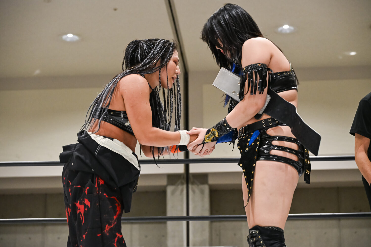 山下「今日はホントは鈴季すずと組んで、さくら、玖麗、キミたちと試合をするはずだったんだけど、すずが欠場になっちゃって。HANAKO、今日初めて試合をしましたね。すごい心強かったです。ホントにありがとう。わたくし、押忍!血みどろ女塾というタッグの塾長をしておりまして、今日HANAKOは仮入塾だったんだけど、なんかみなさんの反応を見て、これは間違いないと思った。キミも、今日から塾生だ。ありがとう、ようこそ。そして、HANAKOだけじゃない。さくらも玖麗も対戦して、キミたちの熱い気持ちとかすごく心に身体に染み渡った。キミたちも今日から血みどろ女塾としてよろしくお願いします。ありがとう!ありがとう! みなさん拍手してますけど、血みどろ女塾は年齢性別国籍なんか関係ありません。ここにいる来てくれた青森(八戸)のみなさん、アナタたちも今日から血みどろ女塾のメンバーです! 血みどろ!血みどろ! ありがとう。締めよう。押忍!血みどろ女塾って言って締めよう。後半戦もみなさん楽しんでください。押忍!血みどろ女塾!」
