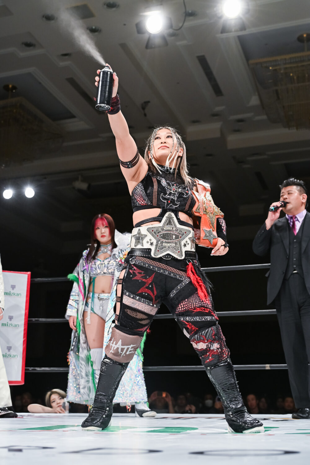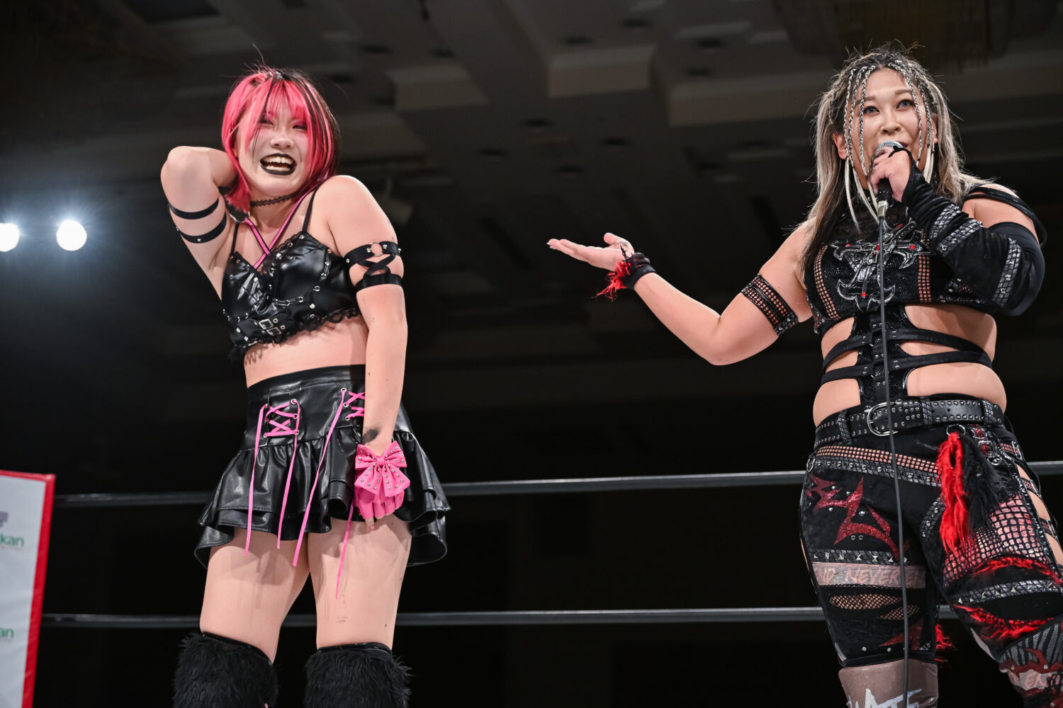 吏南「タッグリーグ5戦目、無事私たちが北海道の最終戦メインを勝ったということで、もう2敗してて、もう負けられない状況だったんで、今日は勝ててよかったなって思うし、もう負けられないので、私と新しいお姉ちゃんの小波でこのまま勝って勝って勝って、決勝では現ゴッデスチャンピオンのBMIと闘って、私たちがBMIをぶっ潰したいと思います」