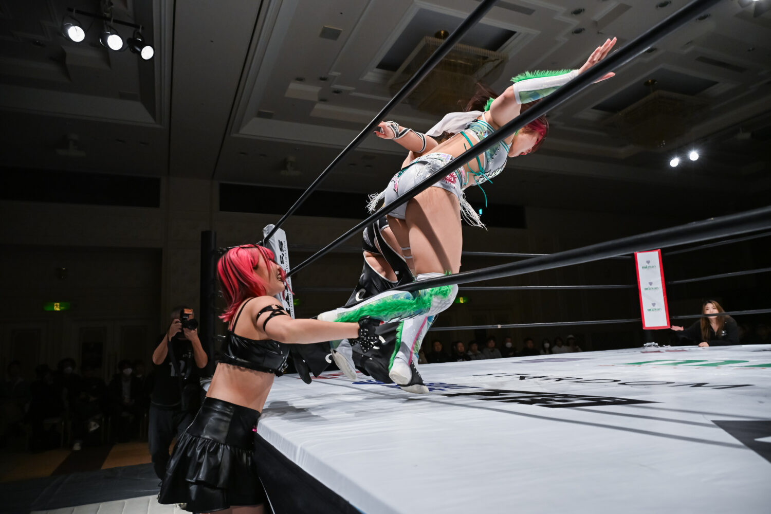 壮麗と小波が先発で対峙。小波が腕を取り、壮麗も応戦。壮麗がヘッドロックも、小波が切り返してサッカーボールキック。壮麗がショルダータックル、小波が髪を引いて叩きつける。レディが入り壮麗とダブルのショルダータックル。リング下から吏南が脚を引いて小波がドロップキック、場外戦に突入する。リングに戻ると、壮麗をロープに固定して2人がかりで攻撃。吏南が壮麗にヘアーホイップ、顔面を踏みつける。小波もつづいて壮麗の顔面を攻撃し、サッカーボールキック。壮麗が返すと、小波はワキ固め。吏南が壮麗にストンピング連打。壮麗は吏南をキャッチしてバックフリップ。レディが吏南にショルダータックル連打。小波がエプロンからカットして吏南と合体を試みる。しかし、レディがまとめてコブラツイスト、吏南にビッグブーツ、ニードロップ。吏南が返すと、レディはバックドロップを狙う。吏南が切り返してビッグブーツ。小波がレディへニーアタック、スライディングキック。レディが向かっていくと、小波がぶら下がり腕十字、逃げられるとPK。小波が打撃の連打、壮麗が乱入してレディとダブルで叩きつける。壮麗が小波へ串刺しボディーアタック、ショルダータックル。壮麗が小波を担ぎあげるが、小波が切り返してワキ固め。壮麗がエスケープすると、小波にダブルチョップ、小波がカウンターのハイキック、PK。吏南が壮麗にドロップキック、串刺しダブルニーアタック。返した壮麗に吏南はノーザンライト狙い。壮麗が切り返すが、吏南が卍固め。しかし、レディがカットする。小波と吏南が次々と壮麗に串刺し攻撃、吏南がダイビングダブルニードロップ。しかし、壮麗が返してみせる。10分経過。吏南がダイビングフットスタンプも壮麗がかわしてレディがビッグブーツ、壮麗がアルゼンチン、レディのネックブリーカーと合体。壮麗がブレーンバスター、フィニッシュを宣言してブルーサンダー狙い。吏南がこらえて払い腰。壮麗がバックを取るが吏南がジャックナイフ、壮麗が返して丸め込みの応酬。レディ、小波がカットする。小波と吏南がレディのネックブリーカーを食らう。残り3分、壮麗が吏南にブルーサンダー。吏南が返すと壮麗は雷の如くの体勢。小波がハイキックでカットして吏南がジャックナイフ。レディがカットも小波がジャーマンで排除。吏南が壮麗にピンクデビルの構え。壮麗が切り返してラリアット。吏南が返すと壮麗はフィニッシュを宣言して雷の如くへ。すると小波がスプレー噴射、吏南がダイビングダブルニードロップ。壮麗が返すと、吏南はピンクデビルの構え、小波がダイブして合体フェースクラッシャー。吏南のピンクデビルが決まり、3カウントが入った。