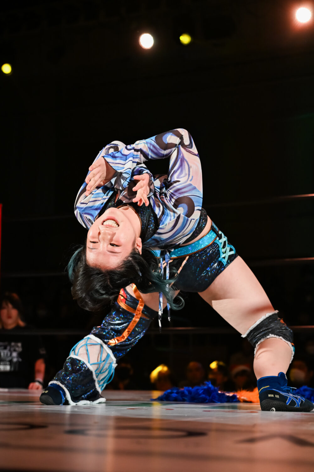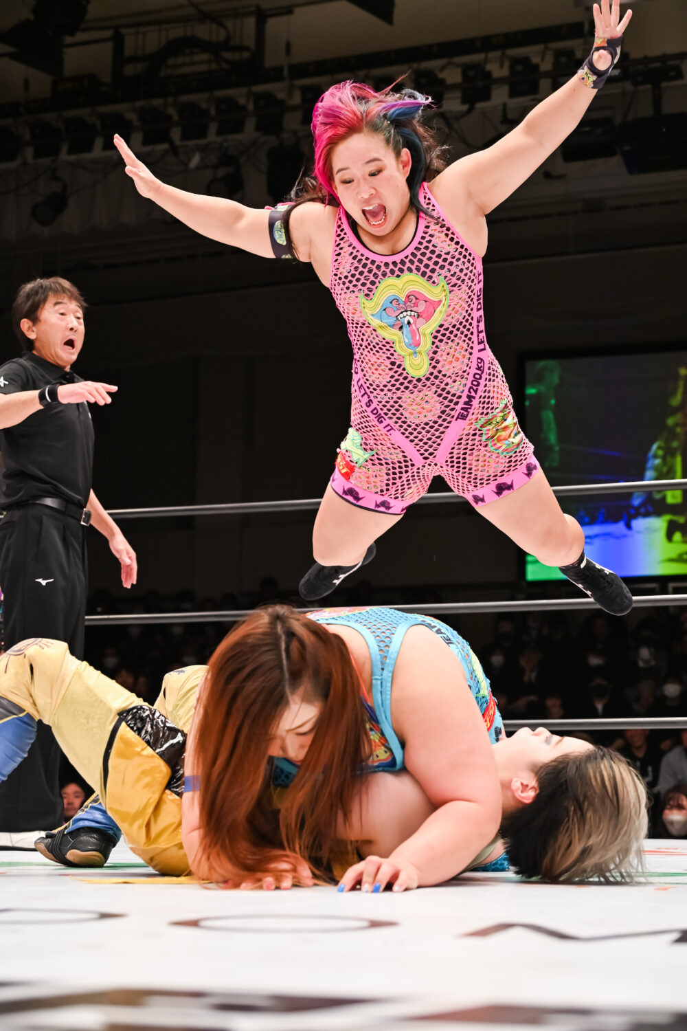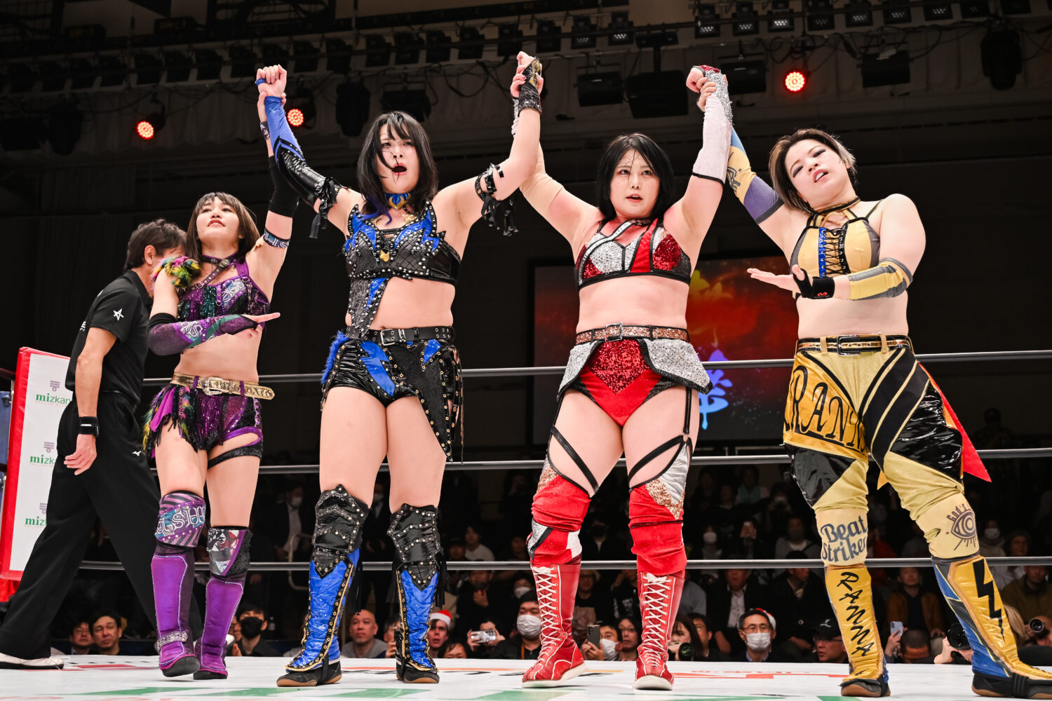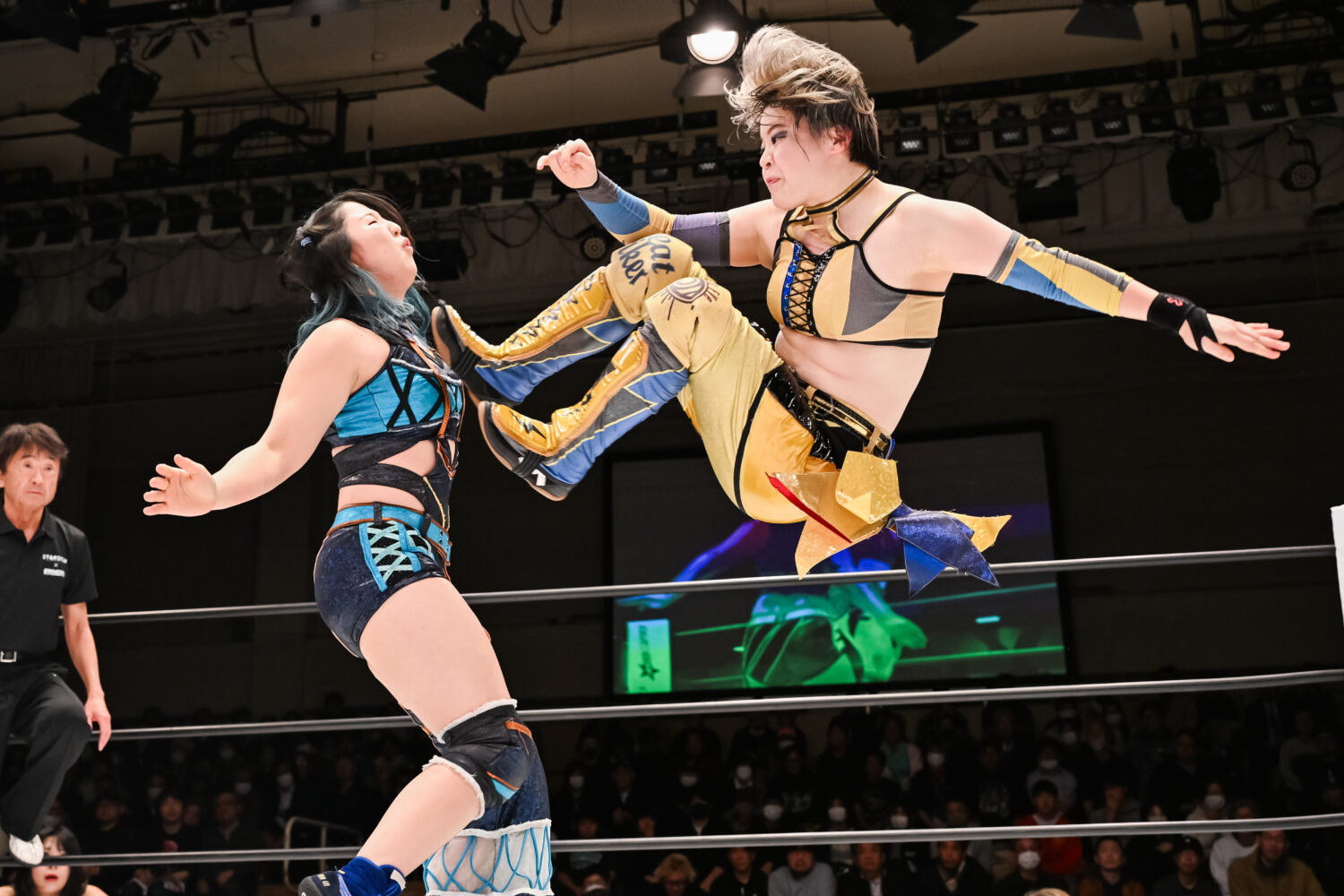 舞華が優宇を指名。橋本たちが優宇を送り出して試合開始。探り合いからロックアップで力比べ。優宇が押し込み舞華が反転。舞華が蹴りを入れて突進、ショルダーをぶつけ合う。優宇が打ち勝つと、舞華がすぐに返してみせる。YUNAが八神とロックアップ、エルボーの打ち合い。YUNAが走らせずにエルボー連打も、ドロップキックを食らう。八神が振ると、YUNAがネックブリーカー。橋本と優宇がダブルでショルダータックル、優宇、橋本が連続のランニングボディープレス。優宇は場外へみたらし団子。八神が戻され、愛海がドロップキック。八神が返すと、愛海はもう一発放つ。八神が返してサッカーボールキック。PKを愛海がかわして突進。八神がかわして串刺しハイキック、ドロップキック、PK。朱里が愛海にドロップキック、フロントネックチャンスリードロップ。愛海がジャンピングニーアタック。橋本が朱里へ串刺しラリアット。ブレーンバスターを切り返した朱里が橋本とエルボーの応酬。橋本が蹴りをつかんでアンクルホールド。朱里がバックキック、橋本がスピアも朱里が受け止める。朱里のバズソーを橋本が捕まえる。朱里はネックロックも、橋本が持ち上げてブレーンバスター。朱里がニーアタック、橋本がカウンターでラリアット。舞華と優宇のラリアットが交錯。舞華とHANAKOが優宇の腕を引く。こらえた優宇が2人に逆水平。優宇がまとめてクロスボディーアタック。舞華が返すと、優宇が起き上がりこぼし式逆水平の連打。エルボーの応酬から優宇が逆水平連打。舞華がエルボー、ラリアット、ローリングラリアット。両者ダウン状態からHANAKOがリングイン、優宇にボディーアタック、優宇が払い腰。YUNAがHANAKOへドロップキック連打、HANAKOがショルダータックル。優宇がセントーン、橋本がサマーソルト、愛海がダイビングボディープレス、YUNAがミサイルキック。10分経過。YUNAに舞華が一派音背負い、朱里と八神がキックの挟み撃ち、HANAKOがボディープレス、アルゼンチン。YUNAが丸め込みの連続も2カウント。混戦からHANAKOがYUNAにビッグブーツ、アルゼンチン、JPコースター。3カウントが入り、HANAKOがYUNAを破った。