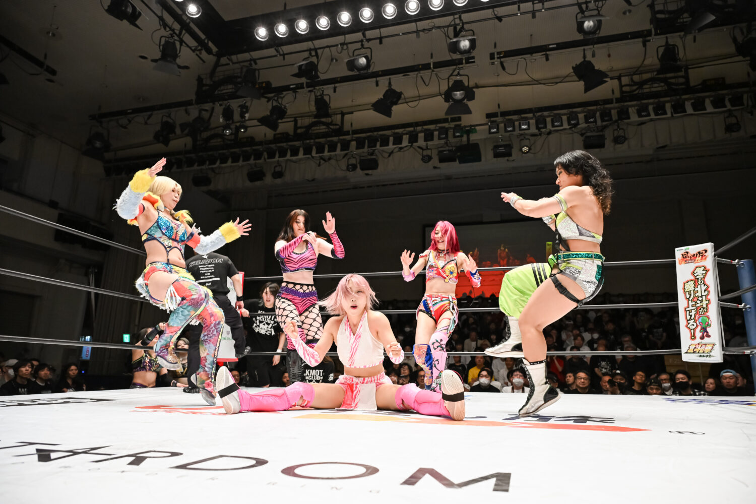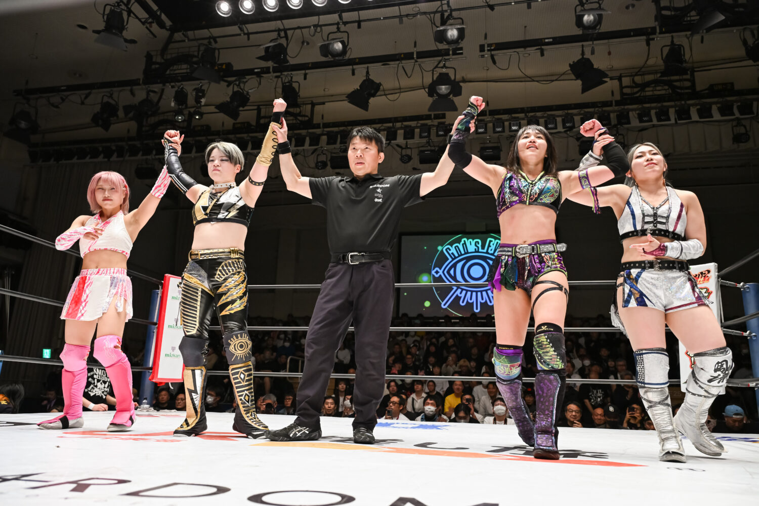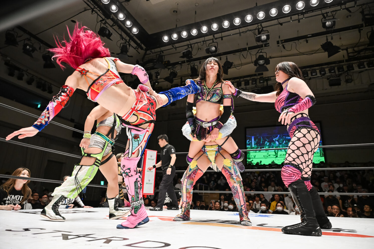 IWGP女子王者の朱里が、4月26日横浜アリーナ大会での防衛戦開催を予告だ。11日の後楽園ホール大会では、稲葉ともか、八神蘭奈、虎龍清花とのGod’s Eyeで、羽南&飯田沙耶&ビー・プレストリー&向後桃と対戦。