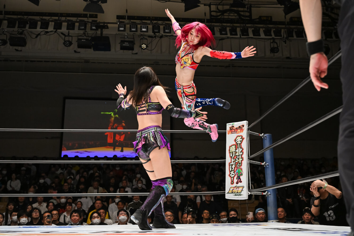 試合後、マイクを握った朱里は「横浜アリーナも、もうすぐですね。私のカードは発表されてないんですけど、このベルトをかけて最高の相手と試合をして、IWGPのベルトの価値を高めていくんで。明日の会見をお楽しみに」と予告した。