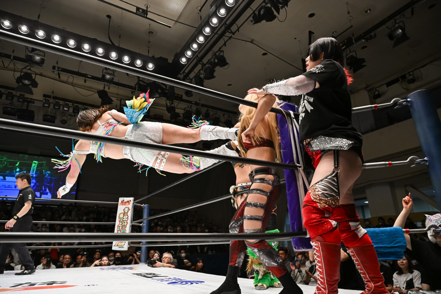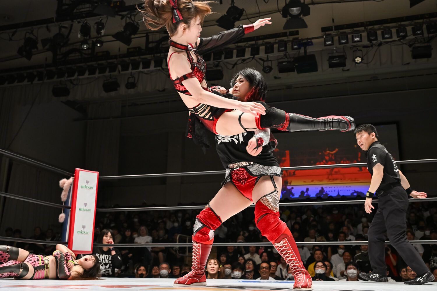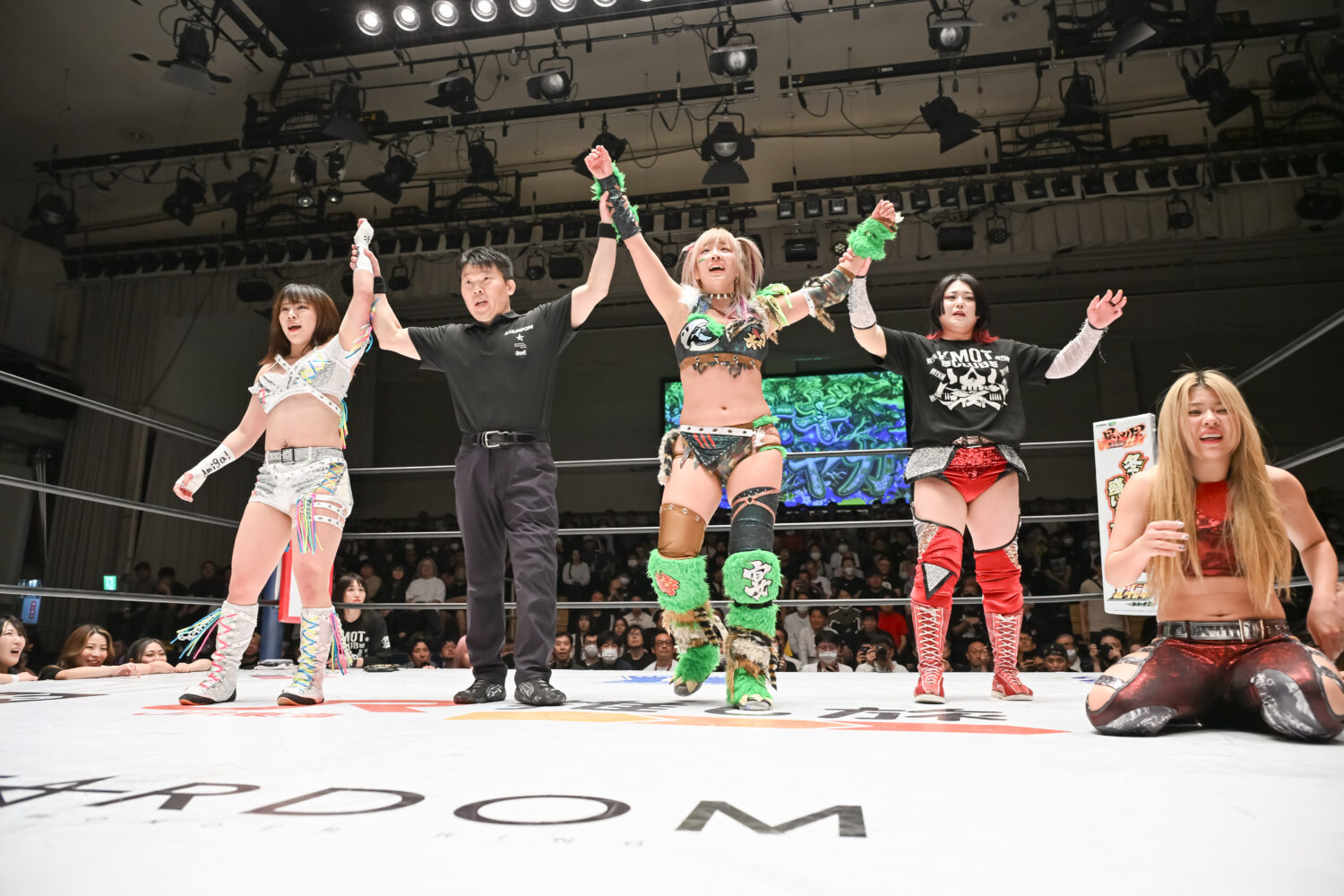 ファイナルロードを歩む鹿島沙希が、因縁のウナギ・サヤカに足をすくわれた。11日の後楽園ホール大会では葉月&コグマのFWCとトリオを結成。舞華&星来芽依&ウナギとスペシャル6人タッグマッチで対戦した。