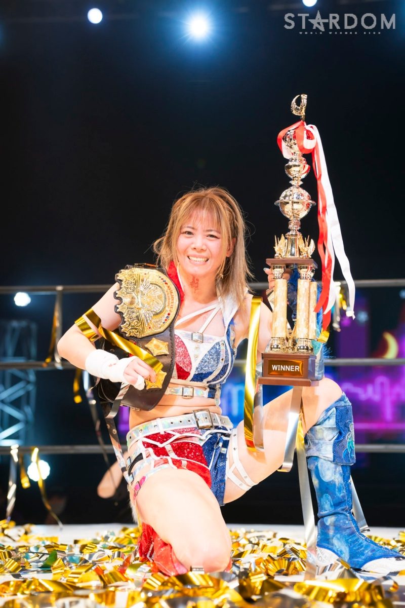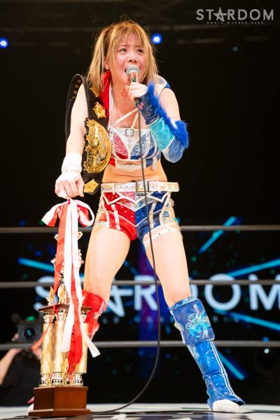 朱里「うっうっ…。1・4、IWGP戦、負けました。メチャクチャ悔しくて、いまちょっとなんて言っていいか…。私は2022年に女子プロレス大賞を取って女猪木宣言をしました。アントニオ猪木さんが巻いたIWGPの名のつくベルトを今日どうしてもこの腰に巻きたかった。そして、岩谷麻優から私があのベルトを取りたかった。私は絶対に絶対にあきらめない。あのベルトを絶対に私の腰に巻いてみせる。絶対に! 叶えてみせる!(涙)」