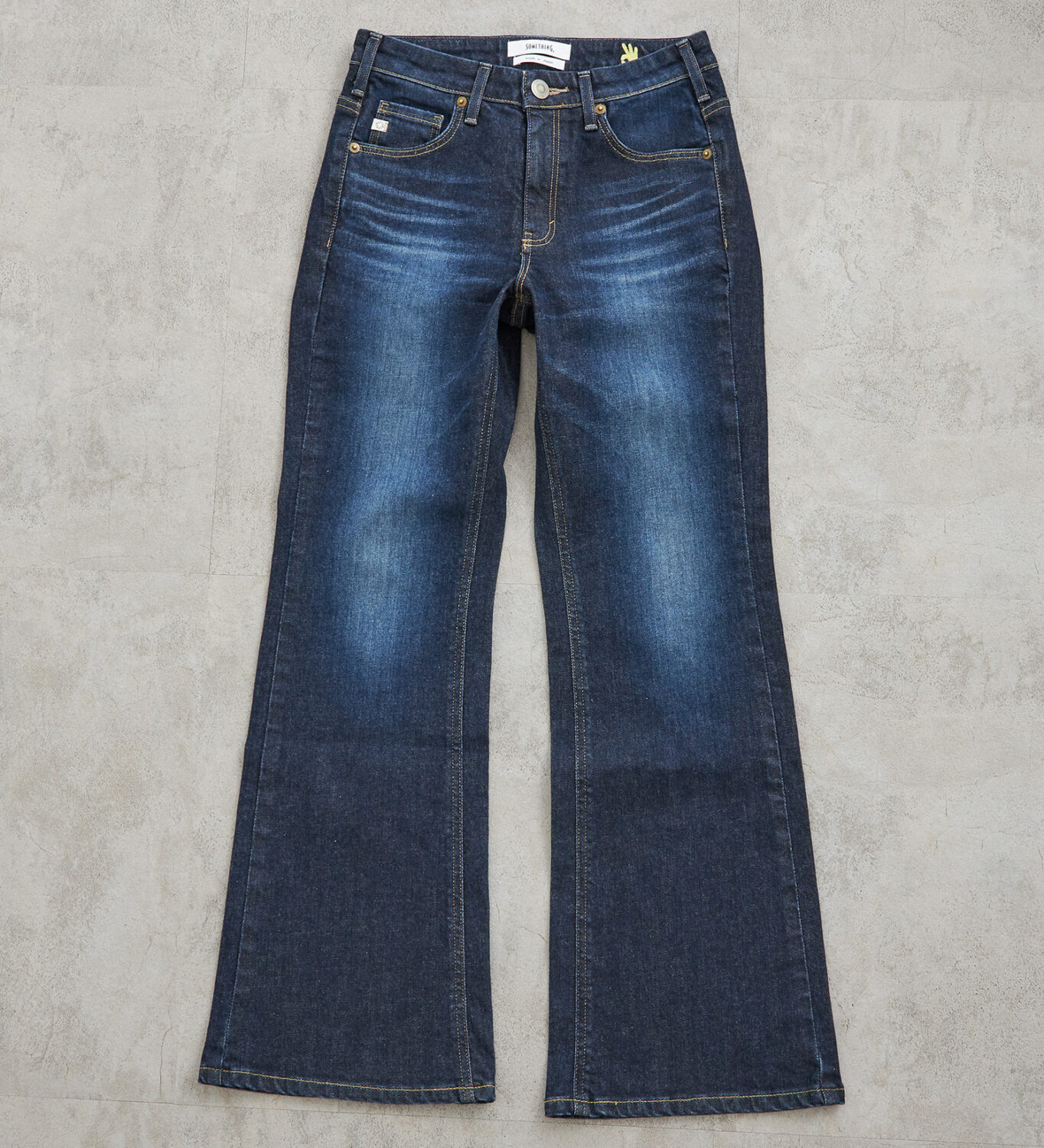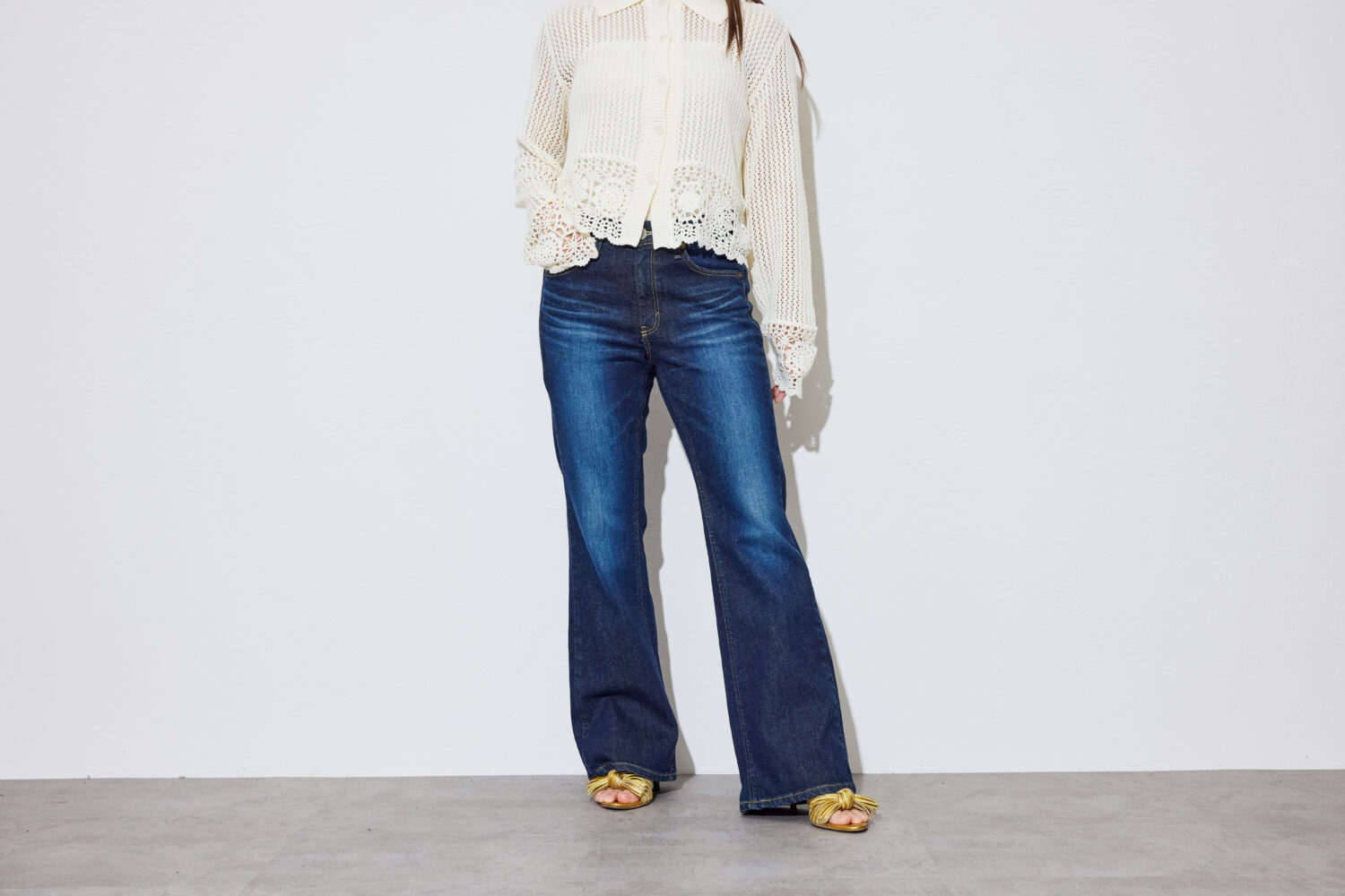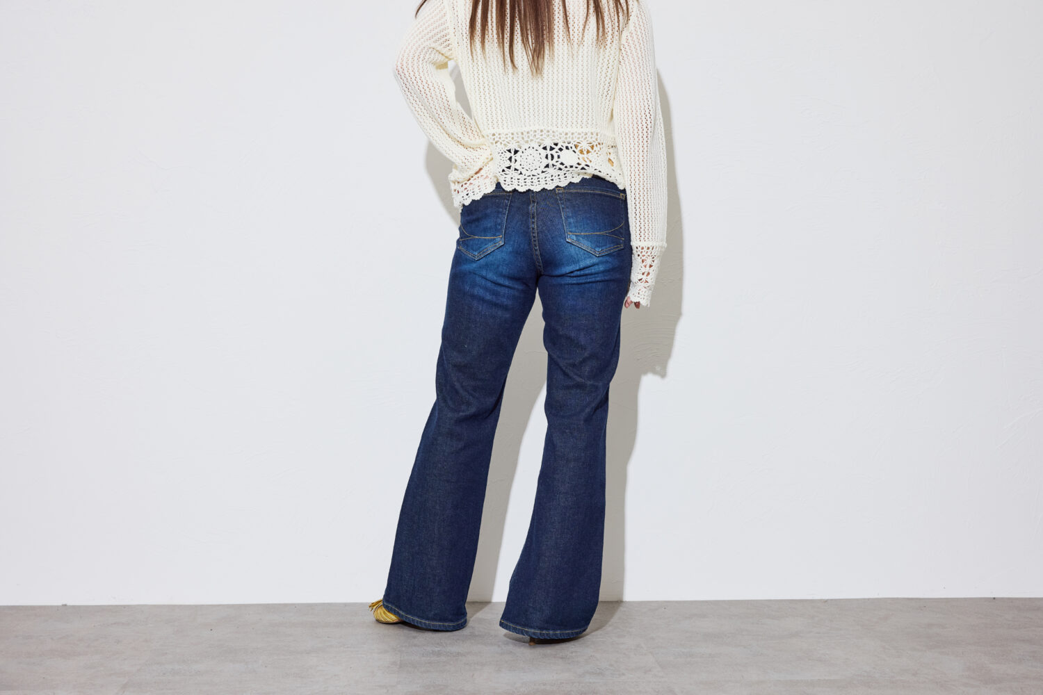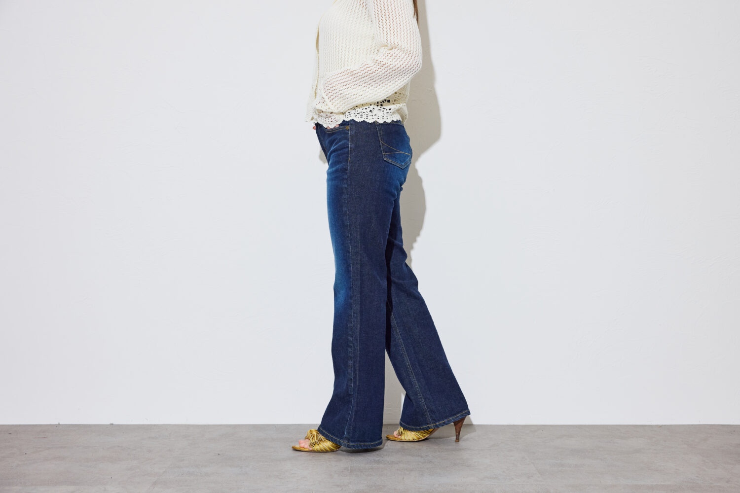 絶妙なレングスと、筋肉質な太ももや腰回りを優しく包むパターンをオリジナルで作成した、究極の美脚フレアデニムです。
