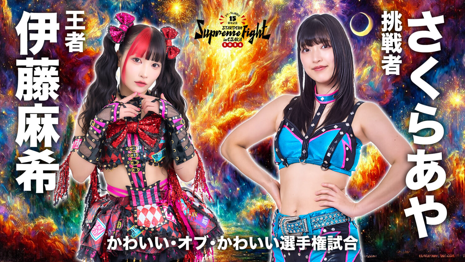 そして伊藤麻希 vs さくらあやの一戦は、かわいい・オブ・かわいい選手権試合に!初代かわいい・オブ・かわいい選手権チャンピオンの伊藤麻希に、さくらあやが挑戦!