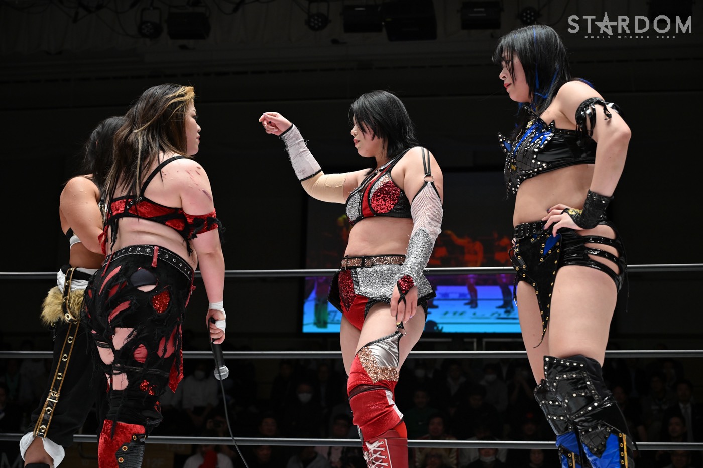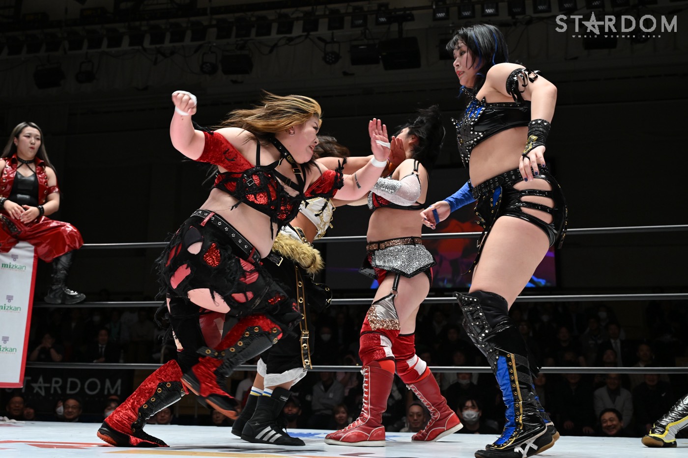 4月8日(水)の後楽園大会では鈴季&山下&青木いつ希のMi Vida Loca(MVL)が、舞華&HANAKO&月山和香の元E neXus Vと対戦。MVLの入場時を舞華組が襲い、いきなりの場外戦が繰り広げられた。
