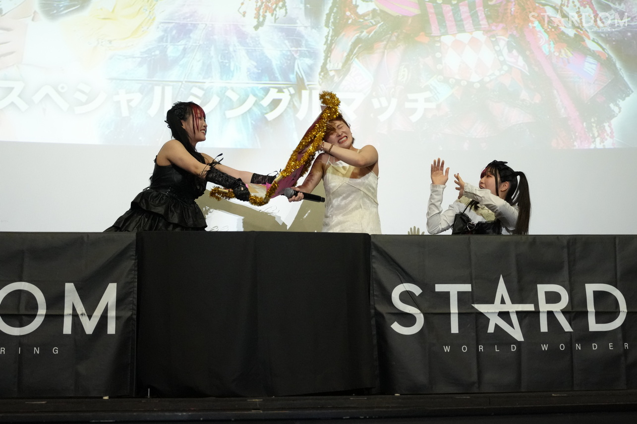 伊藤は「引っかかったな!」と、巨大な「かわいい執念のかたまり」でなつぽいを殴打。「こんな簡単なワナに引っかかるとは、お前もまだまだだな、アクポイ。横浜アリーナでアクポイを下して、スターダムに光をともす。それは伊藤麻希、この私だ。伊藤リスペクト軍団、フォーエバー!」と叫んだ瞬間、今度は執念のかたまりを奪われ、殴られてしまった。