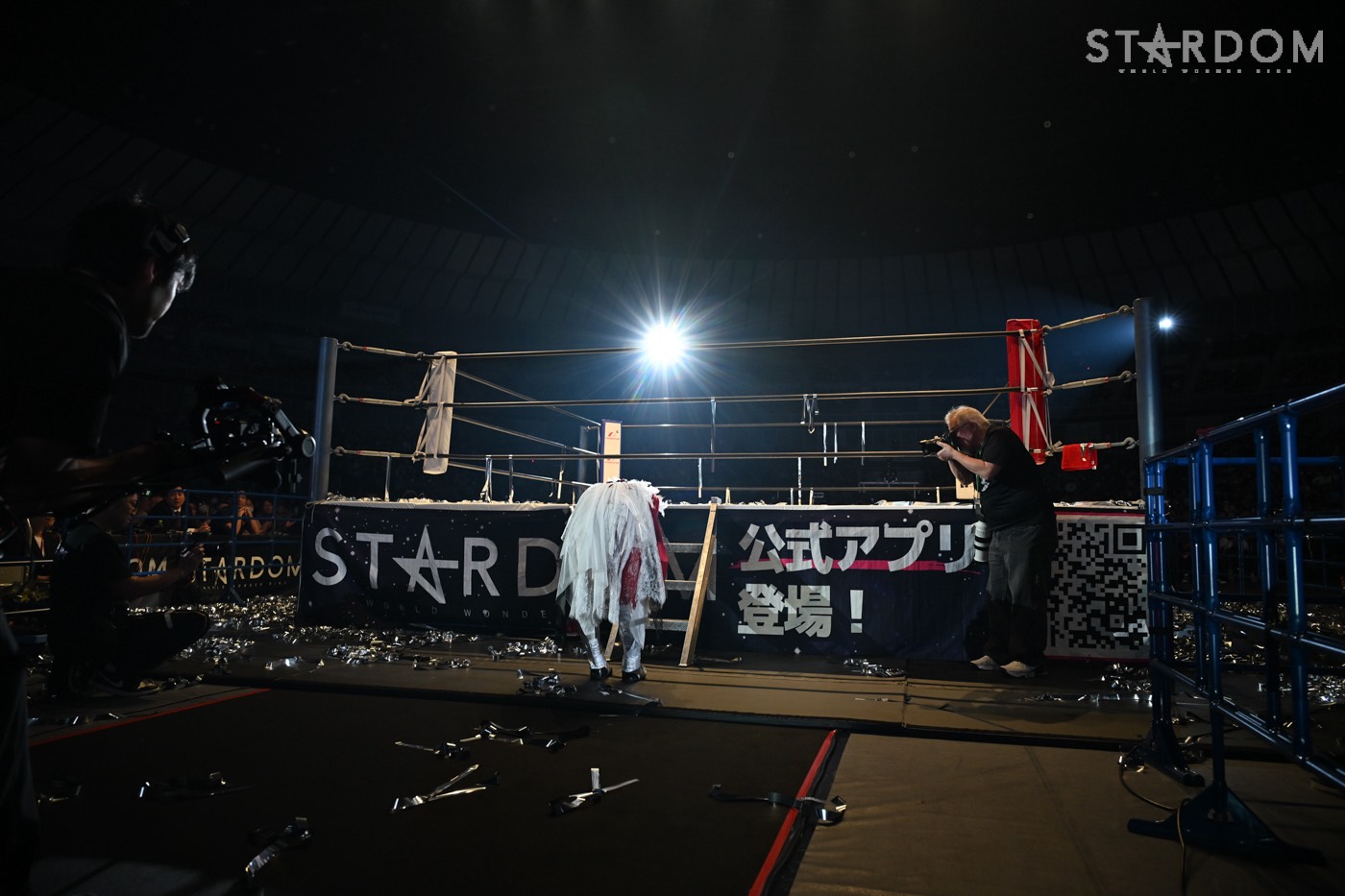 リングに上がった鹿島は「みんな楽しんでる?今日この横アリでの引退の日が決まってから、どうしてもこの目でみんなのことを最後に見たくて来ました。でも、正直、目が悪くて全然見えない。奥とか暗くて全然見えない。そして体力も限界に近づいてきているので、高速10カウントゴング、いっちゃいます」とあいさつした。