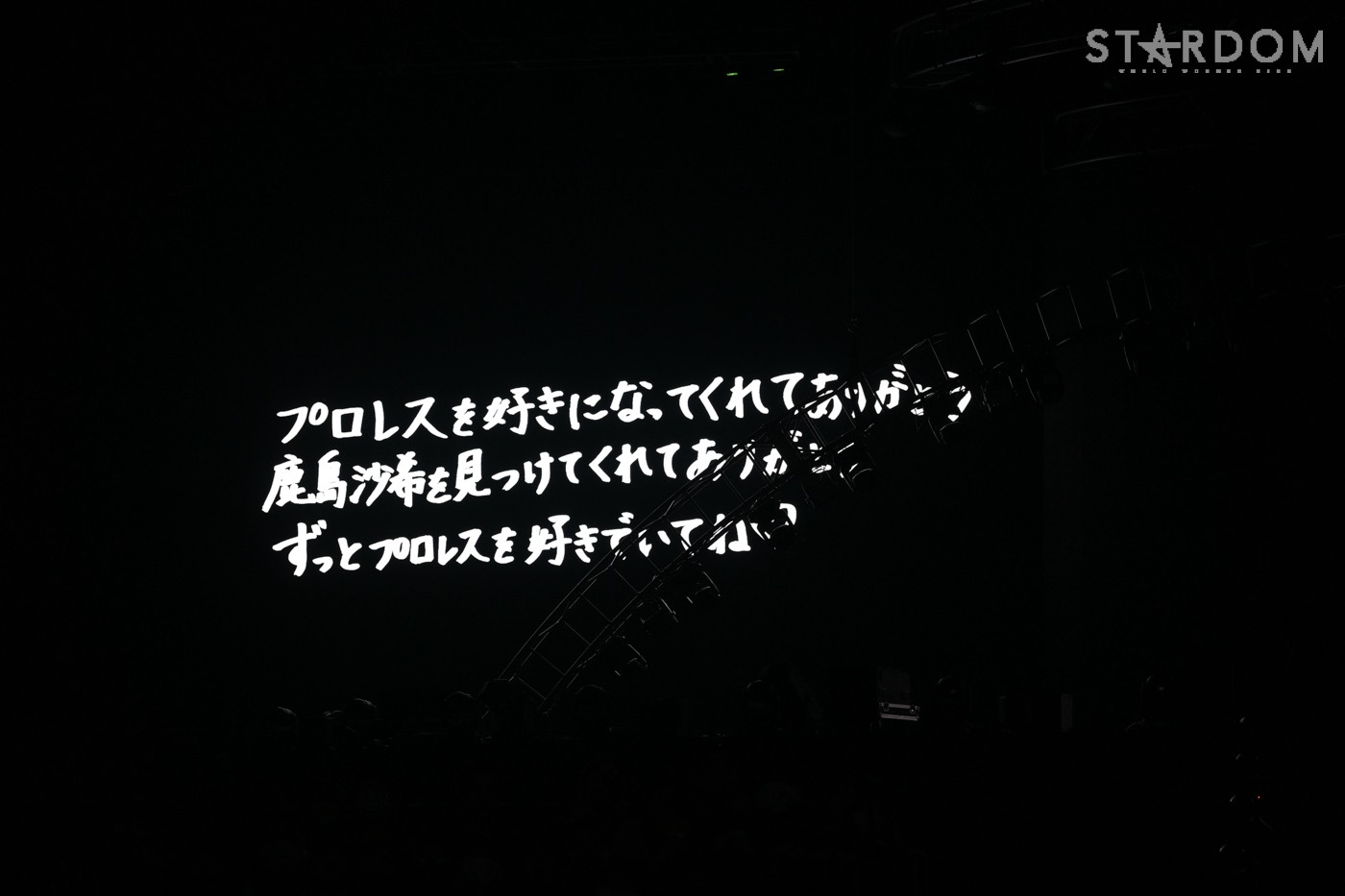 鹿島は「ちょっとカロリー高いって。ビデオメッセージをいただいた有田さんはスターダムを、起死回生を、鹿島沙希をたくさん広めてくれた、プロレスラー鹿島沙希に欠かせない大好きな存在です。そして石井智弘選手はずっと憧れていた、尊敬する、本当に大好きなプロレスラーです。つらいとき、しんどいときは石井さんの試合を見て頑張ってこれました。最後に石井さんとリングに立ちたいという夢があったんだけど、それがかないました」と感無量の表情。
