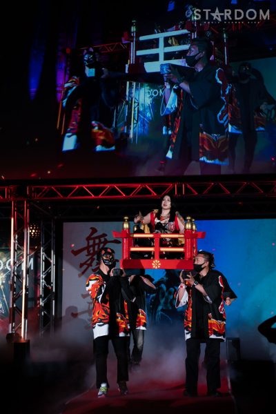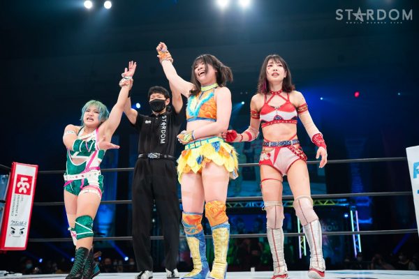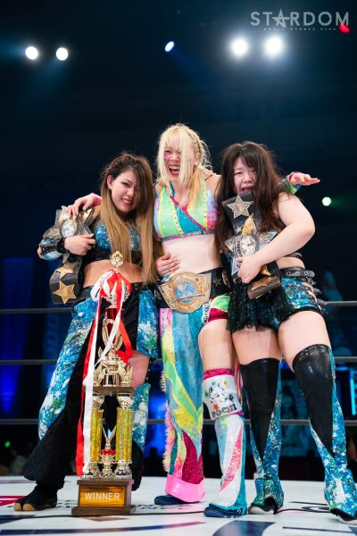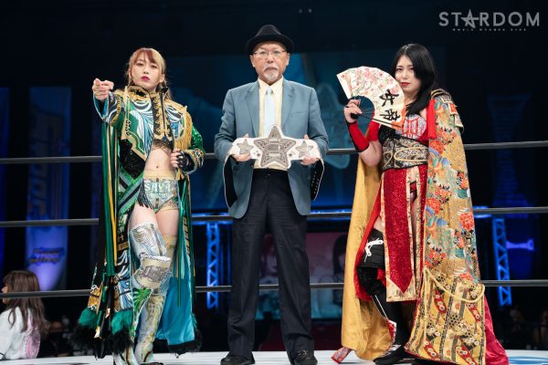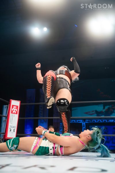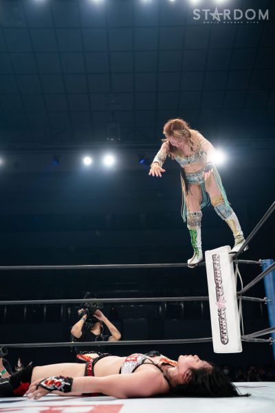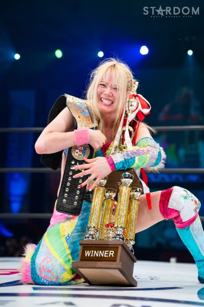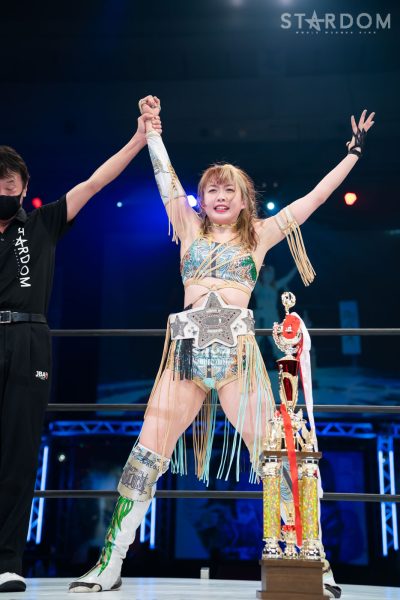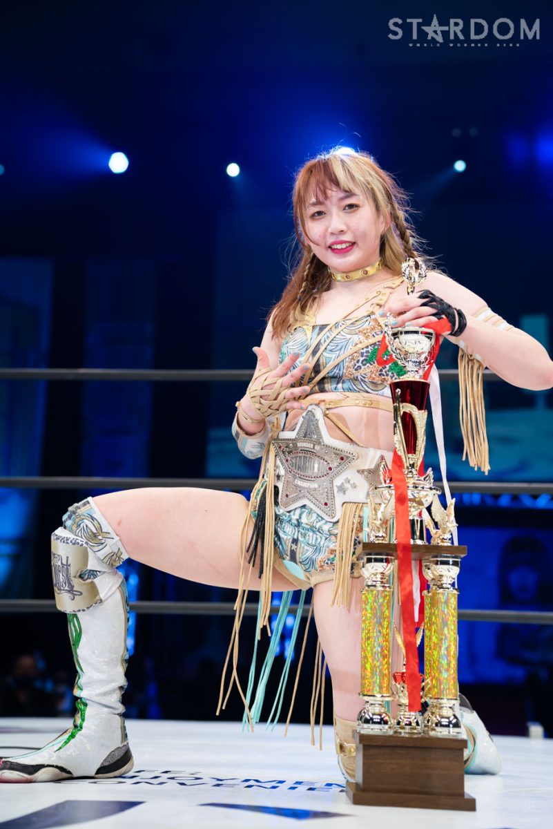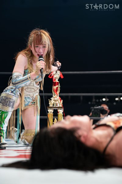 上谷「…お疲れさまでした。ということであらためてワンダー・オブ・スターダム5度目の防衛をしたわけですけども、福岡国際センター、ばってんスターダム、福岡女神、スターダム…違う違う。こんなにたくさんのお客様、お集まりいただきまして、本当に本当にありがとうございます! 福岡の地でこんなにたくさんのお客さんに囲まれて試合ができて本当に本当にうれしいです。これからもスターダムの応援、たくさんたくさんたくさん、全力でよろしくお願い致します! 誰がなんと言おうと、私がスターダムだー!」