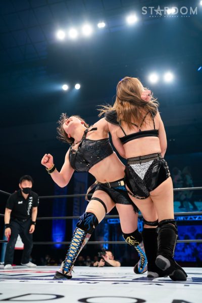 昨年末の両国で大江戸隊の“ブラックデザイヤー”渡辺桃&スターライト・キッドにゴッデス・オブ・スターダム王座を明け渡したSTARSの“FWC”葉月&コグマ組が地元福岡で奪回を目指す。王者組はこれが2度目の防衛戦だが、スパンの短いFWCの挑戦に不満をあらわにしており、前日の熊本大会でもこの試合で防衛したら葉月&コグマ組の挑戦は二度と受けないと宣言。挑む葉月&コグマもベルトを奪回し桃&キッド組の挑戦は受けないと明言した。両軍によるゴッデス戦はこれが最後か? 試合後、ベルトを巻いているのは…?