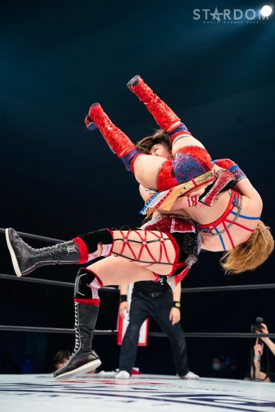 ロックアップで組み合い舞華がヘッドロック。上谷が切り返しグラウンドへ。舞華が首を取ると上谷がバックを取り腕十字狙い。上谷のニールキック、舞華のラリアットがかわされる。上谷が突進すると舞華がショルダータックル、串刺しラリアット。舞華はボディースラムを決めると予告してもう一発。上谷が返すと舞華はスリーパー。上谷がエスケープし、場外での攻防に。上谷が舞華の腕を鉄柱に巻き込んで攻撃。エプロン越しでアームブリーカーも決める。リングに戻ると右腕にストンピング、エルボー連打からアームブリーカー。さらにコーナーに追い込んで右腕を蹴っていくとワキ固めへ。串刺し攻撃をかわした舞華は上谷のスワンダイブを迎撃。上谷の突進を止めてパワースラム。舞華がダッシュすると上谷はフランケンシュタイナー。場外に出た舞華へスワンダイブ式プランチャをぶつける。10分経過。場外でのフランケンを舞華が受け止めエプロンに叩きつける。舞華は上谷をリングに戻し、エプロンでブレーンバスターを放つ。リングに戻すとバックドロップ。しかし上谷が返してみせる。エルボーの打ち合いから上谷が仁王立ちで受けて立つ。すると舞華がエルボー一発で上谷をダウンさせる。上谷が立ち上がると舞華が「こいよ」と挑発。上谷は「なめんな!」とドロップキック。コーナーに上がると舞華が追いつき雪崩式ブレーンバスター狙い。上谷がこらえてパワーボムの構え。舞華がこらえると上谷が下からパンチ。15分経過。上谷がコーナーを上がり雪崩式狙いも舞華がカット。舞華は上谷をコーナーに乗せて雪崩式ブレーンバスターを決める。しかし上谷が返してみせる。舞華が至近距離からラリアット連発。上谷が二段蹴り、張り手。ラリアットをかいくぐりニールキック。舞華がラリアット。両者ダウン状態。舞華が上谷を押し倒すが2カウント。舞華はフィニッシュを宣言し、炎華落とし狙い。上谷が丸め込みジャーマンへ。上谷がノーザンライトからフィッシャーマン。舞華が返すと、上谷がフェニックススプラッシュ狙いでコーナーへ。舞華が殴りかかり、自分も上がると上谷を担いで雪崩式炎華落とし。しかし上谷の肩が上がる。20分経過。舞華は上谷を持ち上げると旋回してマットに叩きつける。上谷がフランケンも舞華が丸め込む。舞華が突進すると上谷が回し蹴り、ラリアットをかわしてリバースフランケンシュタイナー。両者ダウン。8で立ち上がり両者突進、舞華がラリアット、上谷が二段蹴り。上谷がノーハンドでヘッドバットもカウンターのラリアットを食らう。上谷が返すと、舞華が寝かせようとするが上谷が切り返してスタークラッシャー。舞華が返すと、上谷はファイヤーバードスプラッシュ。さらにコーナーに上がりフェニックススプラッシュを放つ。3カウントが入り、上谷が防衛に成功した。